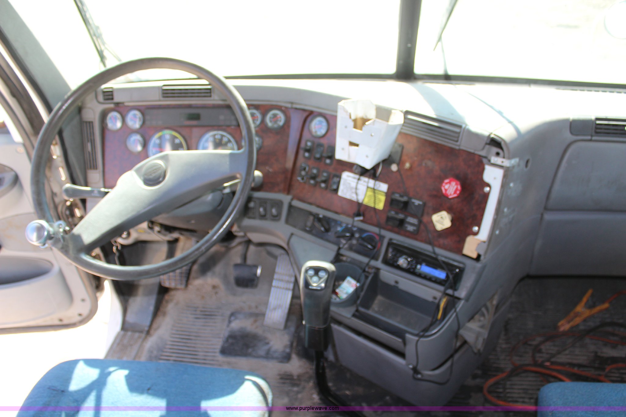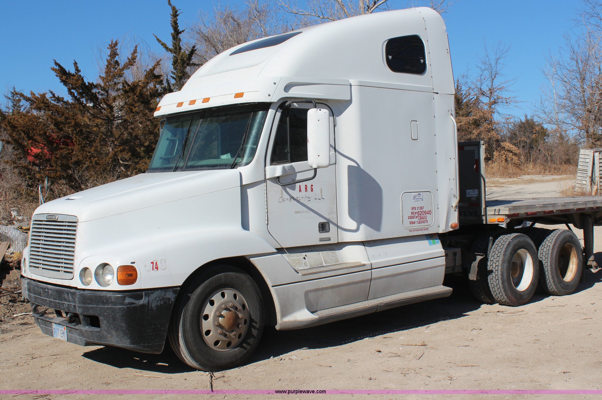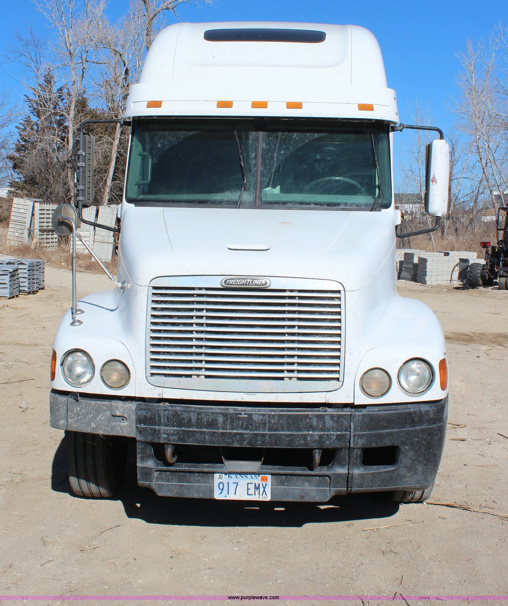 Purple Wave is selling a used Truck Tractor in Kansas. This item is a 2001 Freightliner C120 semi truck with the following: 914,230 miles on odometer, Detroit Diesel Series 60 12.7L L6 diesel engine, Meritor 10 speed manual transmission, Twin screw, AC and heat, Cruise, AM/FM/CD, Air suspension seat, Passenger daylight door, Power windows and mirrors, Heated mirrors, 60" sleeper, Storage, Visor, Dual 100 gallon fuel tanks, Single rear exhaust stack, Aluminum deck plate, Dump valves, Air suspension, Air brakes, Jake brake, 295/75R22.5 tires, GVWR 52,000 lbs, FAWR 12,000 lbs, IAWR 20,000 lbs, RAWR 20,000 lbs