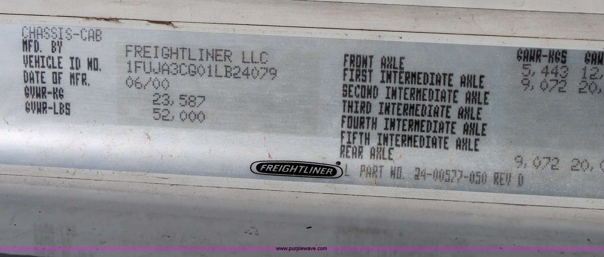 2001 Freightliner C120 semi truck. 914,230 miles on odometer, Detroit Diesel Series 60 12.7L L6 diesel engine, Meritor 10 speed manual transmission, Twin screw , AC and heat, Cruise, AM/FM/CD, Air suspension seat, Passenger daylight door, Power windows and mirrors, Heated mirrors, 60" sleeper Storage, Visor, Dual 100 gallon fuel tanks, Single rear exhaust stack, Aluminum deck plate, Dump valves, Air suspension, Air brakes, Jake brake, 295/75R22.5 tires, GVWR 52,000 lbs, FAWR 12,000 lbs, IAWR 20,000 lbs, RAWR 20,000 lbs. 1FUJA3CG01LB24079. Lenexa, KS 66227