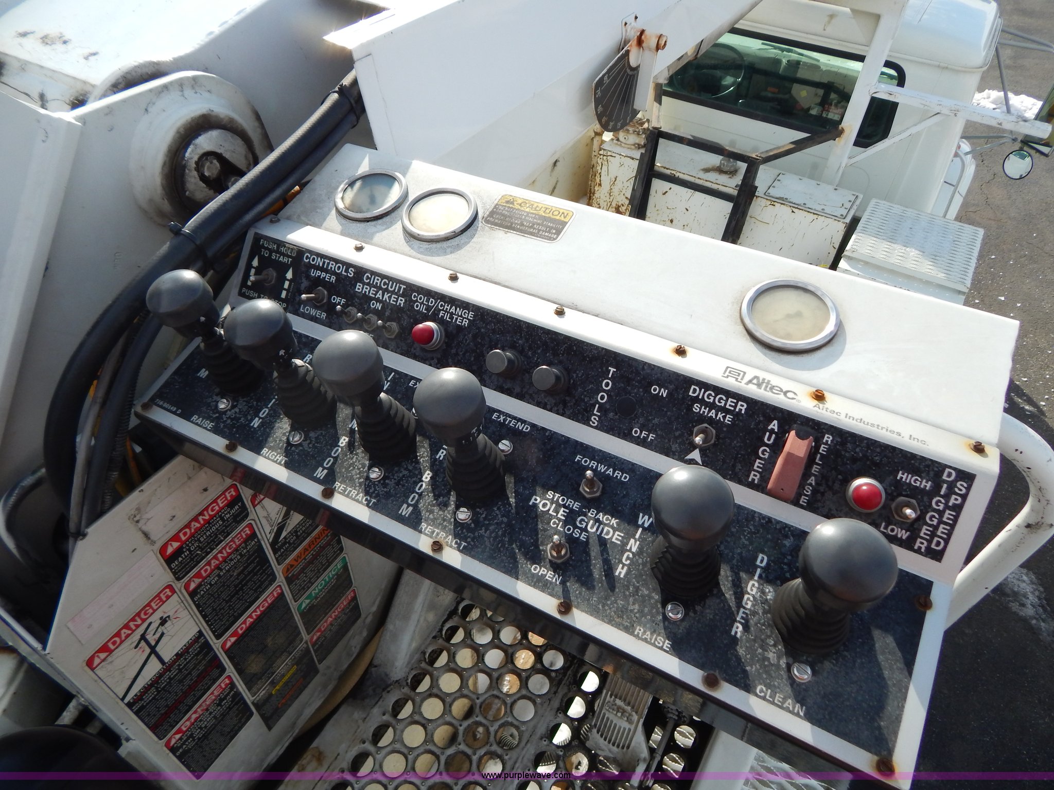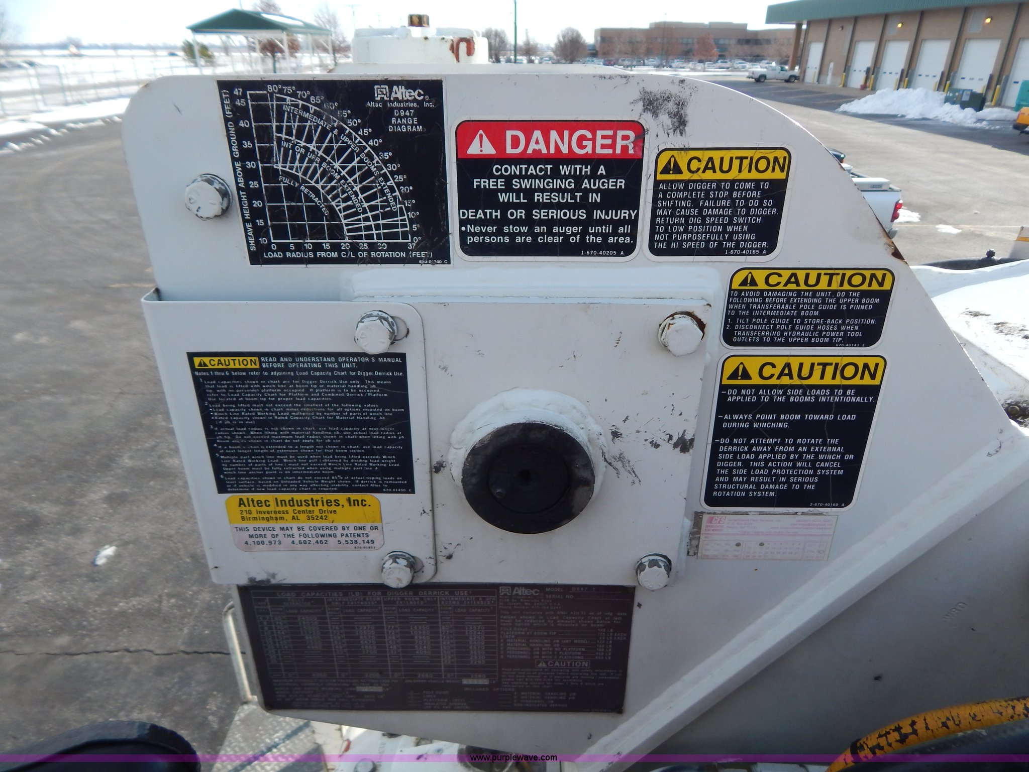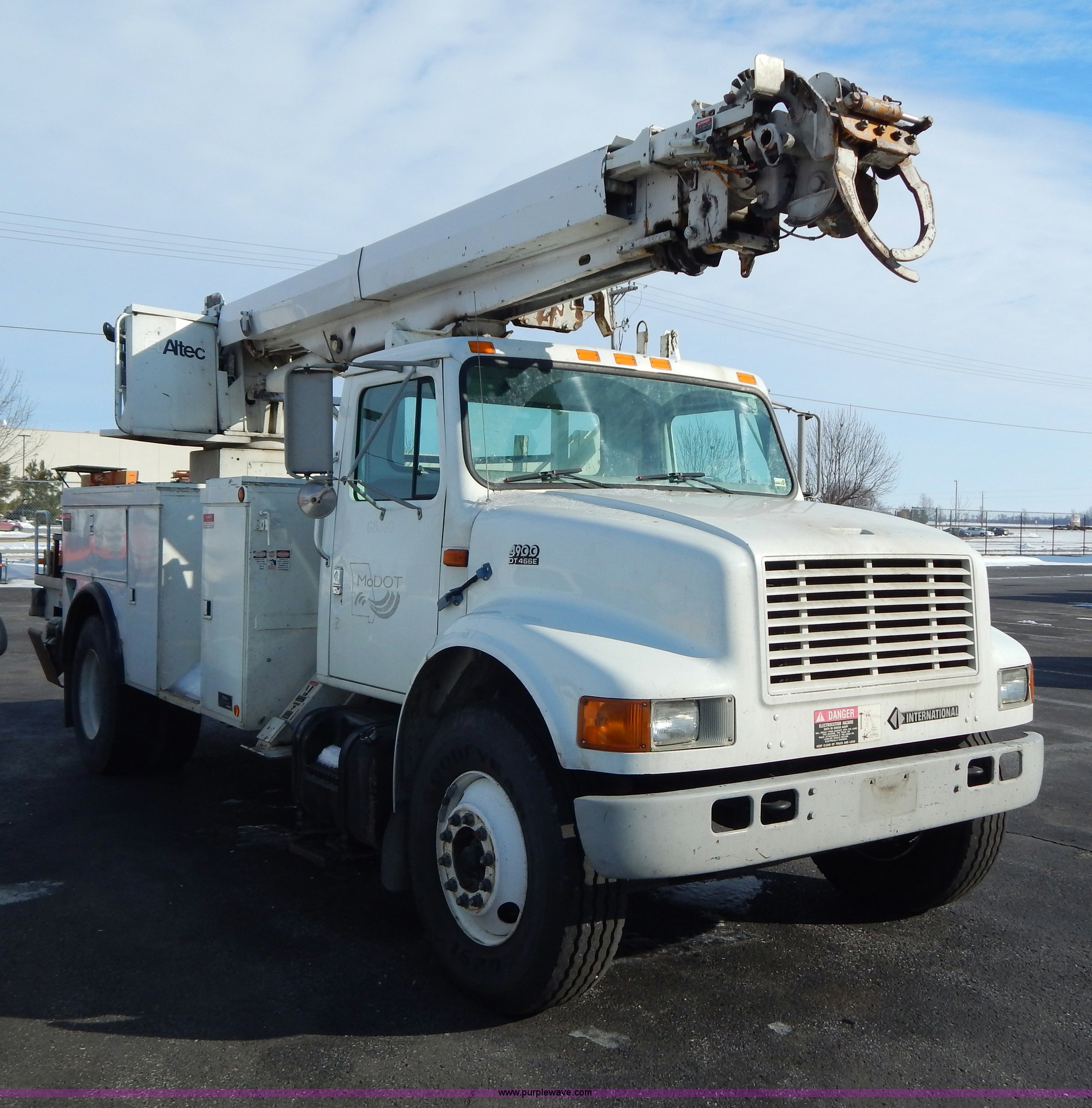 Purple Wave is selling a used Digger Derrick Truck in Missouri. This item is a 2000 International 4900 digger derrick truck with the following: 231,850 miles on odometer, International DT466E 7.6L L6 diesel engine, Manual six speed transmission, Heat, AM/FM, Manual windows and locks, Vinyl interior, Altec derrick digger bed, Serial 37-69041, Altec D947T derrick digger, Serial 11913A2035, PTO, (4) hydraulic outriggers, Pintle hitch, Air brakes, Rear air brake lines for trailer, 188" wheelbase, 315/80R22.5 front tires, 11R22.5 rear tires, Auger mount is broken, MoDOT ID G8689