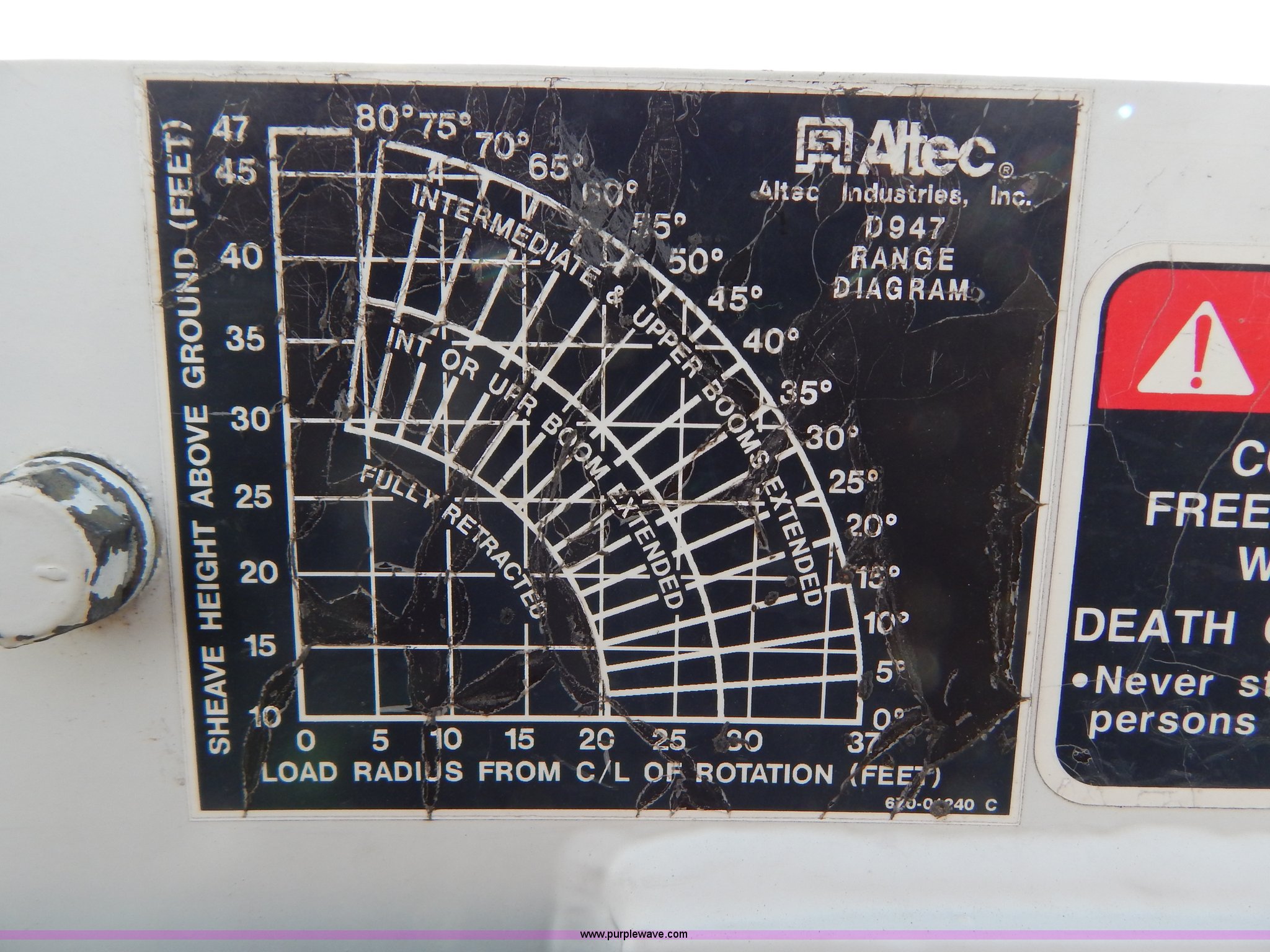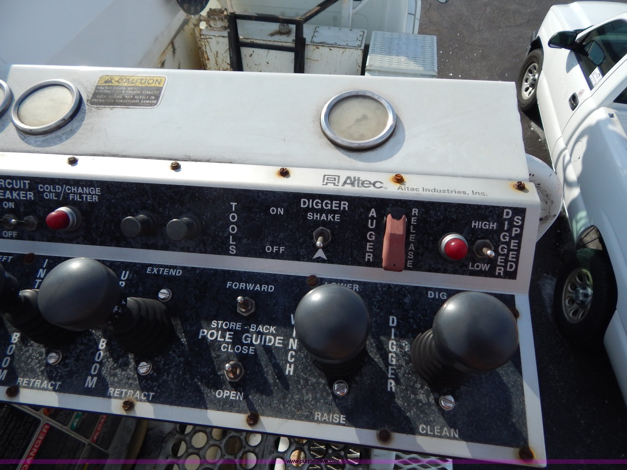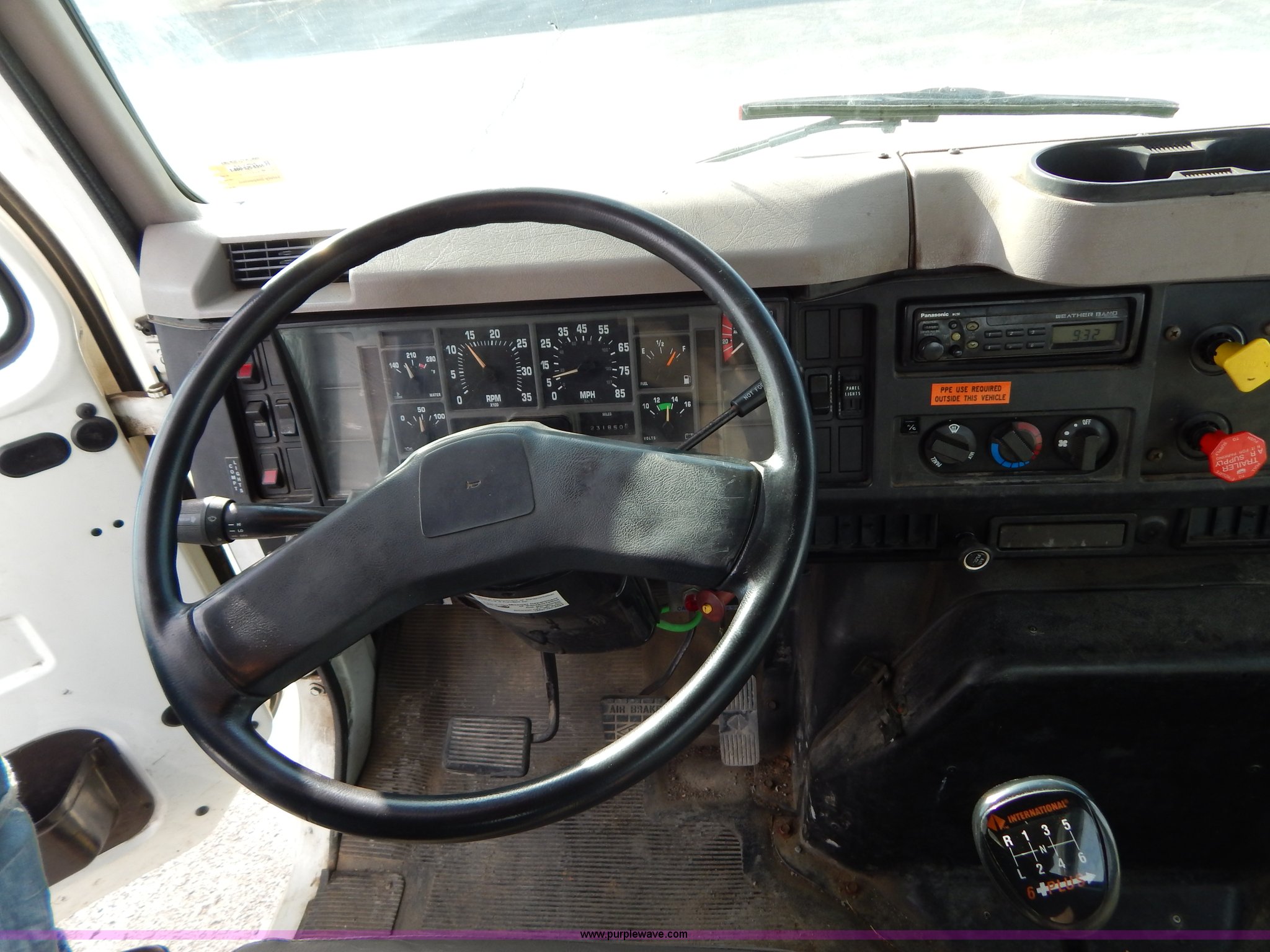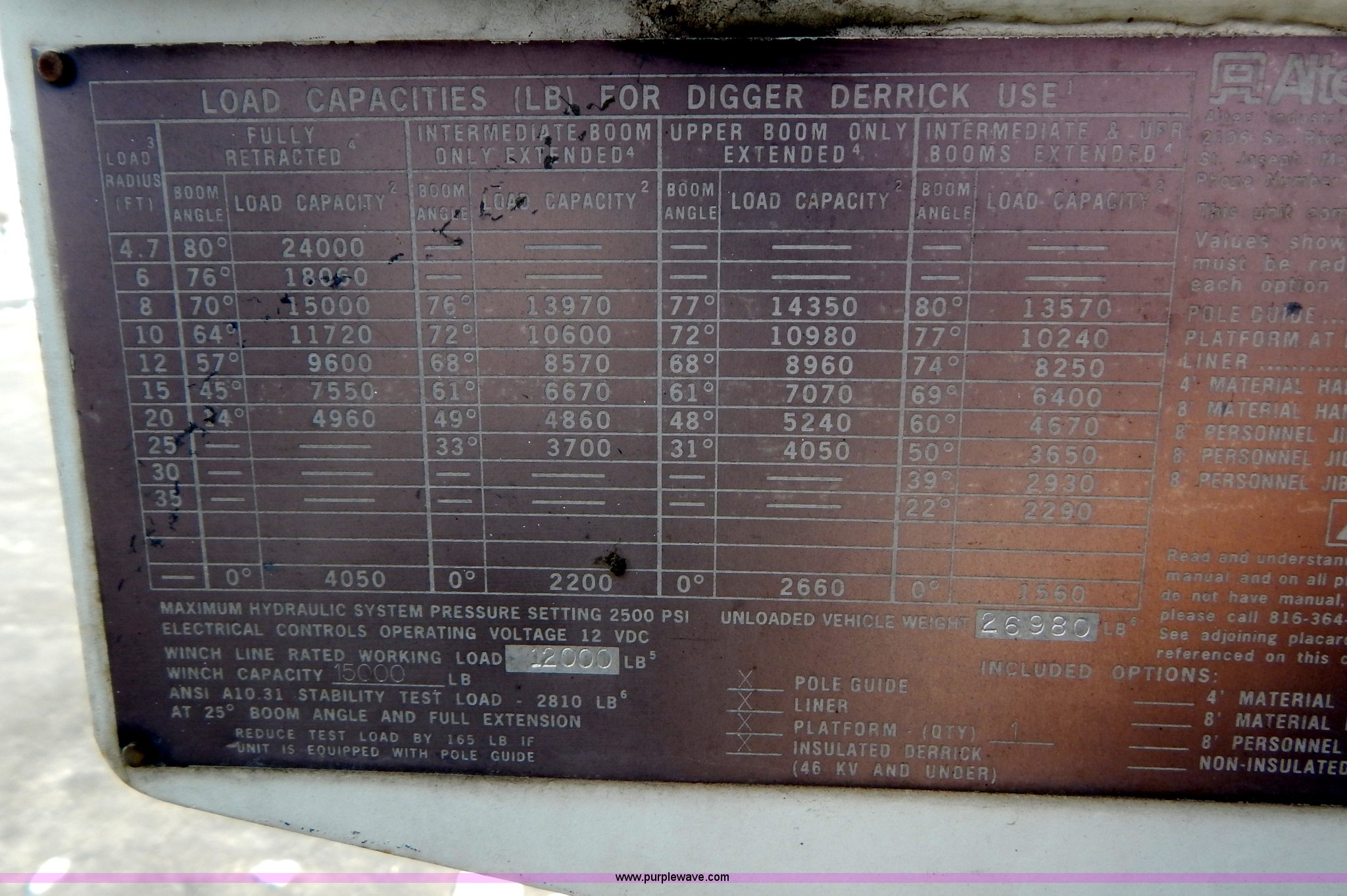 Purple Wave is selling a used Digger Derrick Truck in Missouri. This item is a 2000 International 4900 digger derrick truck with the following: 231,850 miles on odometer, International DT466E 7.6L L6 diesel engine, Manual six speed transmission, Heat, AM/FM, Manual windows and locks, Vinyl interior, Altec derrick digger bed, Serial 37-69041, Altec D947T derrick digger, Serial 11913A2035, PTO, (4) hydraulic outriggers, Pintle hitch, Air brakes, Rear air brake lines for trailer, 188" wheelbase, 315/80R22.5 front tires, 11R22.5 rear tires, Auger mount is broken, MoDOT ID G8689