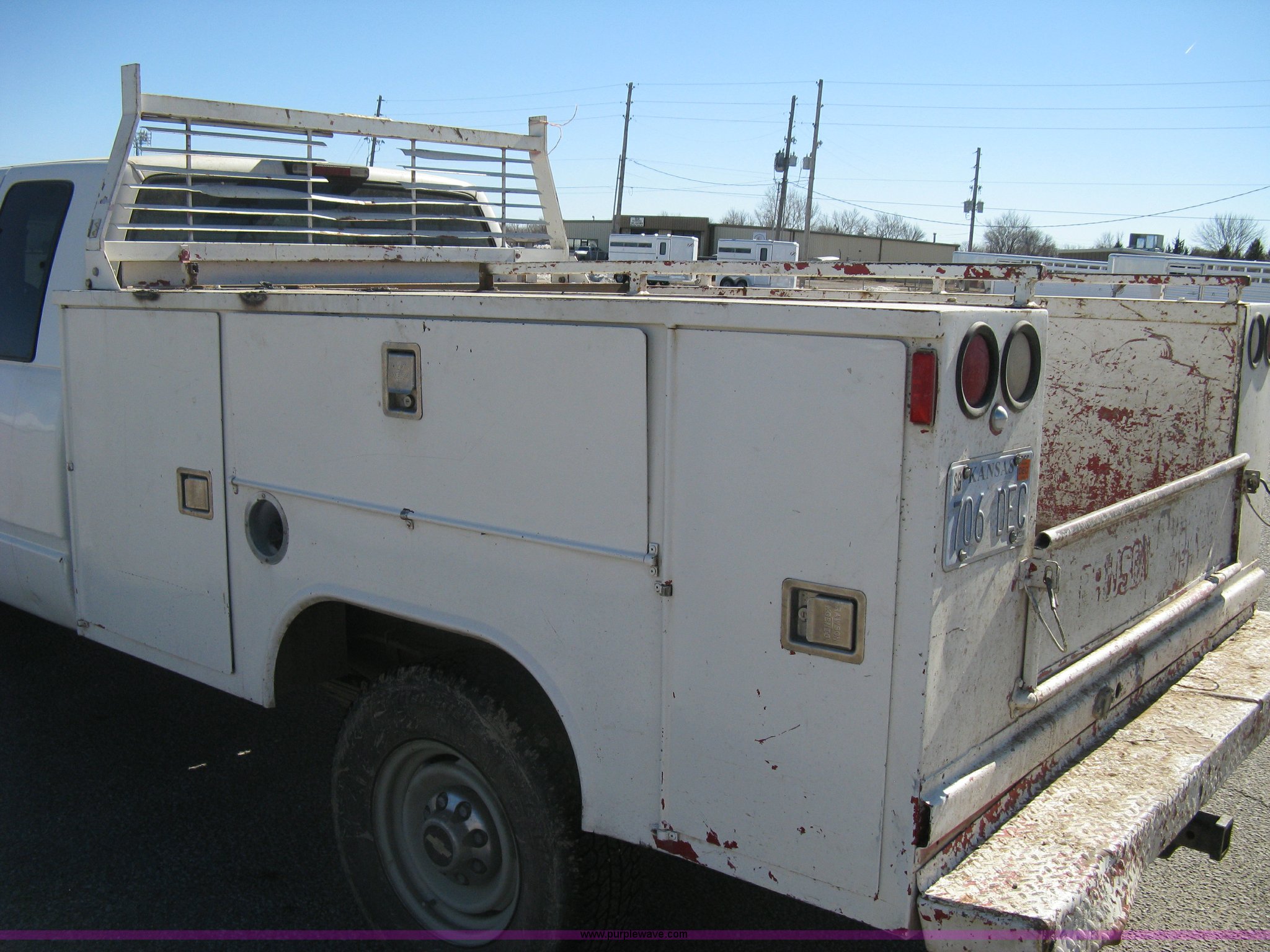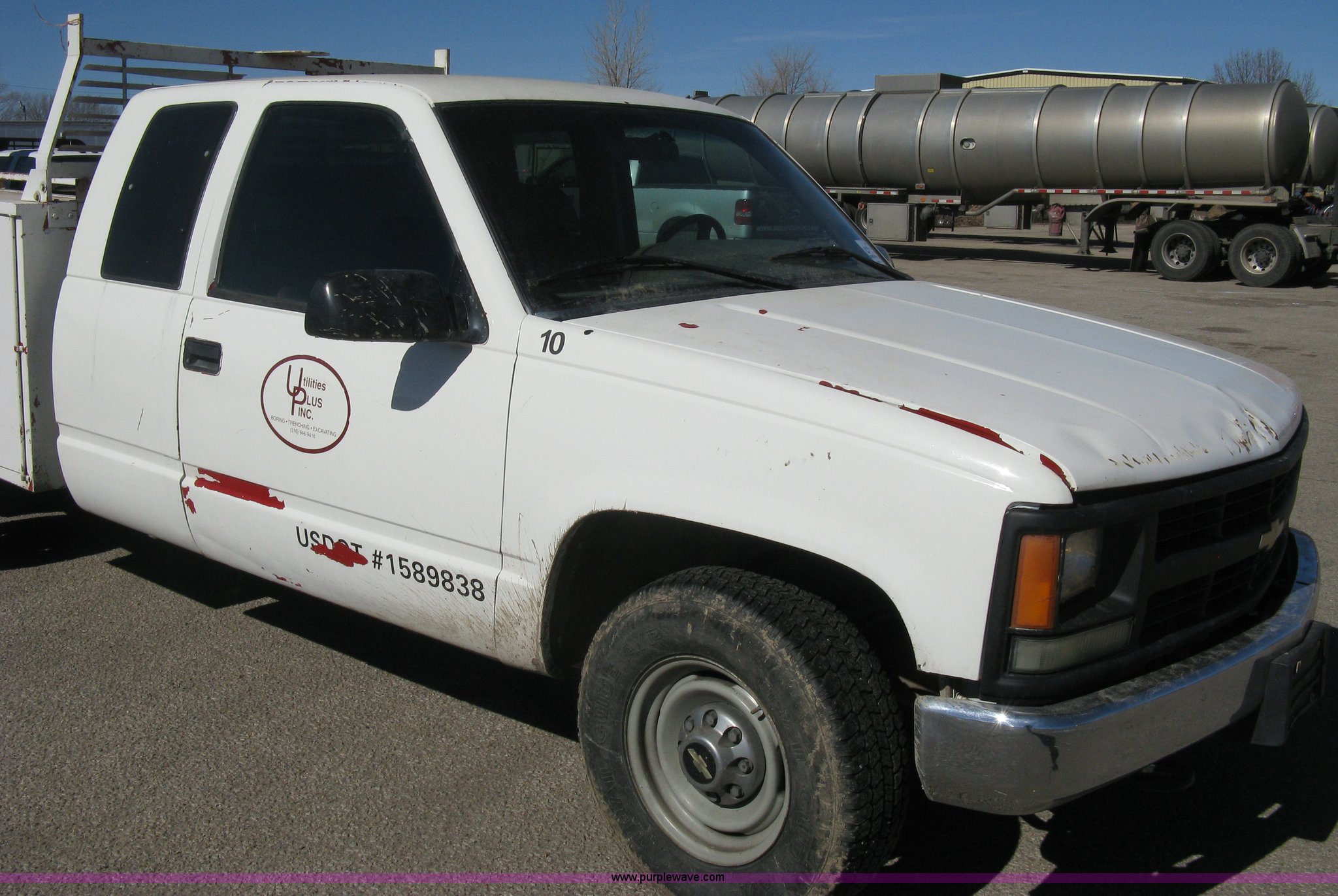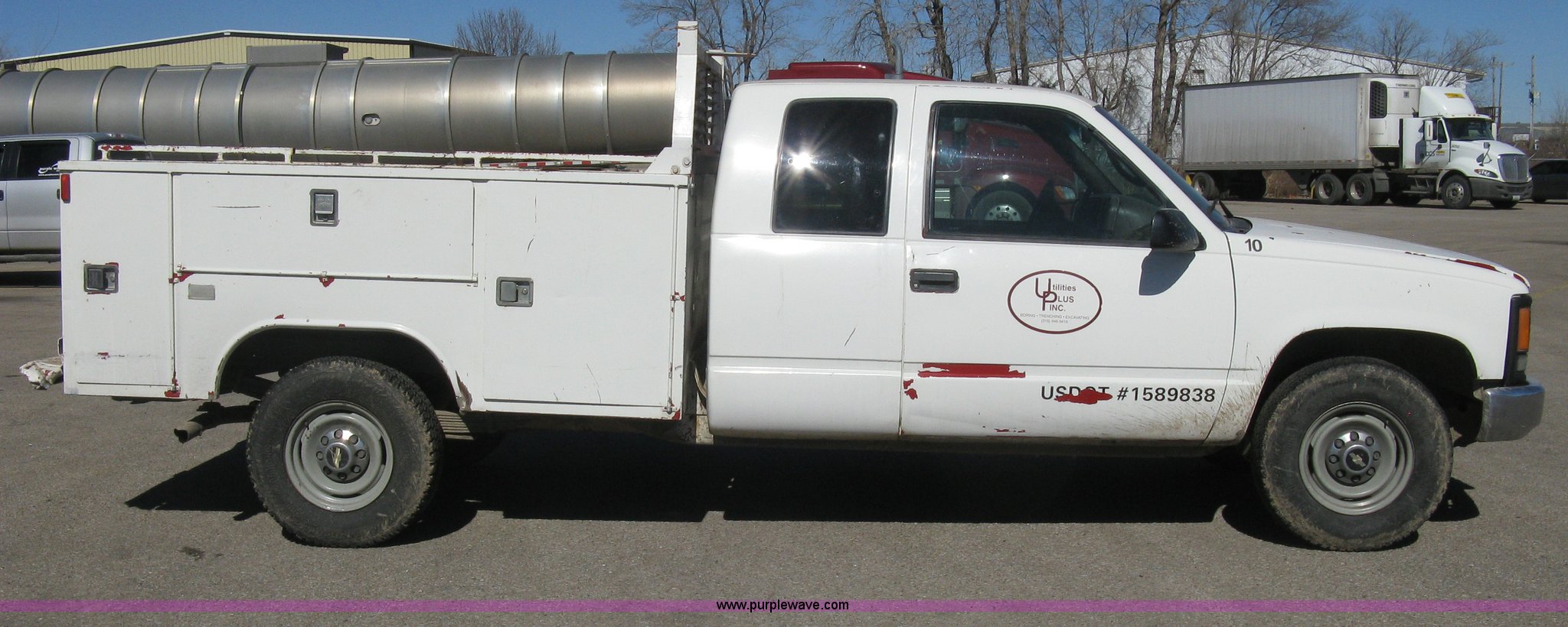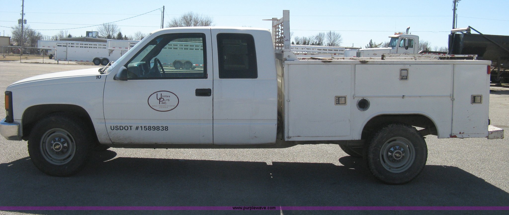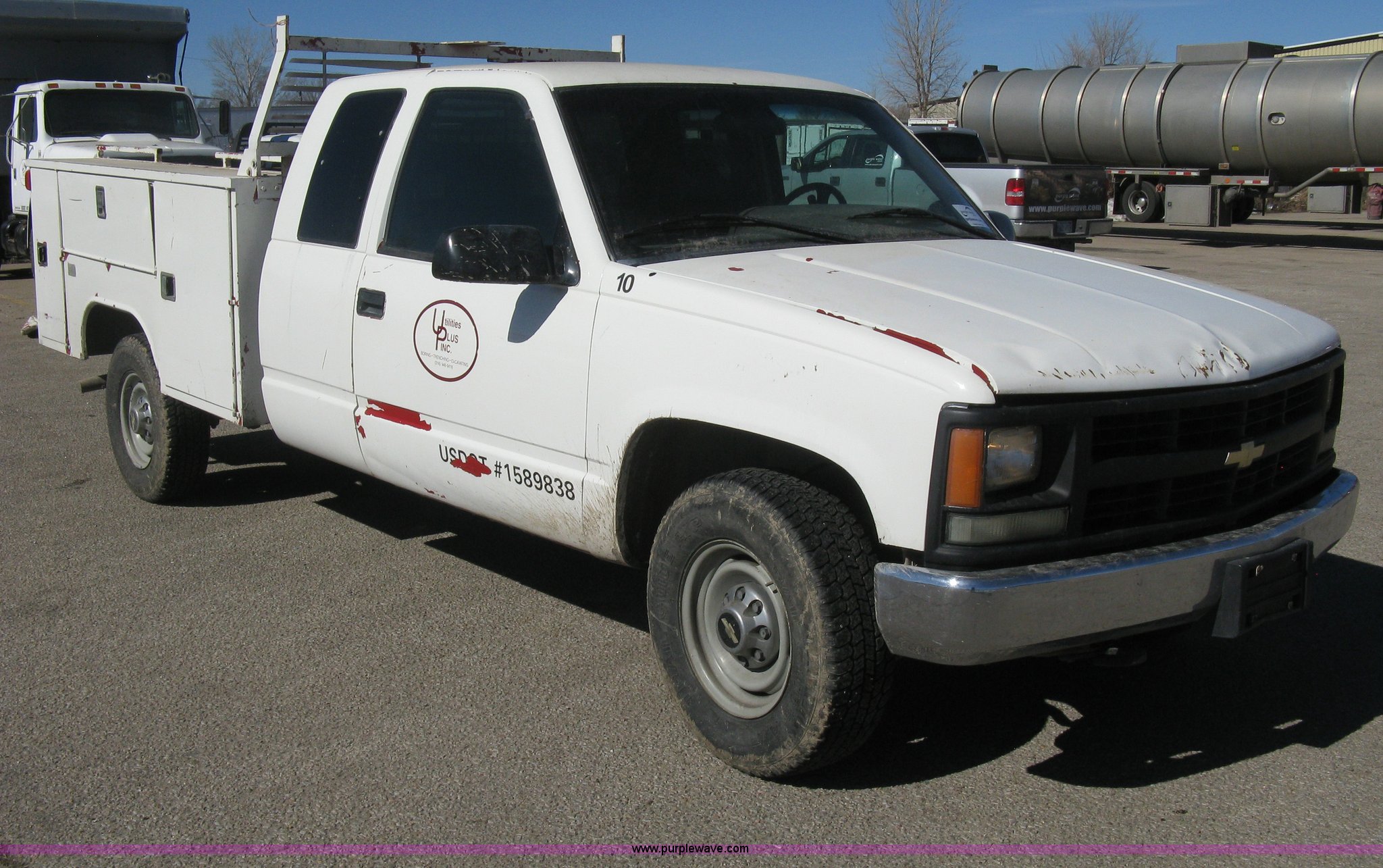 Purple Wave is selling a used Service Truck in Kansas. This item is a 1996 Chevrolet 2500 Ext. Cab utility truck with the following: 258,760 miles on odometer, 5.7L V8 OHV 16V gas engine, Automatic transmission, AC and heat, Tilt, Cruise, AM/FM/CD, Manual windows and locks, Cloth interior, Trailer brake controller, Rawson Koenig utility bed, 8'L x 78"W, Headache rack, Step-up bumper, Diamond plate floor, (6) side cabinets, Receiver hitch, Trailer wiring, LT245/75R16 tires, Windshield cracked, Interior/exterior cosmetic damage, Paint peeling, Unit# 10