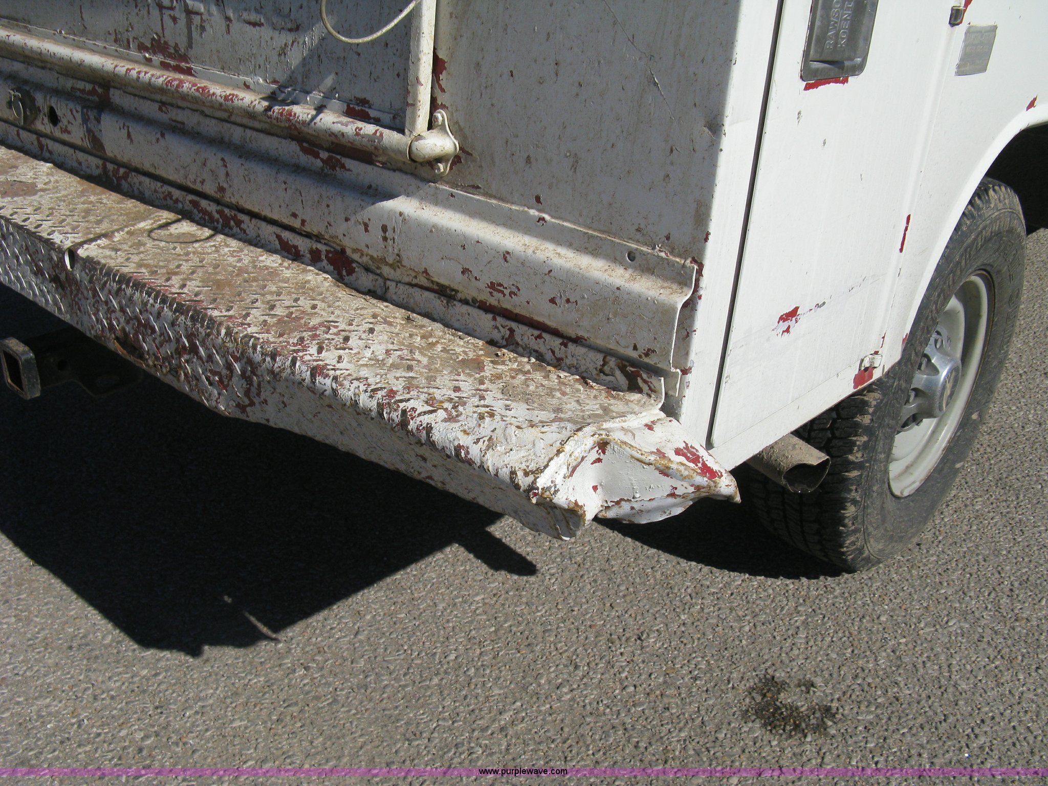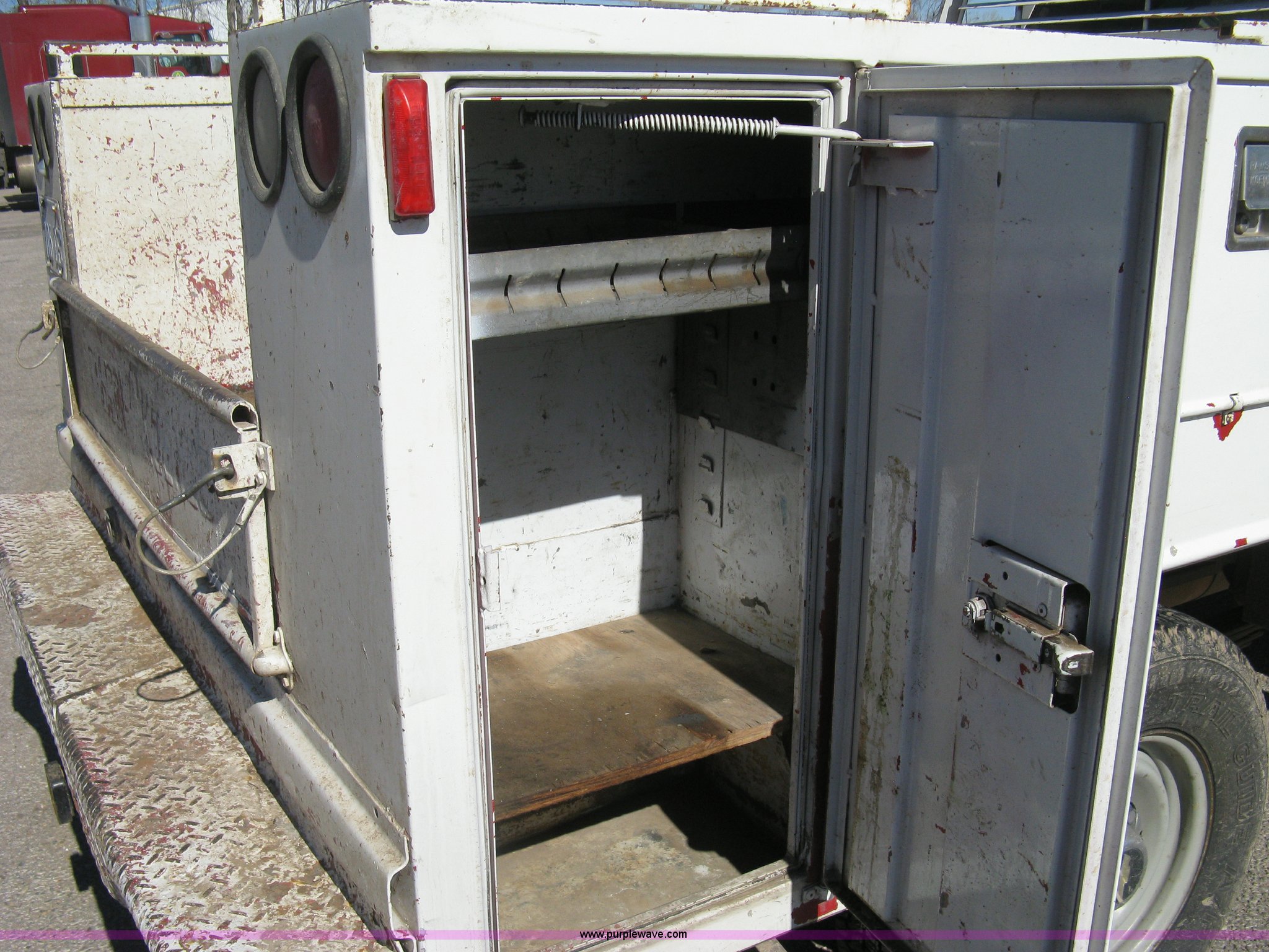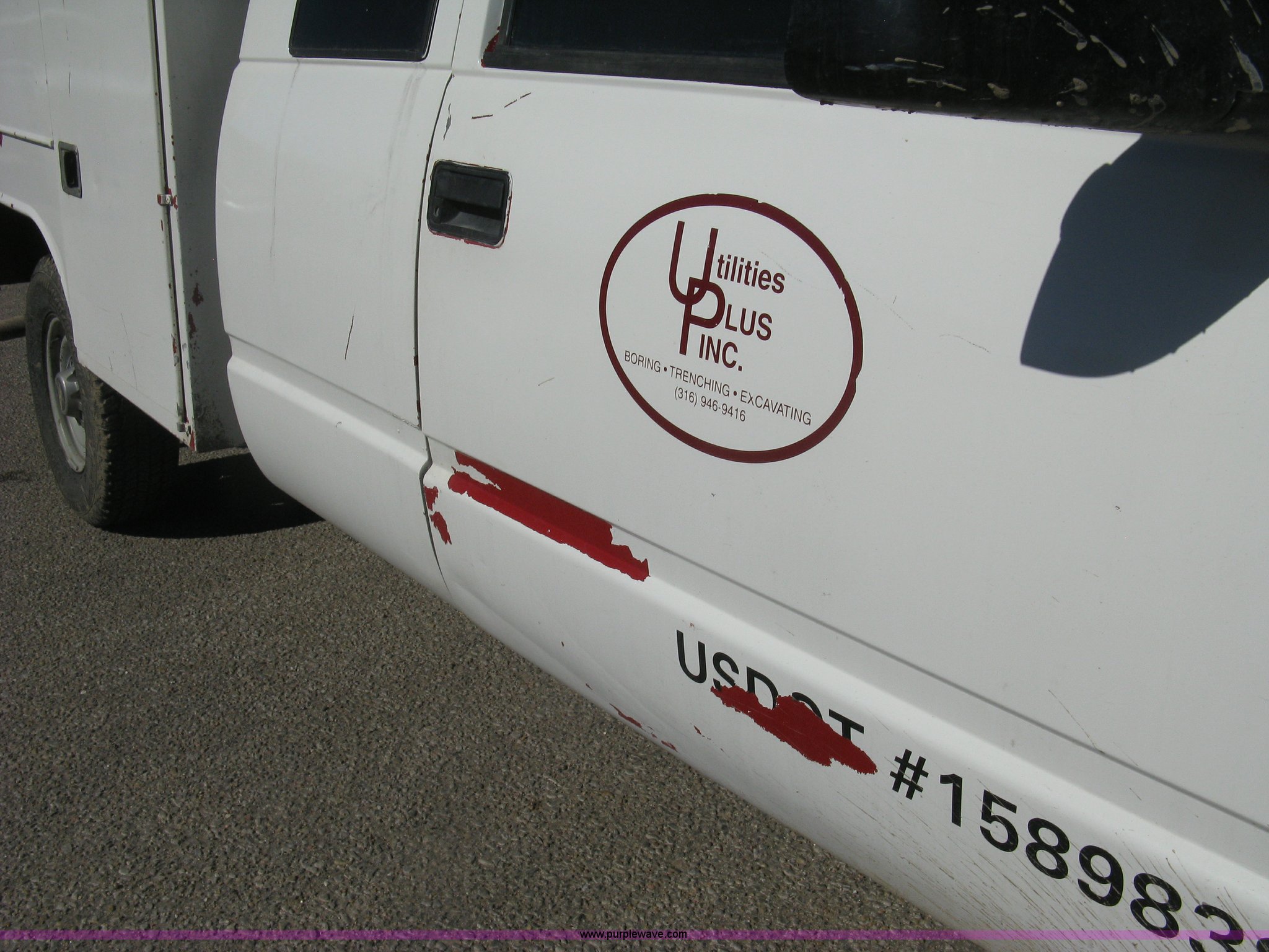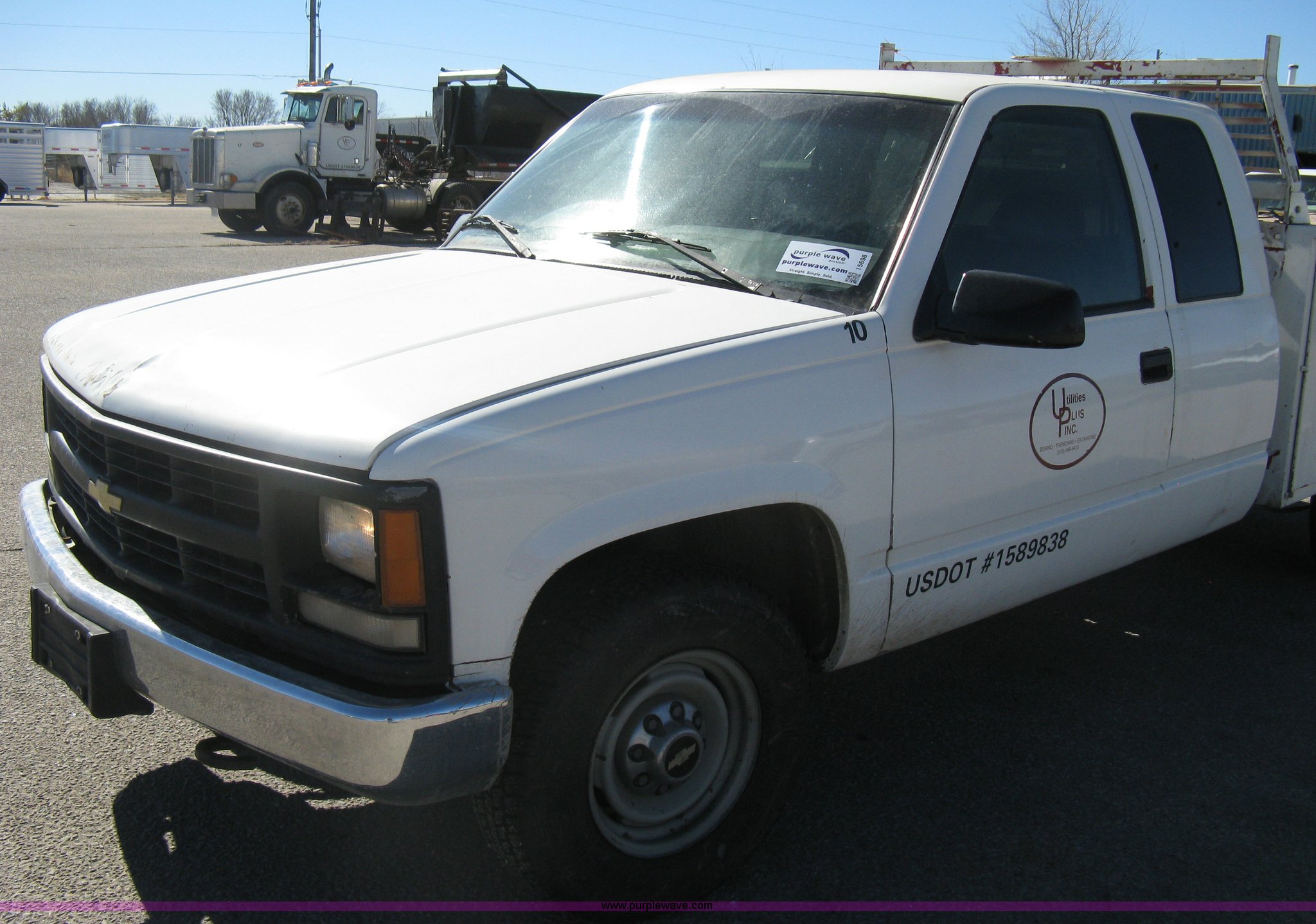 Purple Wave is selling a used Service Truck in Kansas. This item is a 1996 Chevrolet 2500 Ext. Cab utility truck with the following: 258,760 miles on odometer, 5.7L V8 OHV 16V gas engine, Automatic transmission, AC and heat, Tilt, Cruise, AM/FM/CD, Manual windows and locks, Cloth interior, Trailer brake controller, Rawson Koenig utility bed, 8'L x 78"W, Headache rack, Step-up bumper, Diamond plate floor, (6) side cabinets, Receiver hitch, Trailer wiring, LT245/75R16 tires, Windshield cracked, Interior/exterior cosmetic damage, Paint peeling, Unit# 10