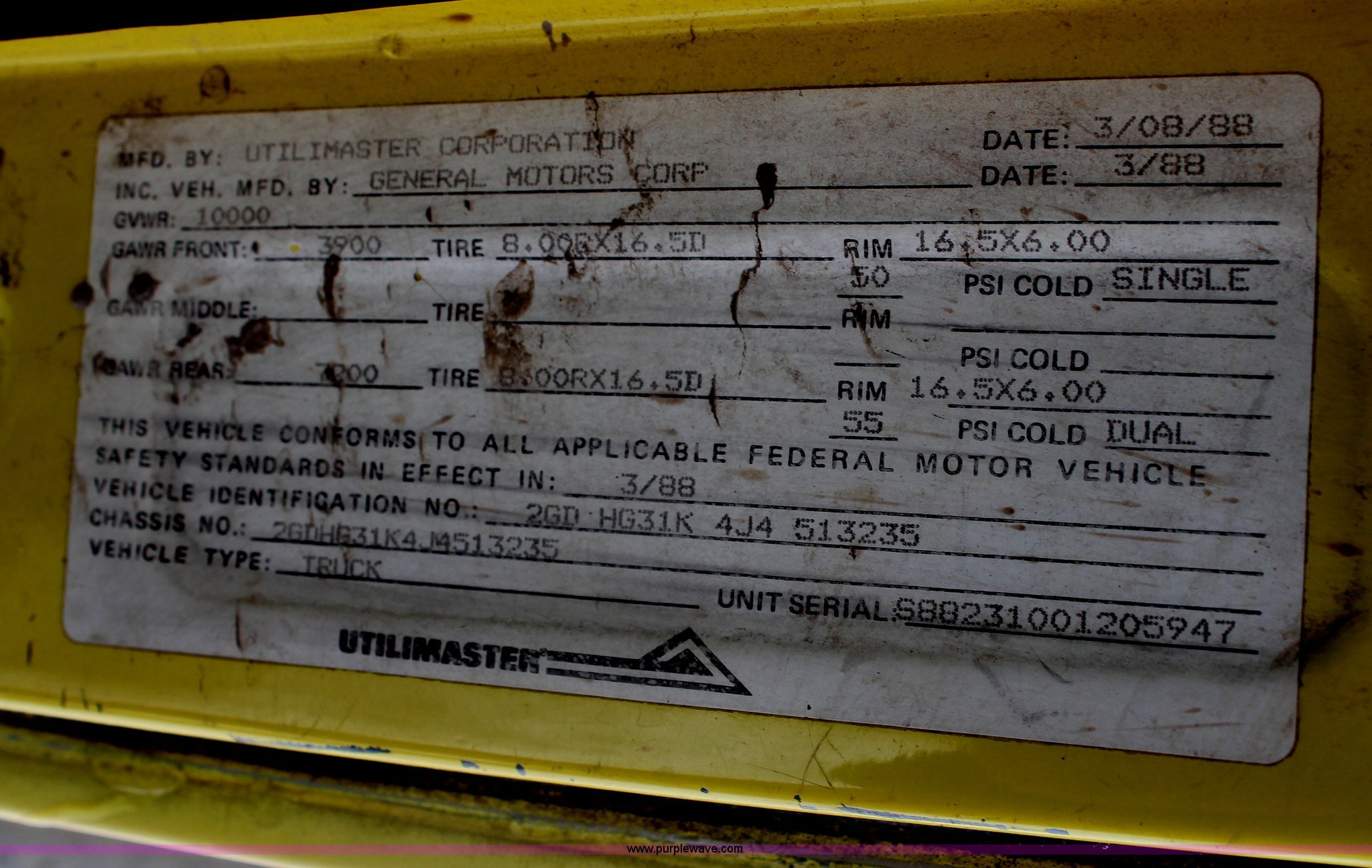 1988 GMC Vandura G3500 box truck. 87,926 miles on odometer, 5.7L V8 OHV 16V gas engine, Automatic transmission, Heat, Manual windows and locks, 12'L bed, Roll up door, 8.75R16.5 tires. 2GDHG31K4J4513235. Bayer Construction. 2315 N Jackson St. Junction City, KS 66441