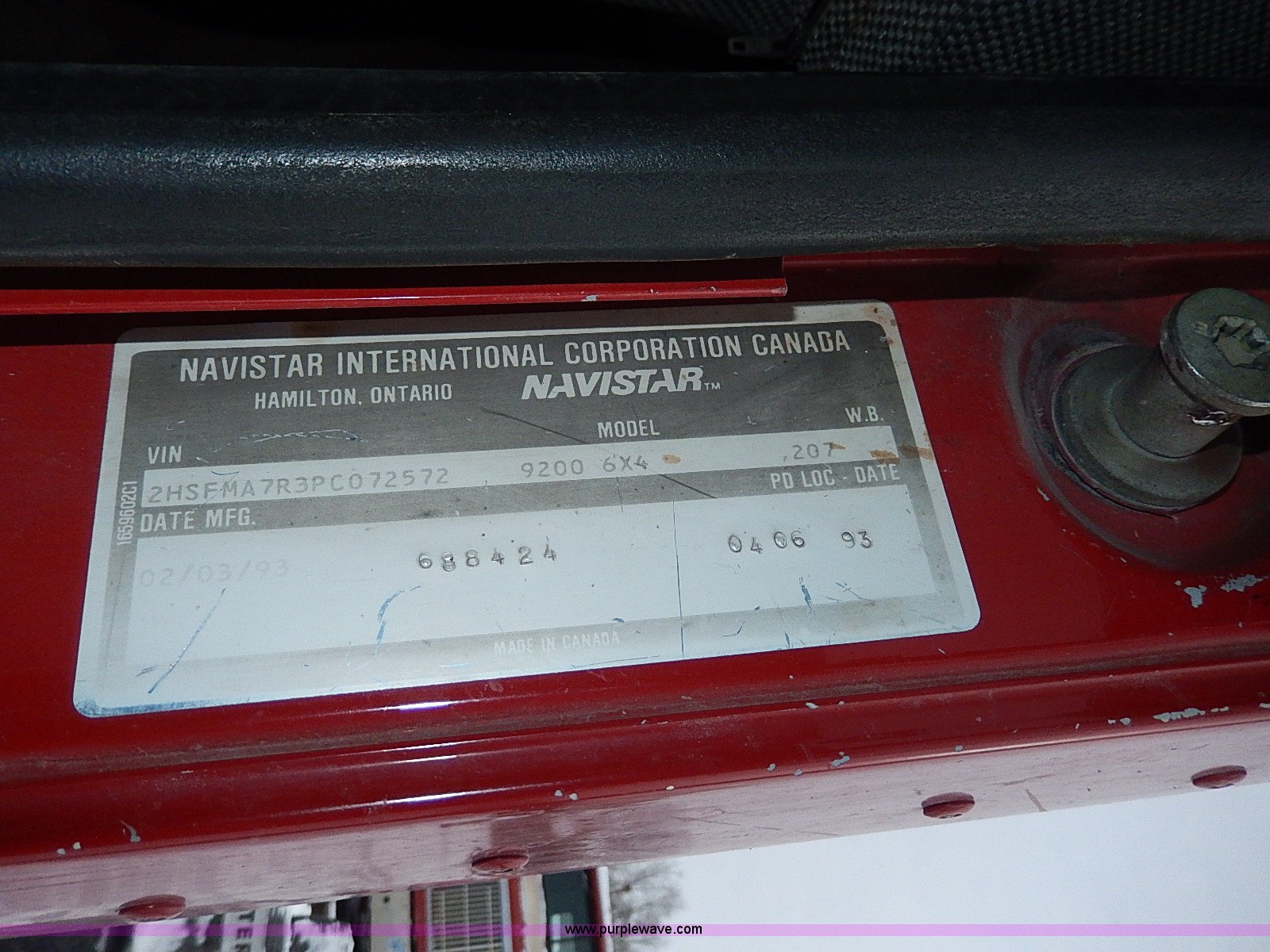 Purple Wave is selling a used Truck Tractor in Kansas. This item is a 1993 International 9200 semi truck with the following: 883,258 miles on odometer, Cummins L10-330B 10.0L L6 diesel engine, Eaton Fuller 10 speed manual transmission, Replaced clutch and rear main seal in October 2013, Twin screw, AC and heat, Cruise, AM/FM, Passenger daylight door, Air suspension seat, Visor, Chrome bumper, Block heater, Air slide fifth wheel, Dual 100 gallon fuel tanks, Single rear exhaust stack, Steel deck plate, PTO, Wet kit, Dump valves, Air suspension, Air brakes, Jake brake, 207" wheelbase, 11R22.5 tires, GVWR 52,000 lbs, FAWR 12,000 lbs, IAWR 20,000 lbs, RAWR 20,000 lbs, Unit# X130
