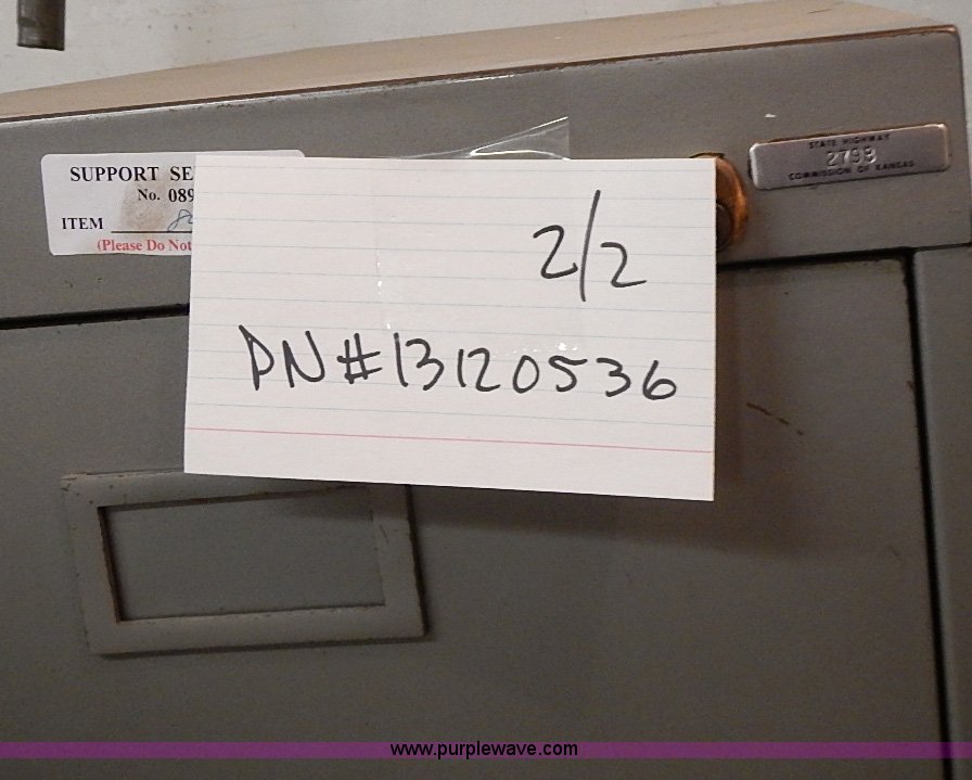 Purple Wave is selling a used Office Supplies and Equip. in Kansas. This item is a Assorted office furniture with the following: Metal mapping cabinet, (3) file cabinets, Three drawer, (2) file cabinets, Four drawer, Two drawer file cabinet, (2) metal storage cabinets, Locking, (3) wood stools, Metal legs, KDOT ID 13120514, 13120536, 13120538, 13120541, 13120543, 13120546