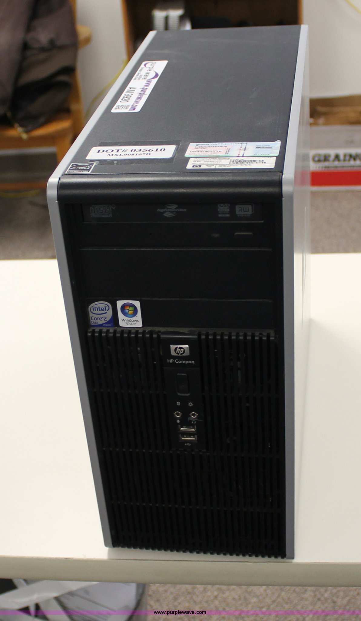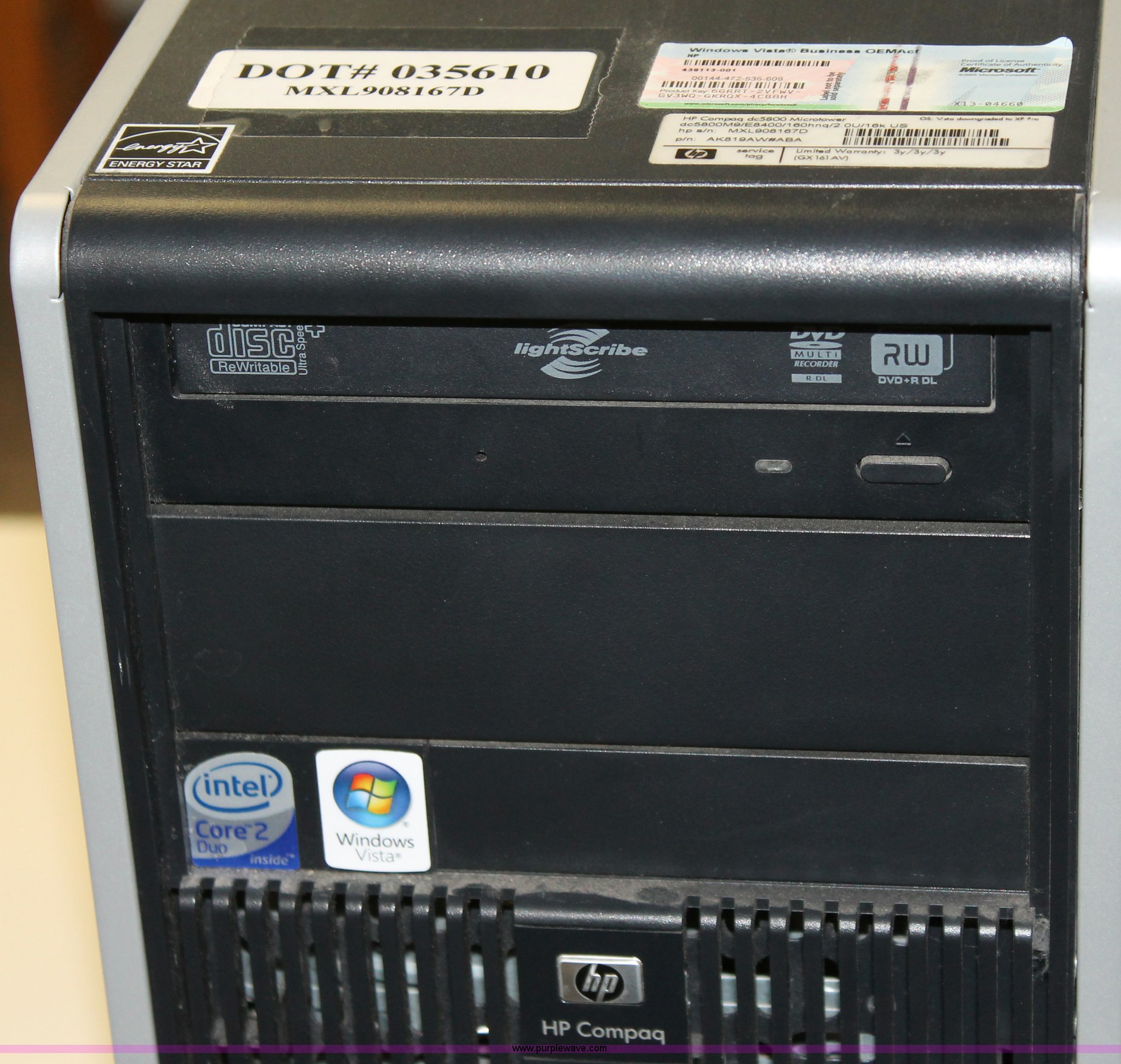 Purple Wave is selling a used Computers in Kansas. This item is a (5) 2009 HP DC5800 computers with the following: Intel Core 2 Duo E8400 processor, 3 GHz, 4 GB RAM, 80 GB RAM, Optical drive, Keyboard, Mouse, 19" LCD monitor, No operating system installed