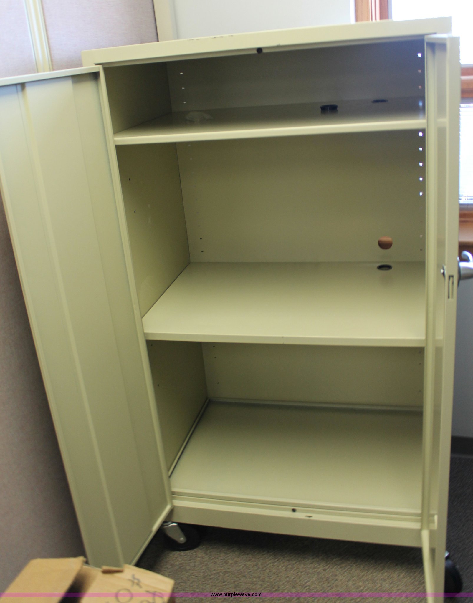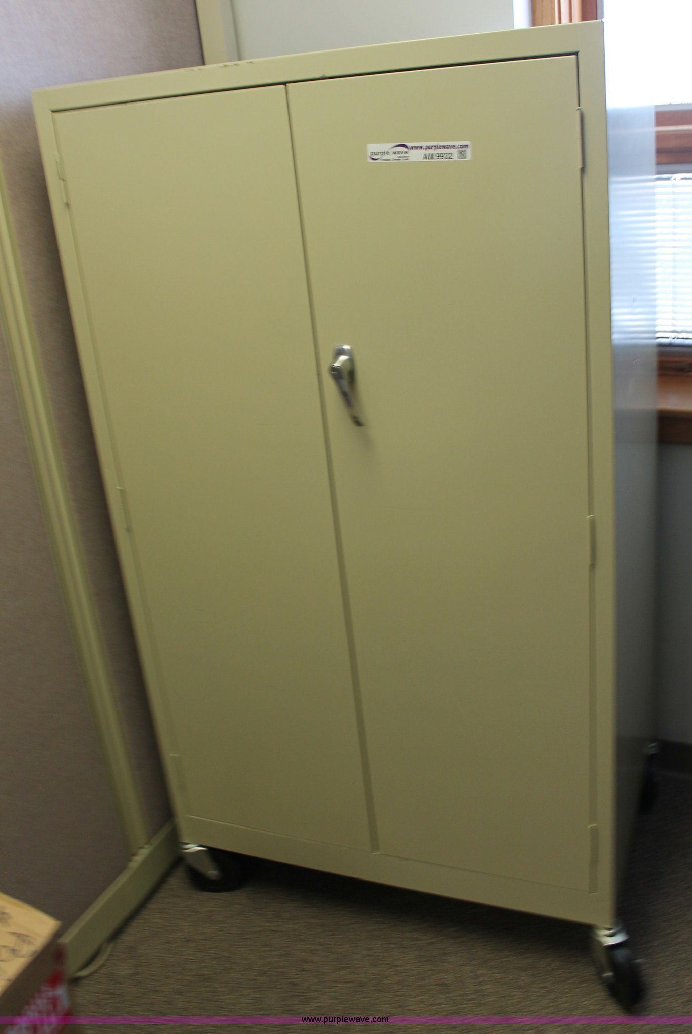 Purple Wave is selling a used Shelving and Storage in Kansas. This item is a Locking metal cabinet with the following: Casters, KDOT ID 2763000-19