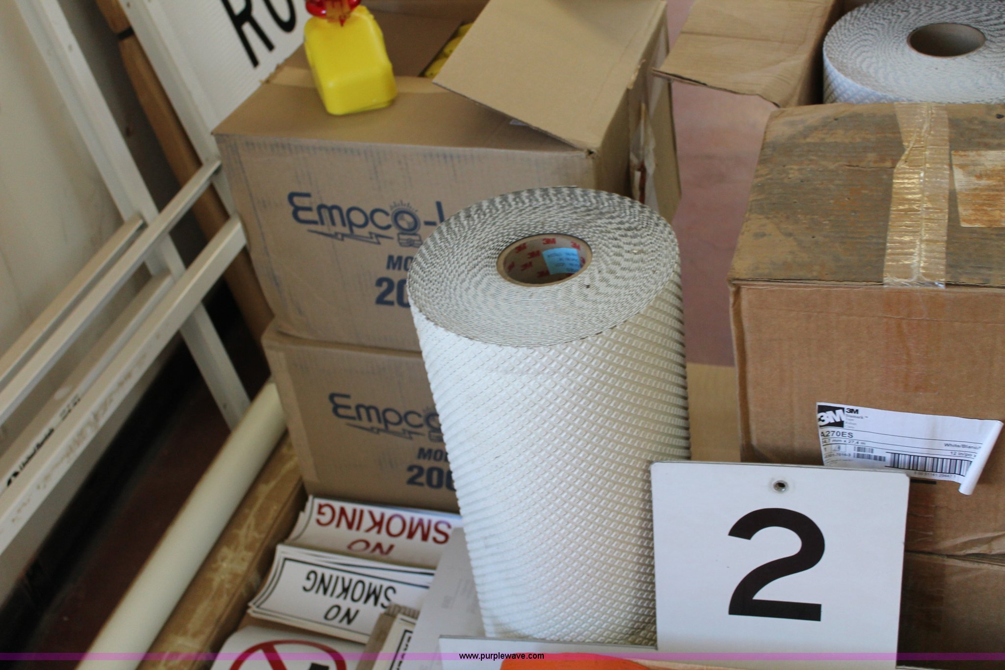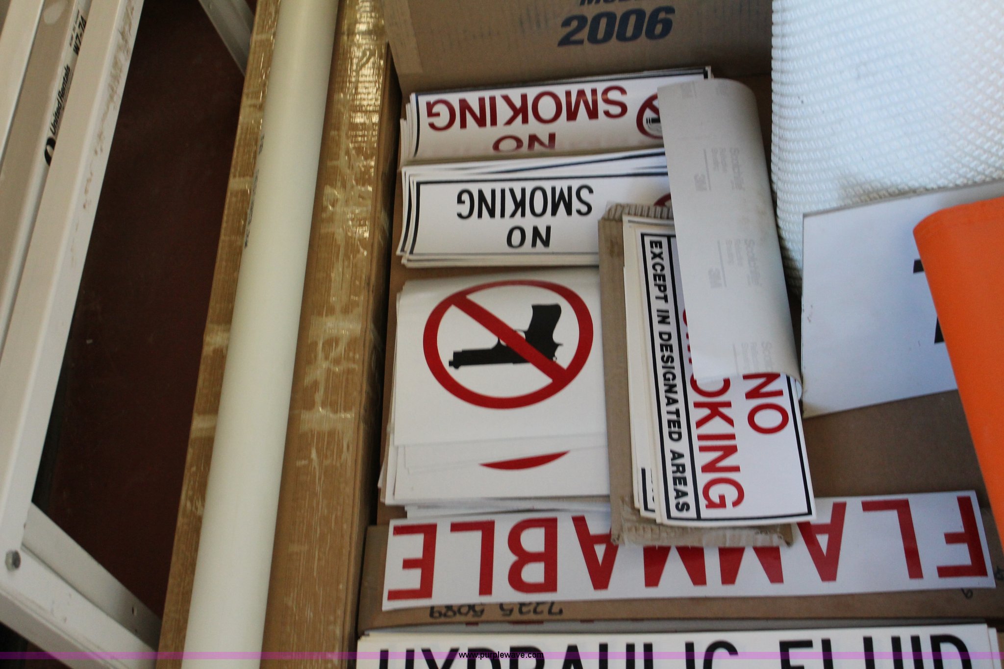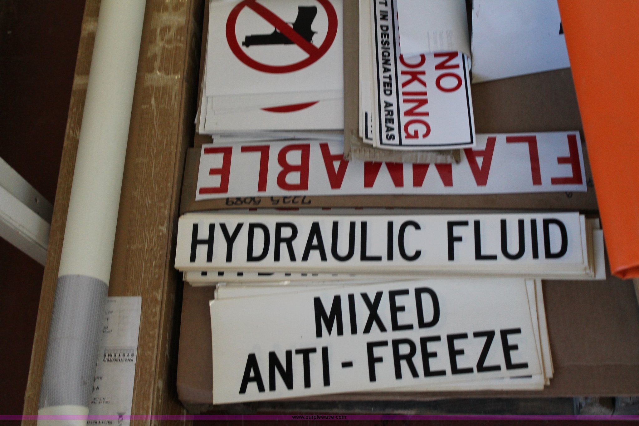 Purple Wave is selling a used Tools in Kansas. This item is a Assorted office and shop supplies with the following: 30" x 42" chevron, 2-2 track railroad signs, Tubular marker, Driveable base impact recovery system, 3M Starmark tape, 30 yards long, 12"W, 3M Starmark tape, 30 yards long, 24"W, (2) self standing barricade sign holders, (12) orange storage bags for full up signs, (4) road closed signs, (22) assorted antifreeze decals, (162) hydraulic fluid decals, (9) flammable decals, (4) no smoking in designated areas signs, (7) no firearms decals, (21) metal no firearm decals, (47) no smoking decals and more