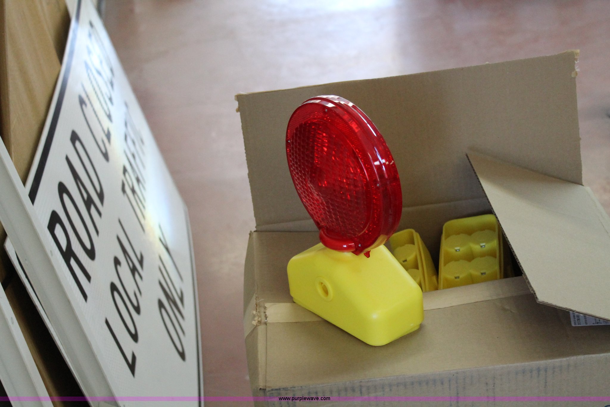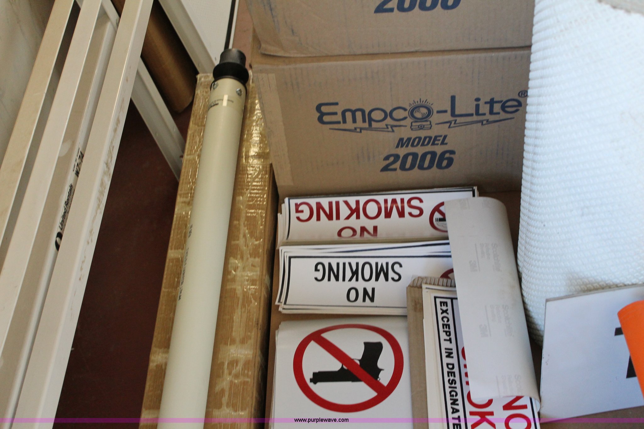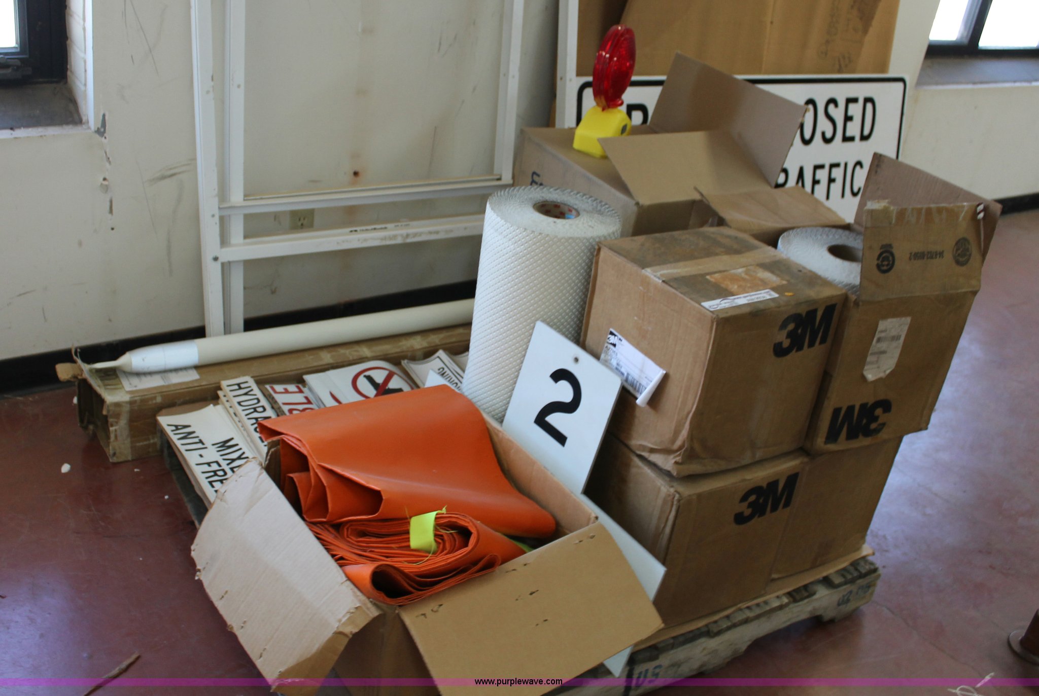 Purple Wave is selling a used Tools in Kansas. This item is a Assorted office and shop supplies with the following: 30" x 42" chevron, 2-2 track railroad signs, Tubular marker, Driveable base impact recovery system, 3M Starmark tape, 30 yards long, 12"W, 3M Starmark tape, 30 yards long, 24"W, (2) self standing barricade sign holders, (12) orange storage bags for full up signs, (4) road closed signs, (22) assorted antifreeze decals, (162) hydraulic fluid decals, (9) flammable decals, (4) no smoking in designated areas signs, (7) no firearms decals, (21) metal no firearm decals, (47) no smoking decals and more