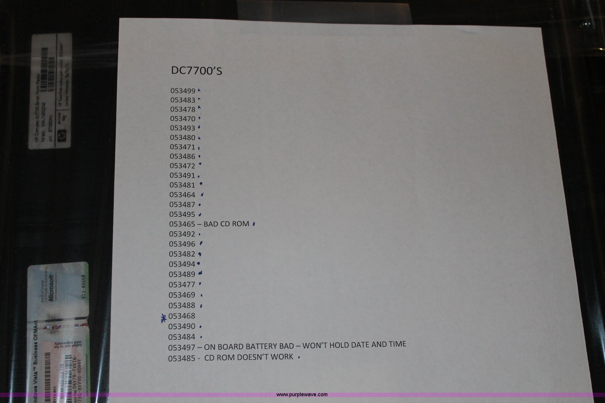 (29) HP DC7700 computers. Intel processor 1.86 GHz, 2 GB RAM, 160 GB hard drive, Optical drive , No operating system installed, Two with bad optical drives, One with bad on-board battery. View inventory for more information KDOT ID 053-464, 053-465, 053-469, 053-470, 053-471, 053-472, 053-477, 053-478, 053-479, 053-480, 053-481, 053-482, 053-483, 053-484, 053-485, 053-486, 053-487, 053-488, 053-489, 053-490,053-491, 053-492,053-493, 053-494,053-495, 053-496,053-497, 053-499,053-568. KDOT Hutchinson. 500 N Hendricks. Hutchinson, KS 67504