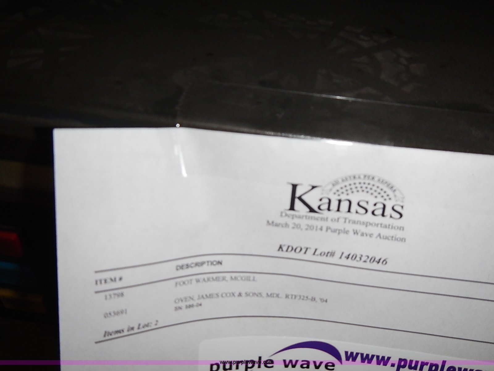Assorted restaurant equipment. James Cox & Sons RTF325-B oven Serial 586-04, Mcgill foot warmer. View inventory for more information KDOT ID 14032046. KDOT Topeka - Warehouse. 2035 SW Western. Topeka, KS 66604