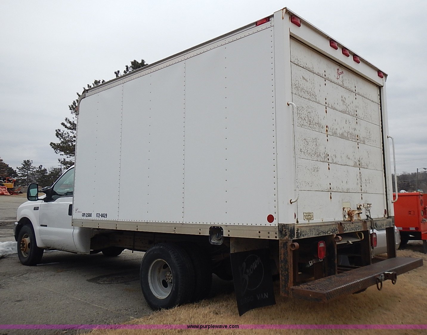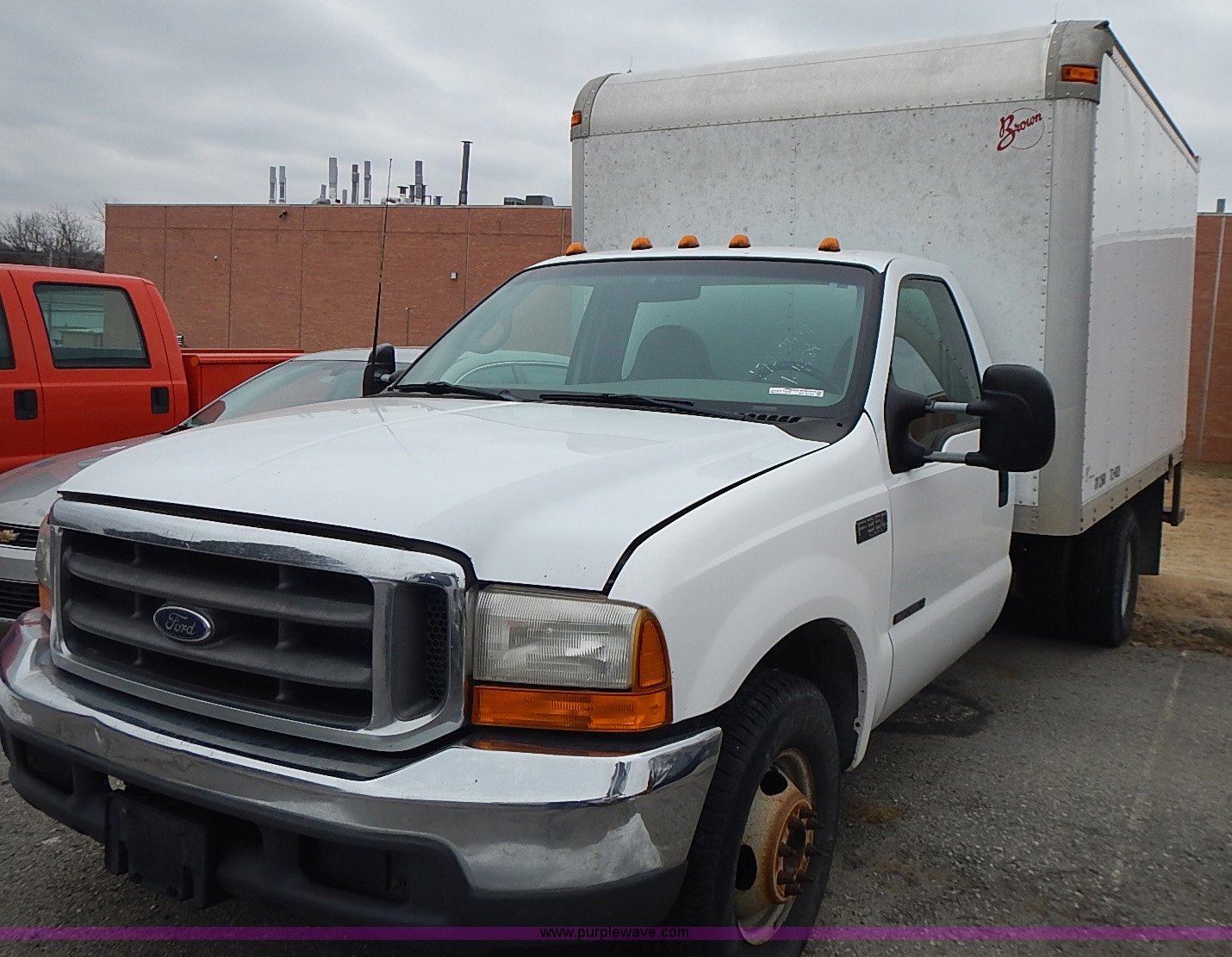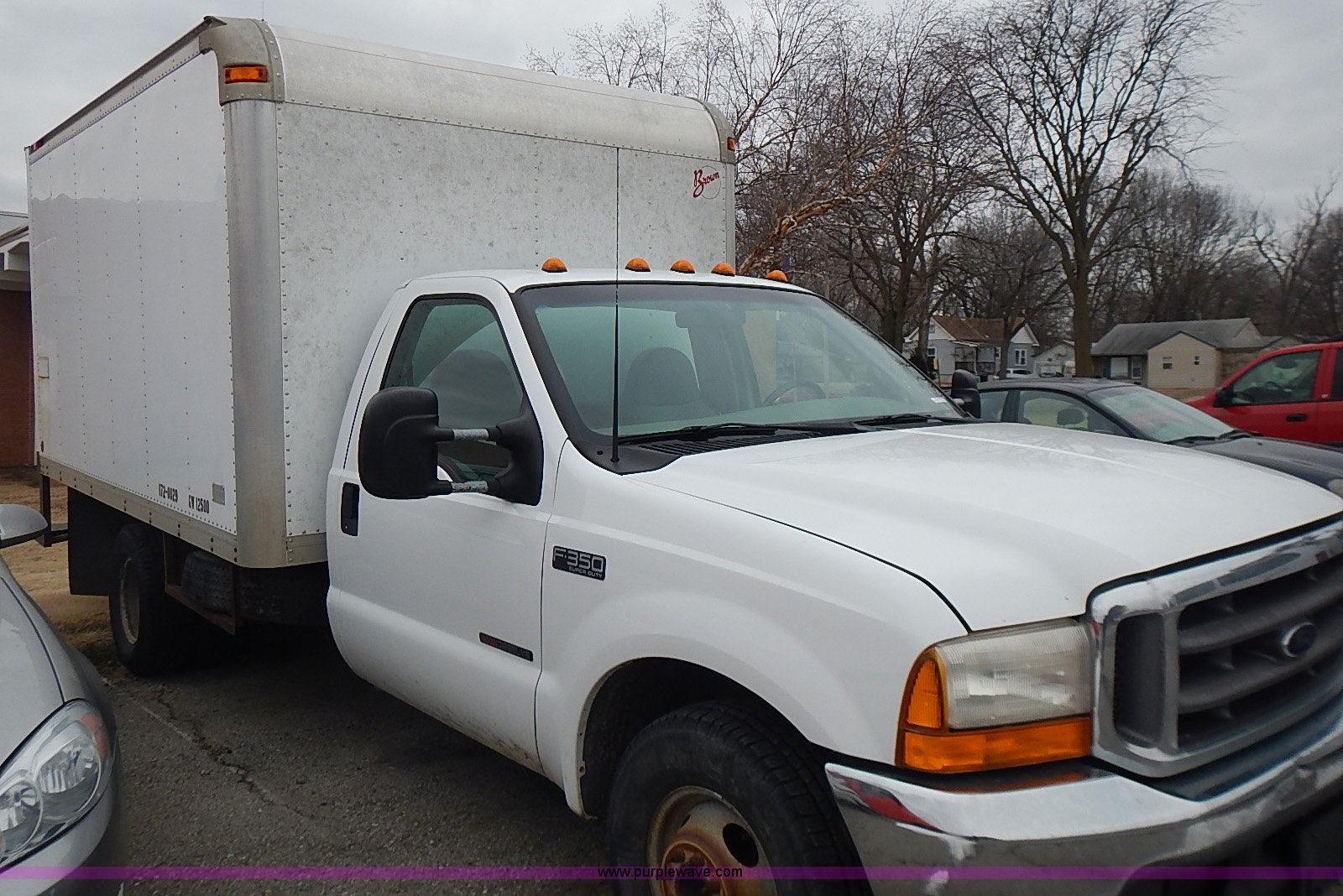 Purple Wave is selling a used Box Truck in Kansas. This item is a 1999 Ford F350 cargo box truck with the following: 300,970 miles on odometer, 7.3L V8 OHV 16V turbo diesel engine, Automatic transmission, AC and heat, Tilt, Cruise, AM/FM/cassette, Power windows and locks, Vinyl interior, 12'L cargo box, Receiver hitch, Trailer wiring, Ramp, 245/75R16 tires, Dents and scratches, Rear end issues, Weak battery, KDOT ID 172-0029