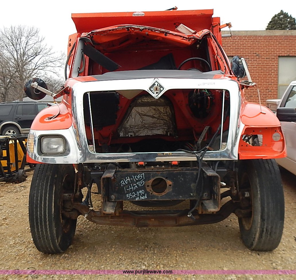 Purple Wave is selling a used Construction Dump Truck in Kansas. This item is a 2006 International 7400SFA dump truck with the following: Henderson salt spreader, 275/80R22.5 tires, 2010 National arrow board trailer, Wrecked, Non-operational, Serial 1N9AL1019AF272278, Vehicle has been rolled, Engine and transmission have been removed, Inside dual tires removed, One tire blown, Parts missing, KDOT ID 264-1057, 552-1190