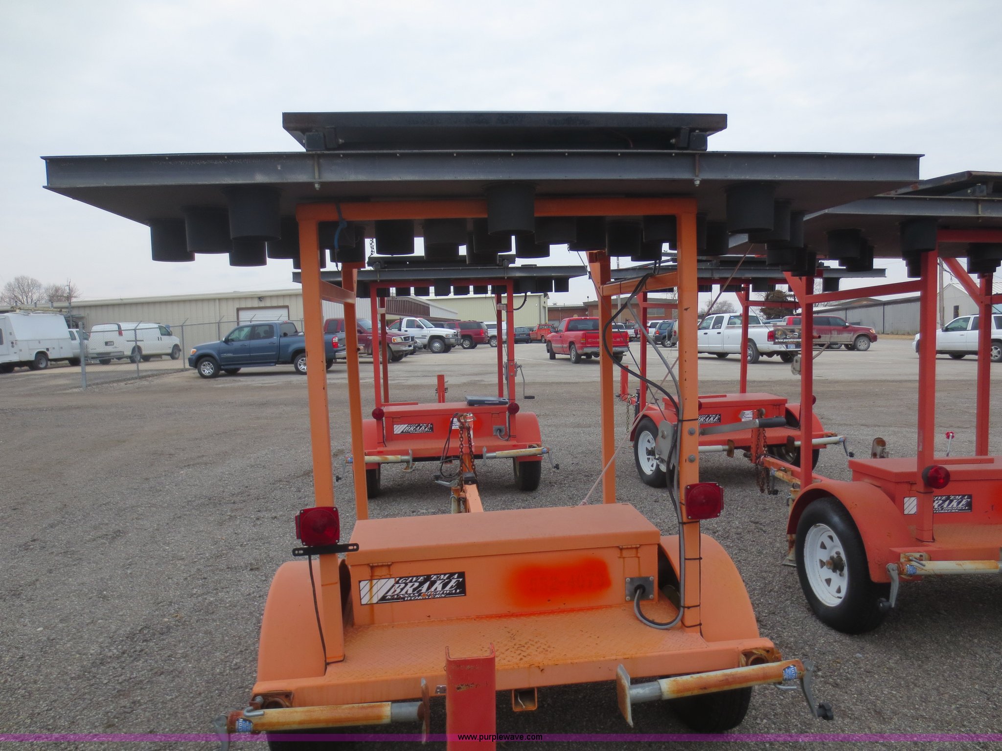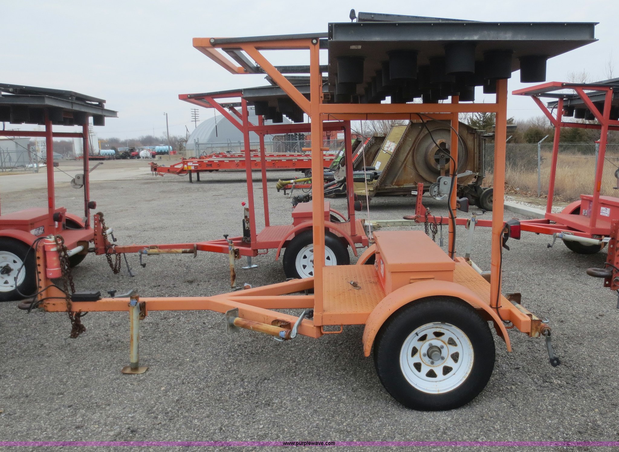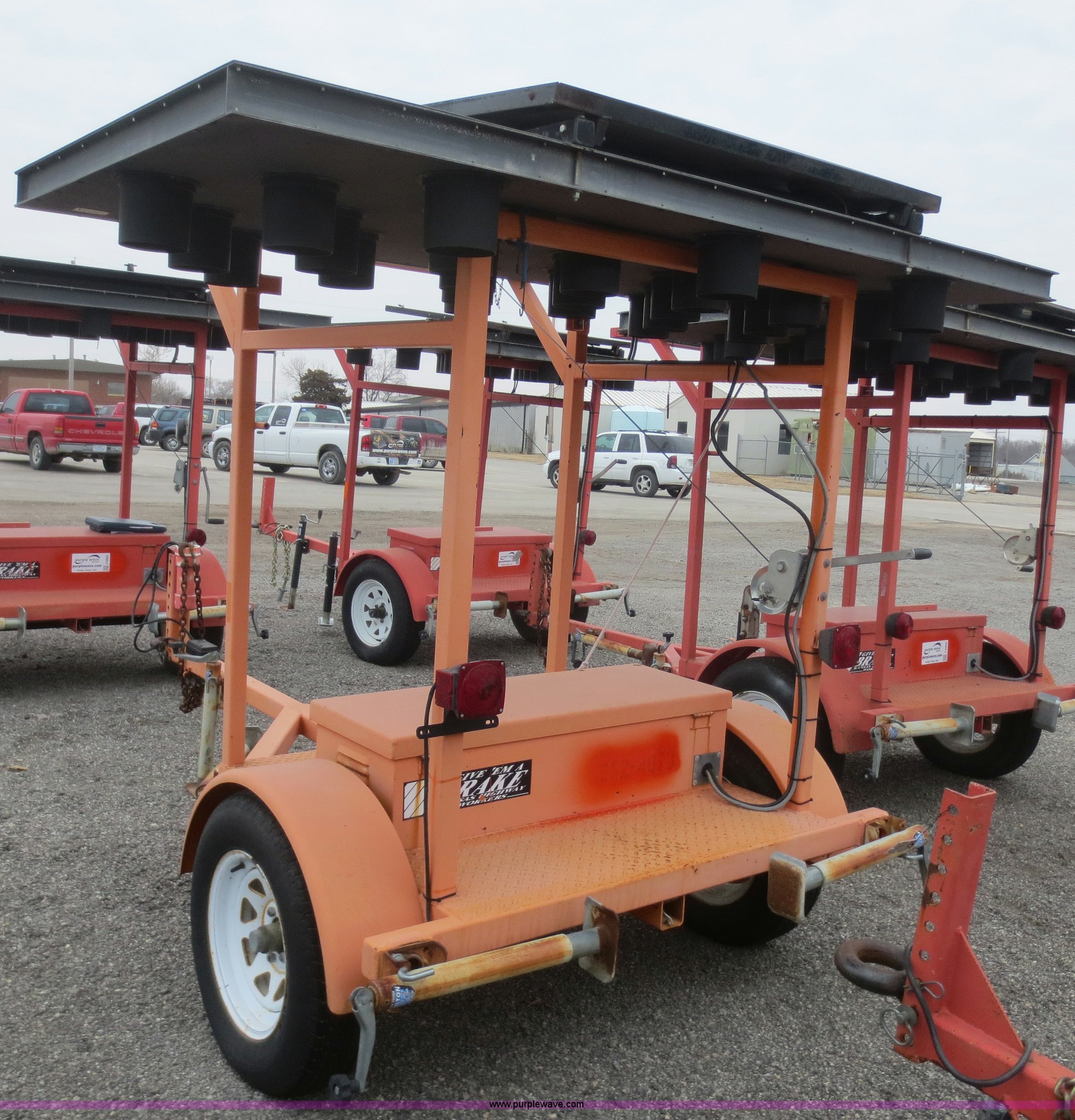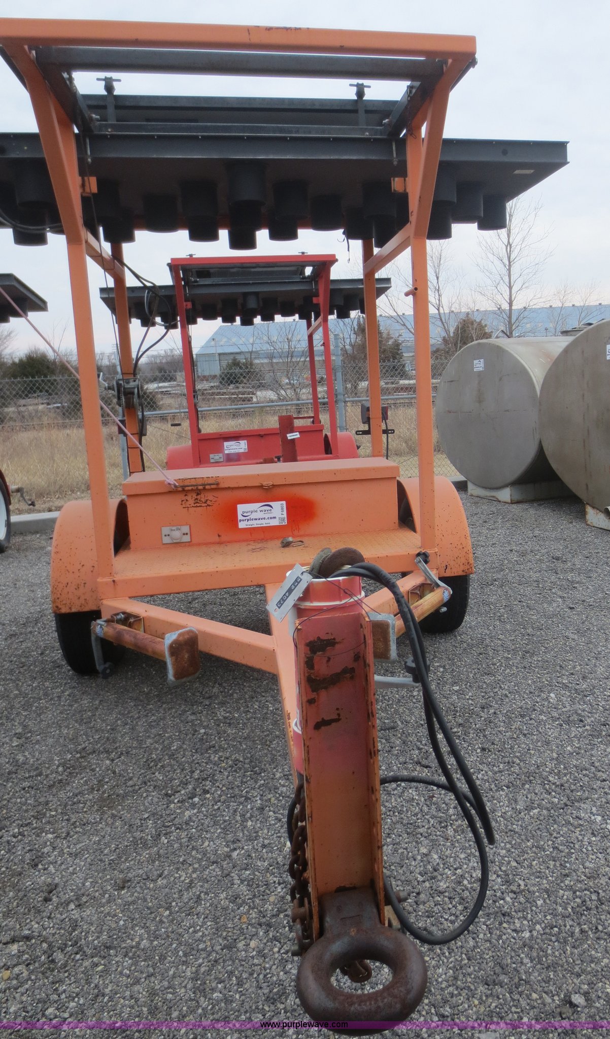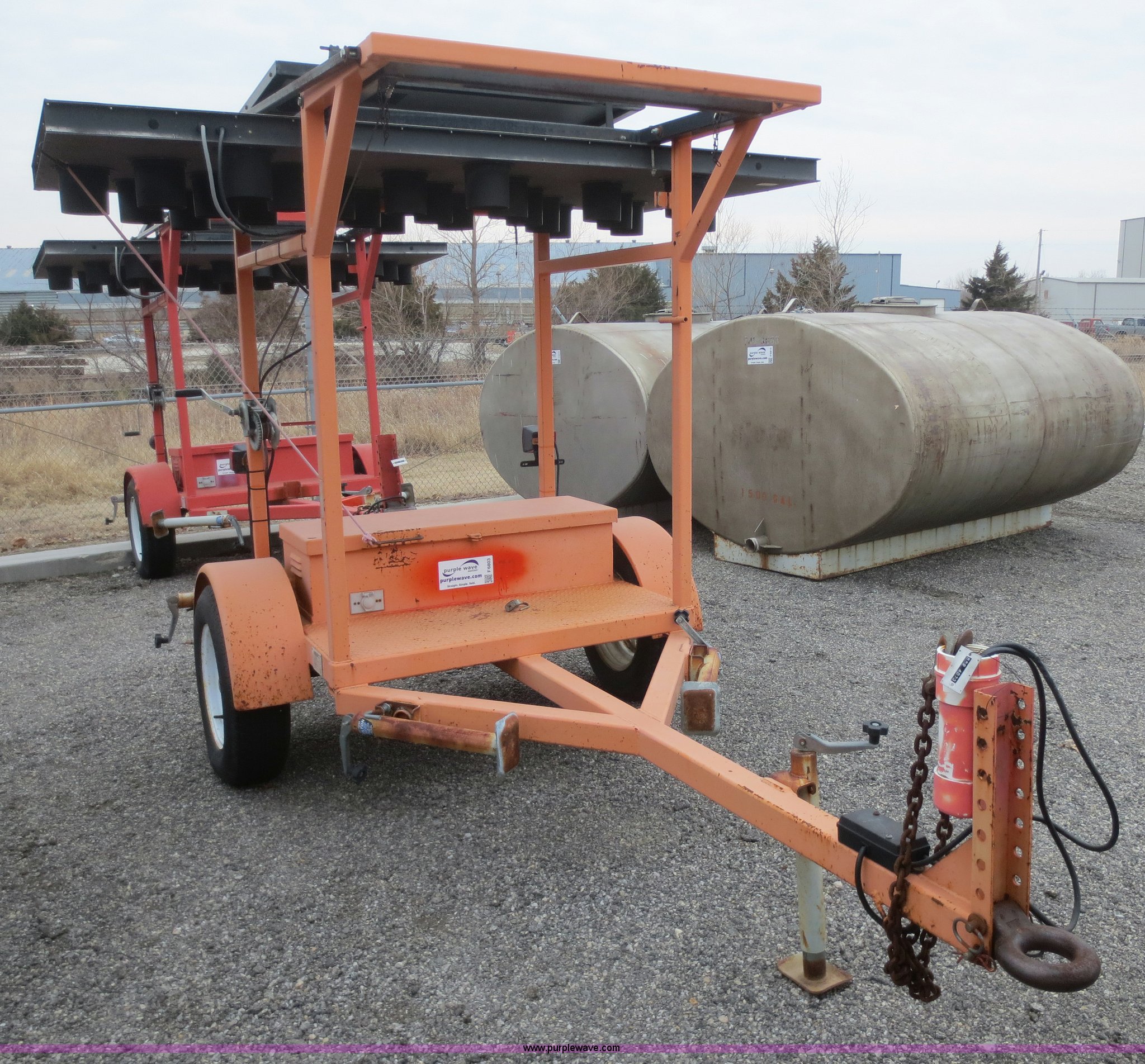 Purple Wave is selling a used Road Safety Equip. in Kansas. This item is a 2003 Ver-Mac ST-4825 arrow board sign trailer with the following: Solar powered, Pintle hitch, (4) stabilizers, Folding jack, Seven pin plug, ST205/75R15 tires, Battery connections dirty and corroded, Battery charger smoked when plugged in, Trailer wiring and lights need work, KDOT ID 552-4073