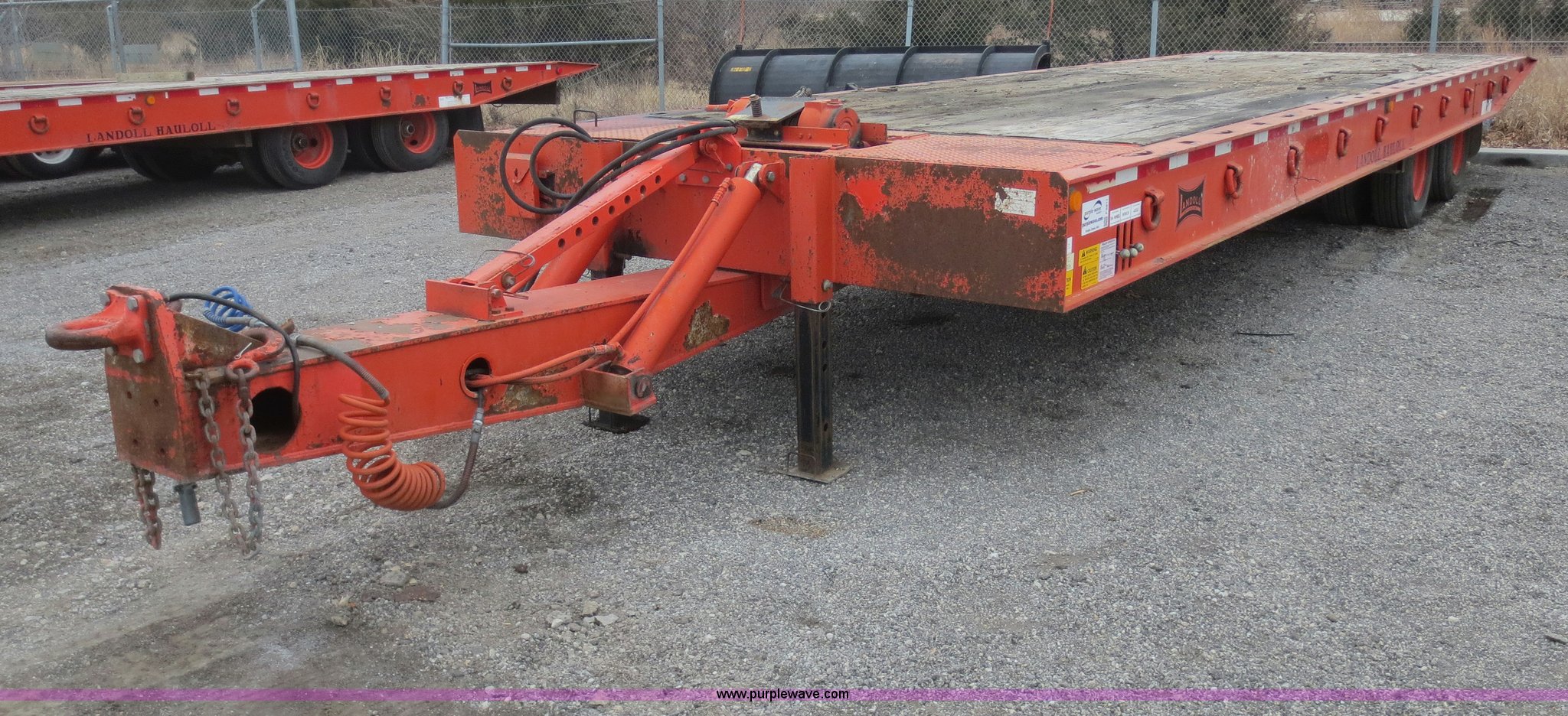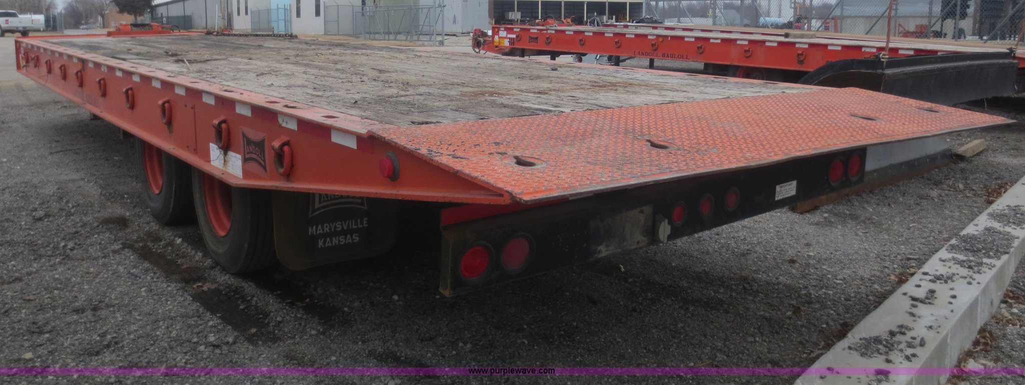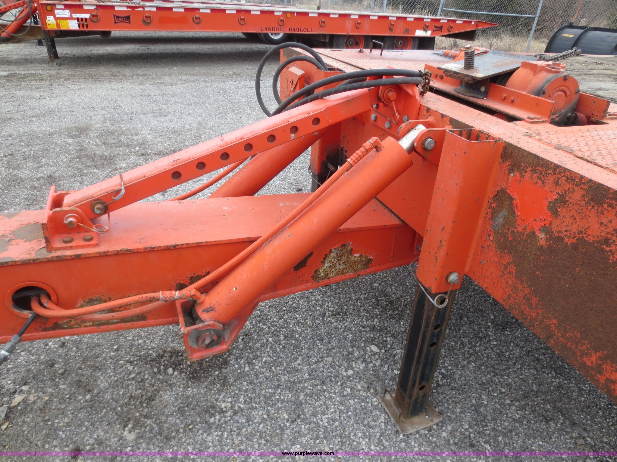 Purple Wave is selling a used Equip. Trailer in Kansas. This item is a 1996 Landoll 345-31 trailer with the following: 31'L x 102"W, 29" dovetail, Tilt deck, 20 ton capacity, Braden winch, (3) lever controls at left front of trailer, Seven pin plug, Pintle hitch, Spring suspension, Air brakes, 10R17.5 tires, Cross tubes under decking rusted out, KDOT ID 777-4025