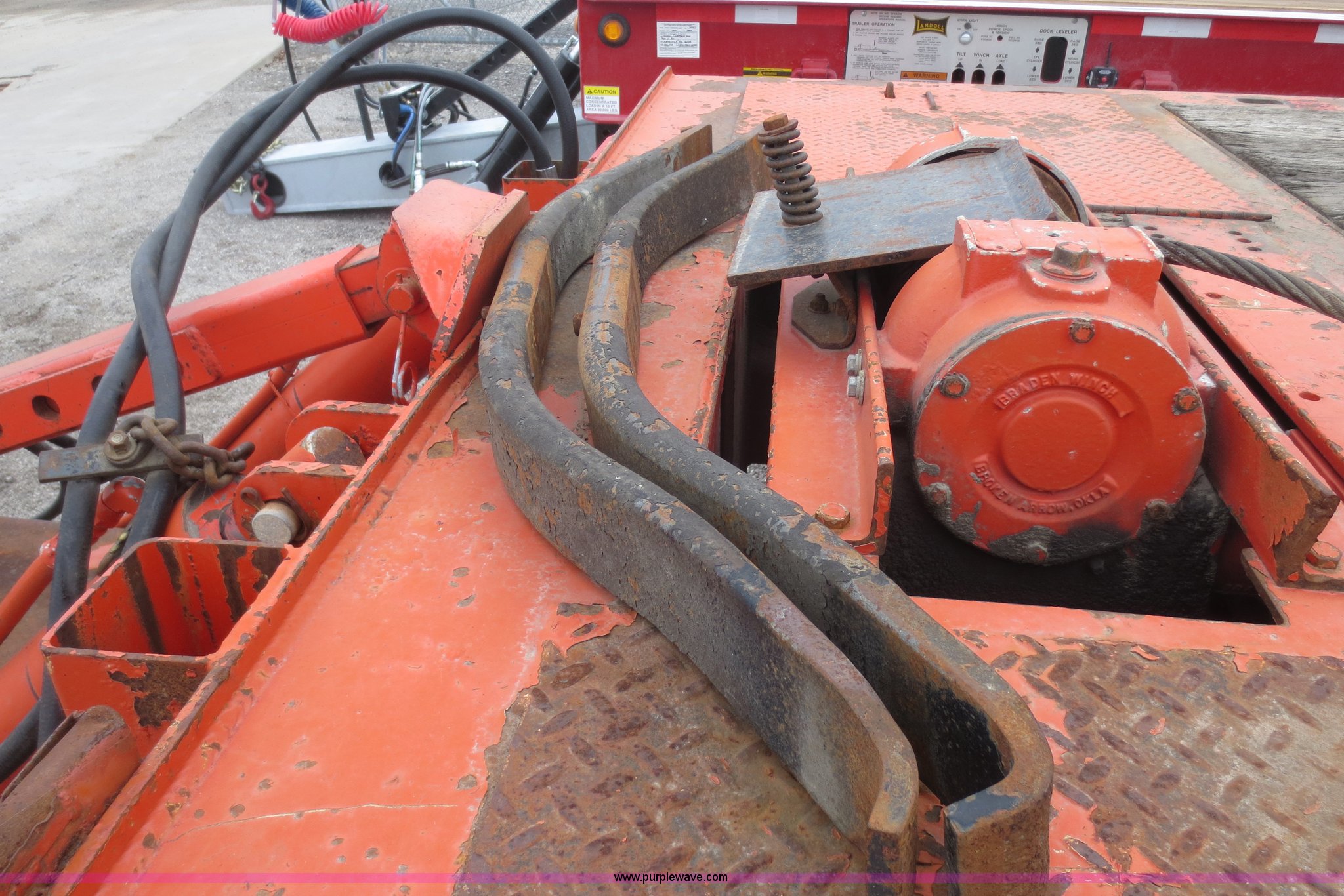 1996 Landoll 345-31 trailer. 31'L x 102"W, 29" dovetail, Tilt deck, Braden winch, 20 ton capacity, (3) leveler control on left front of trailer, Pintle hitch, Seven wire plug, Spring suspension, Air brakes, 10R17.5 tires, Cross tubes under decking rusted out, KDOT ID 777-4015. 1LH345JH9T1008131. KDOT Chanute. 411 W 14th. Chanute, KS 66720