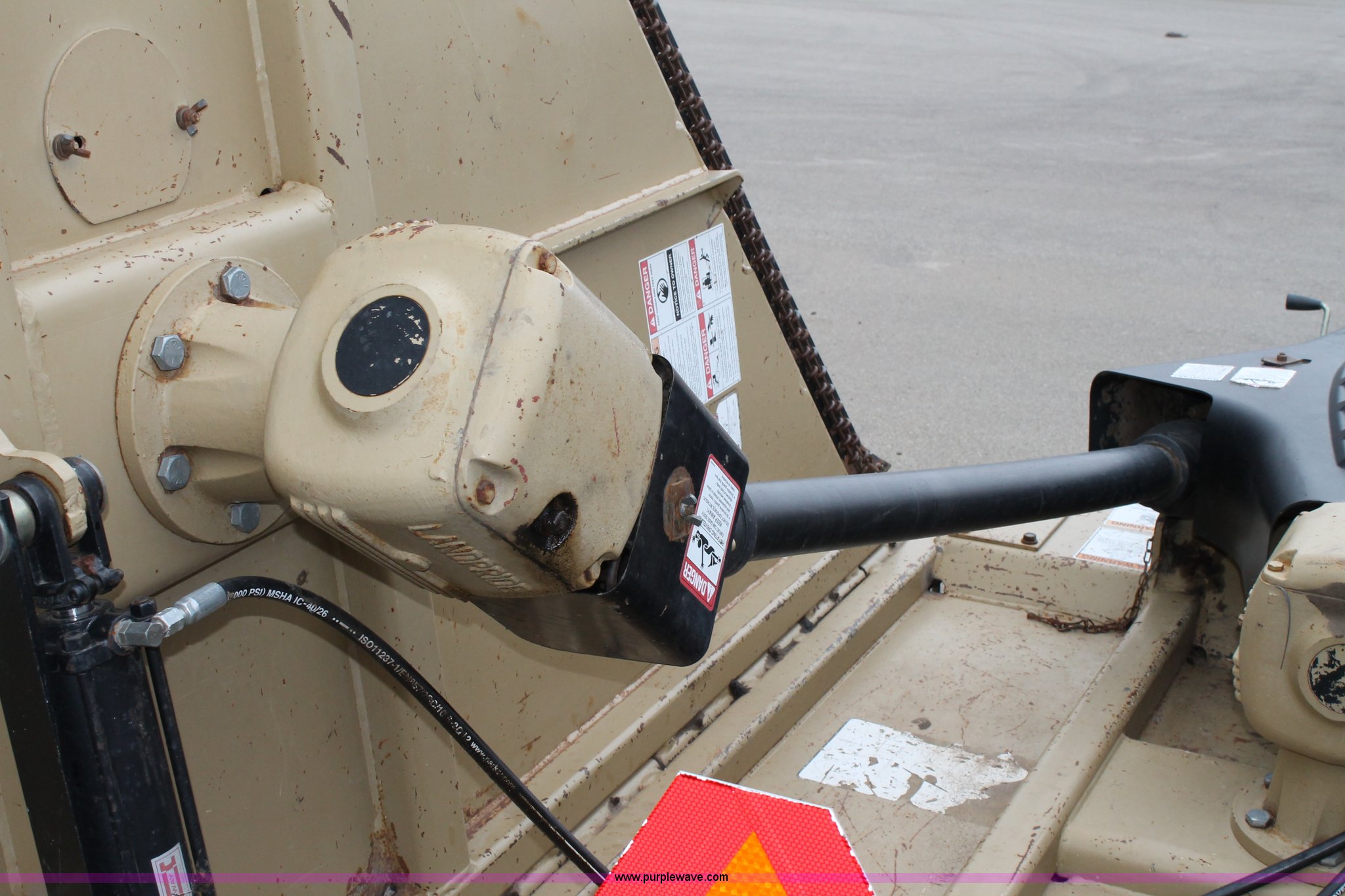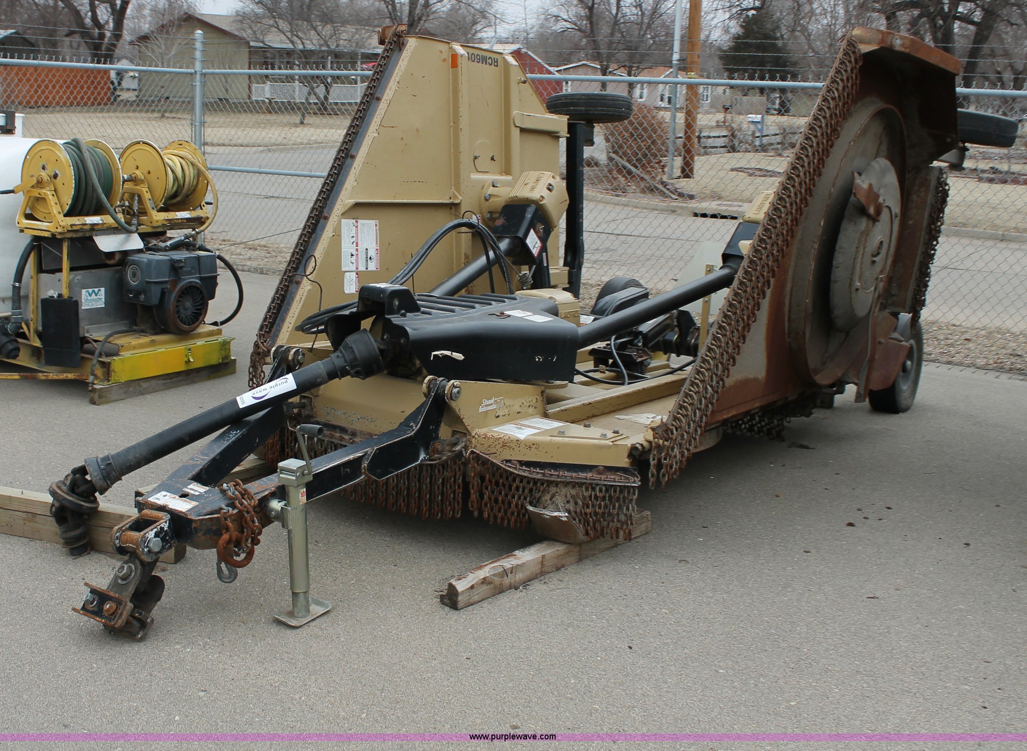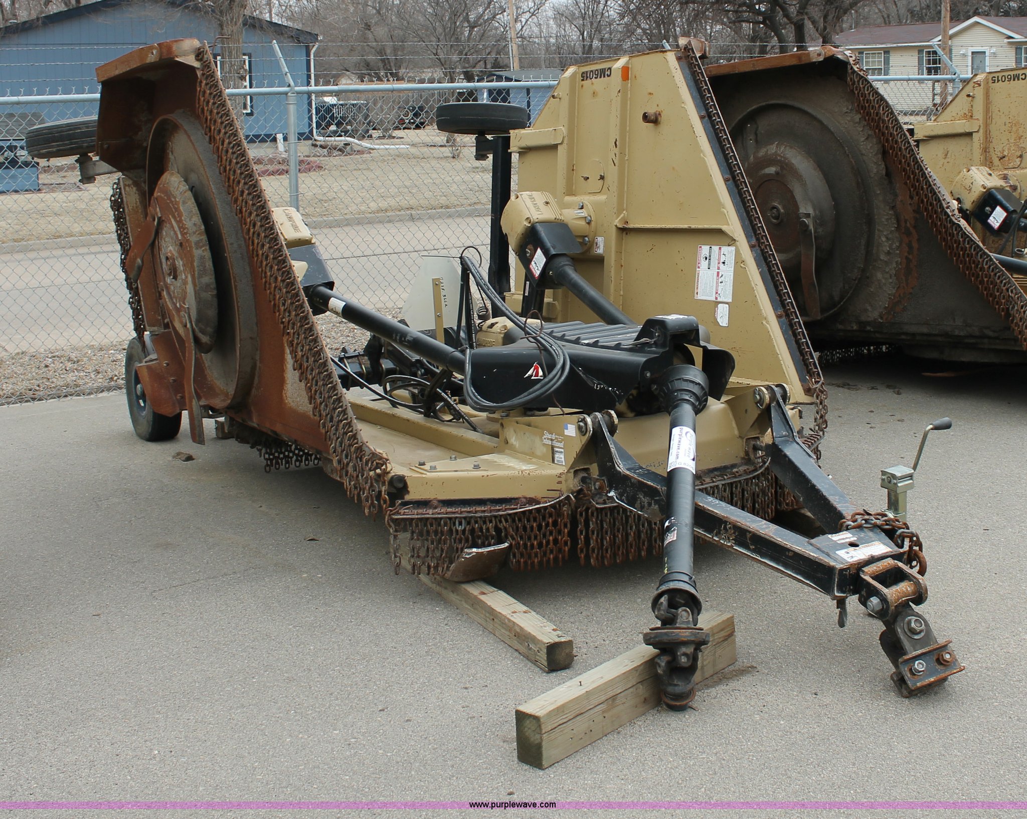 Purple Wave is selling a used Mower, Cutter, Shredder in Kansas. This item is a 2005 Land Pride RCB6015 batwing rotary mower with the following: 15'W cut, 1000 PTO, Walking beam axles, Pin hitch, Jack, 10" filled wheels, Damaged PTO shaft shield, Tires worn, Serial 473286, KDOT ID 397-2045