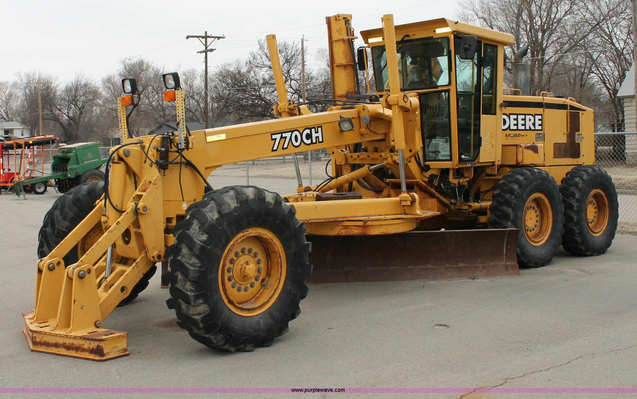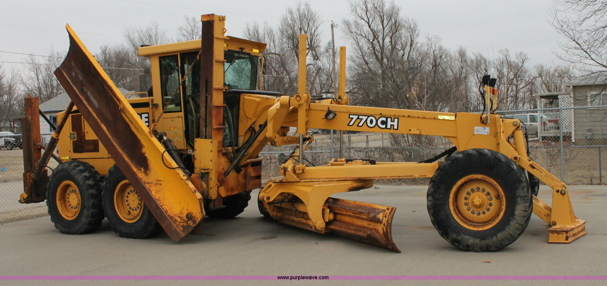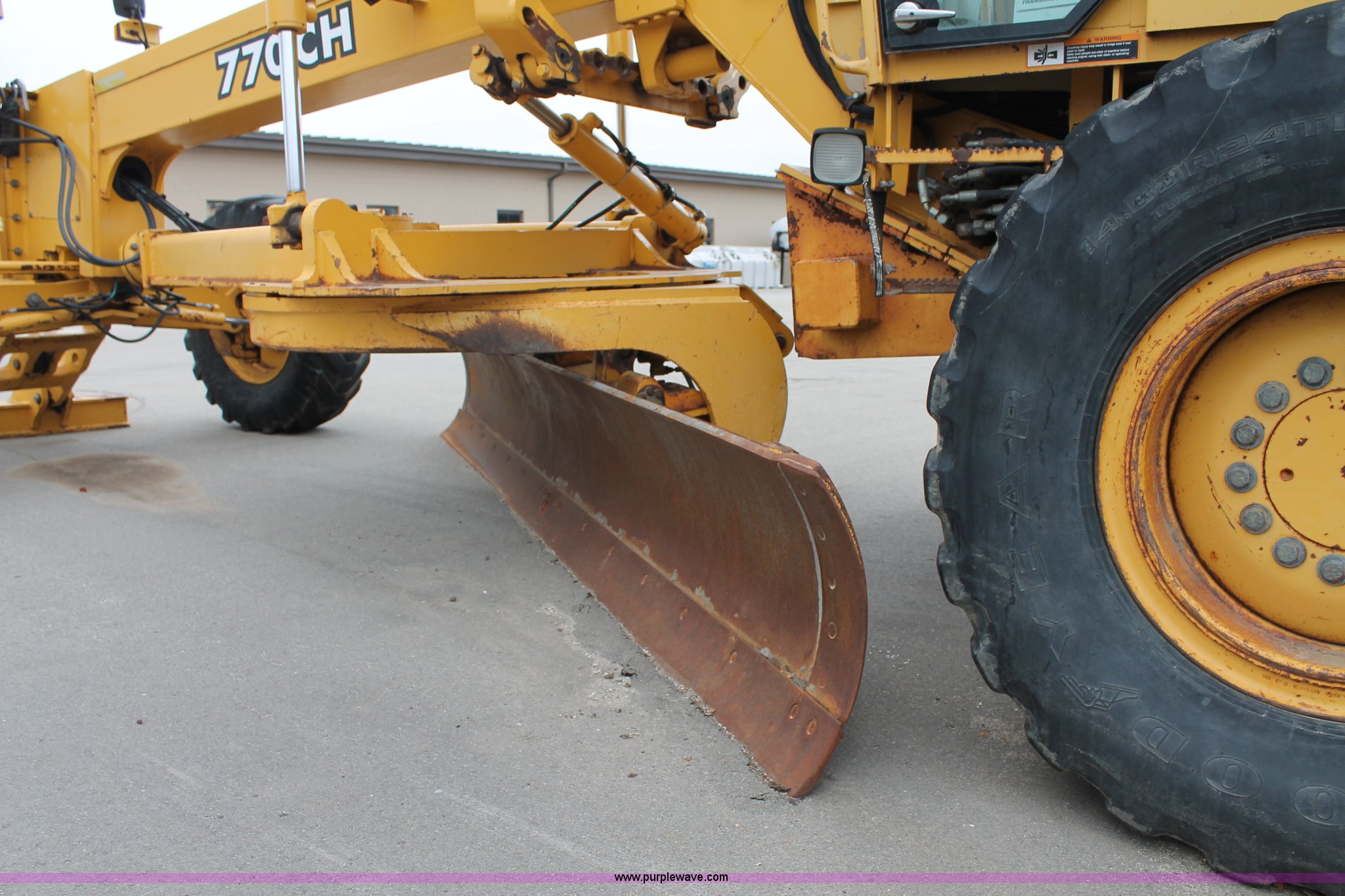 Purple Wave is selling a used Motor Grader in Kansas. This item is a 2001 John Deere 770CH articulated motor grader with the following: 4,836 hours on meter, John Deere 6081H six cylinder diesel engine, Eight speed powershift transmission, Non-operational transmission, Inching clutch, Locking differential, EROPS, AC and heat, Tilt stick, AM/FM, Suspension seat, Front windshield wipers, Front work lights, Front auxiliary hydraulics, 14' moldboard, 12' wing blade, Front scarifier, No teeth, Rear pin hitch, 14.00-24 tires, Bad circle bushings, Serial DW770CH580170, KDOT ID 335-2011