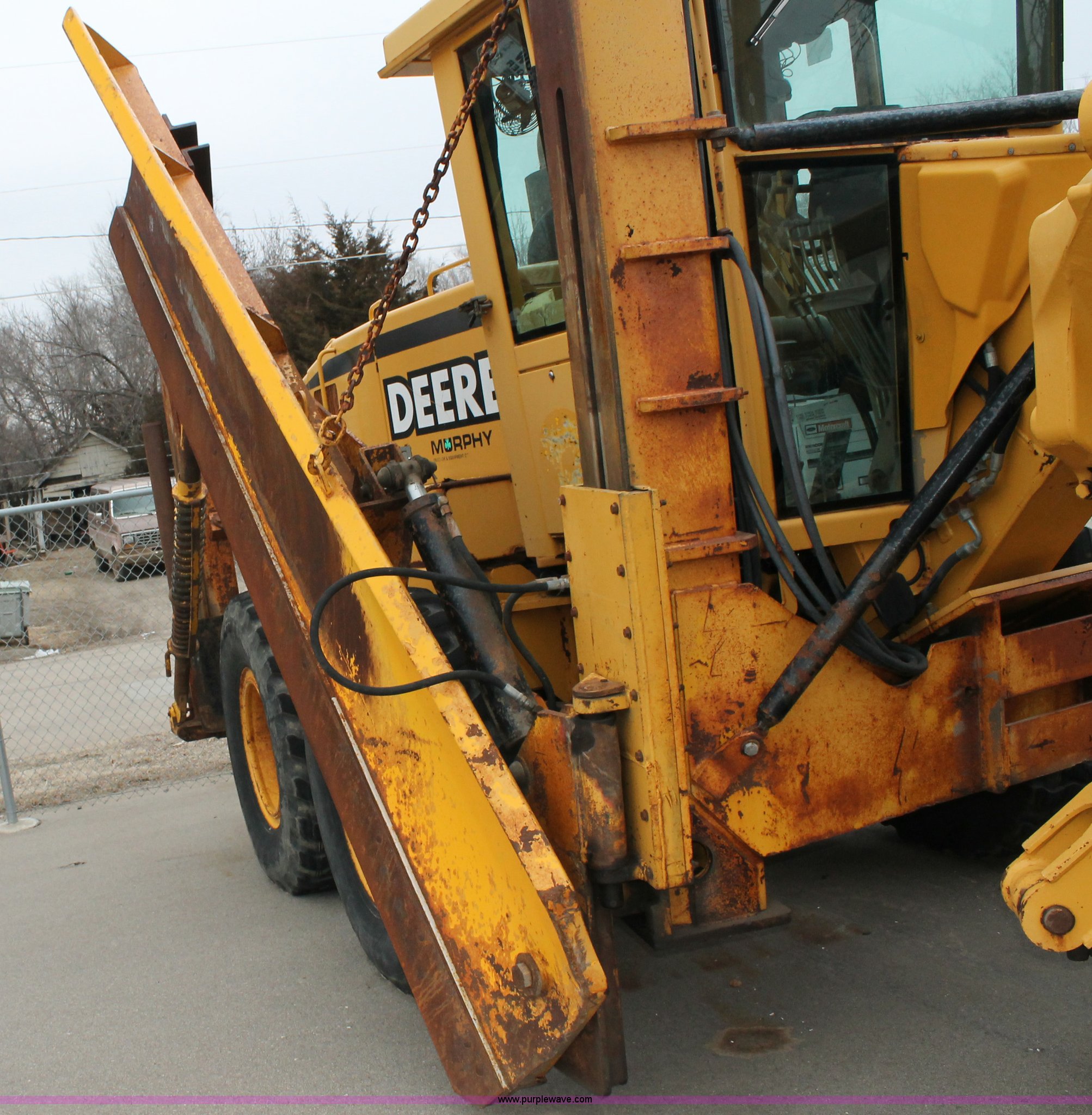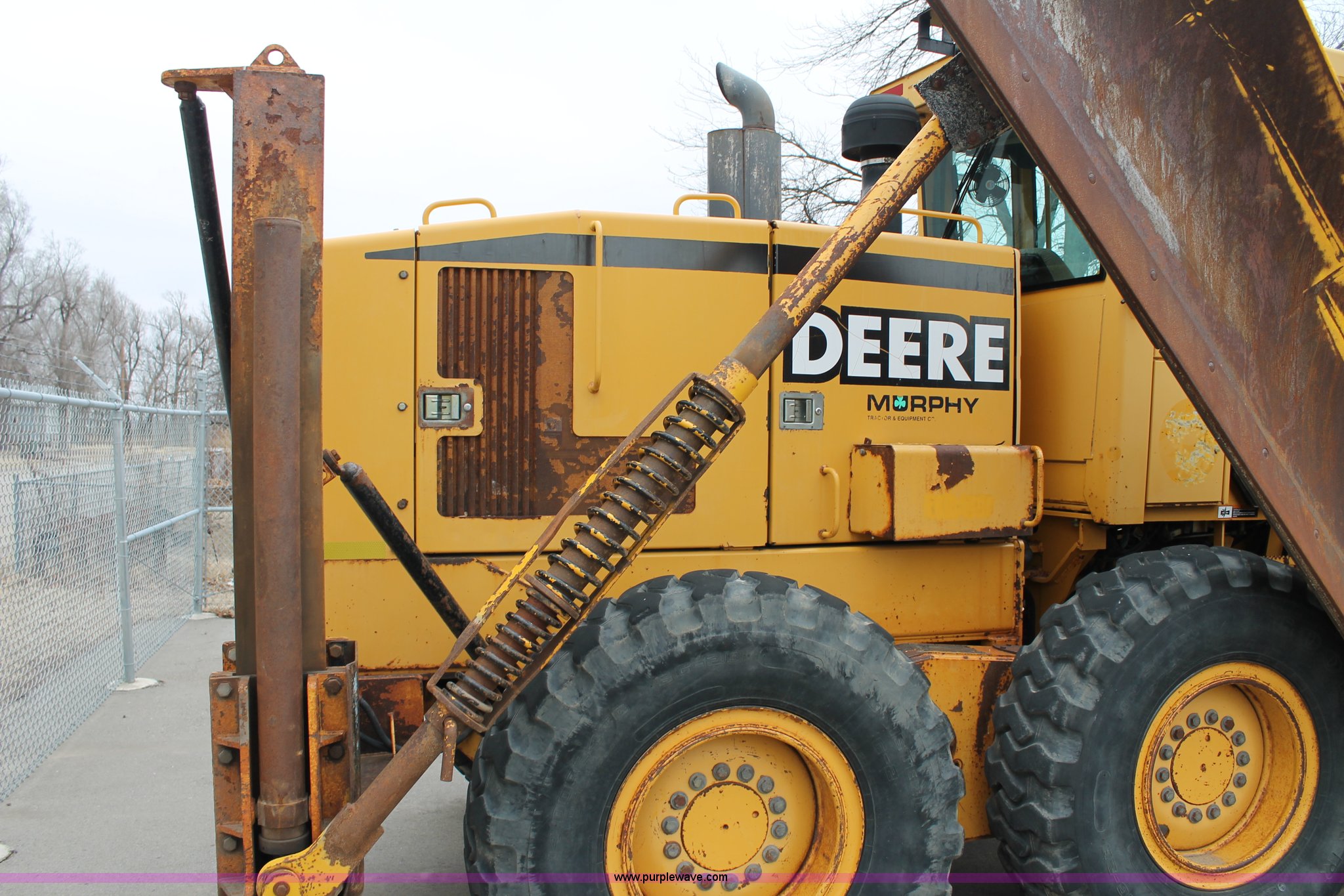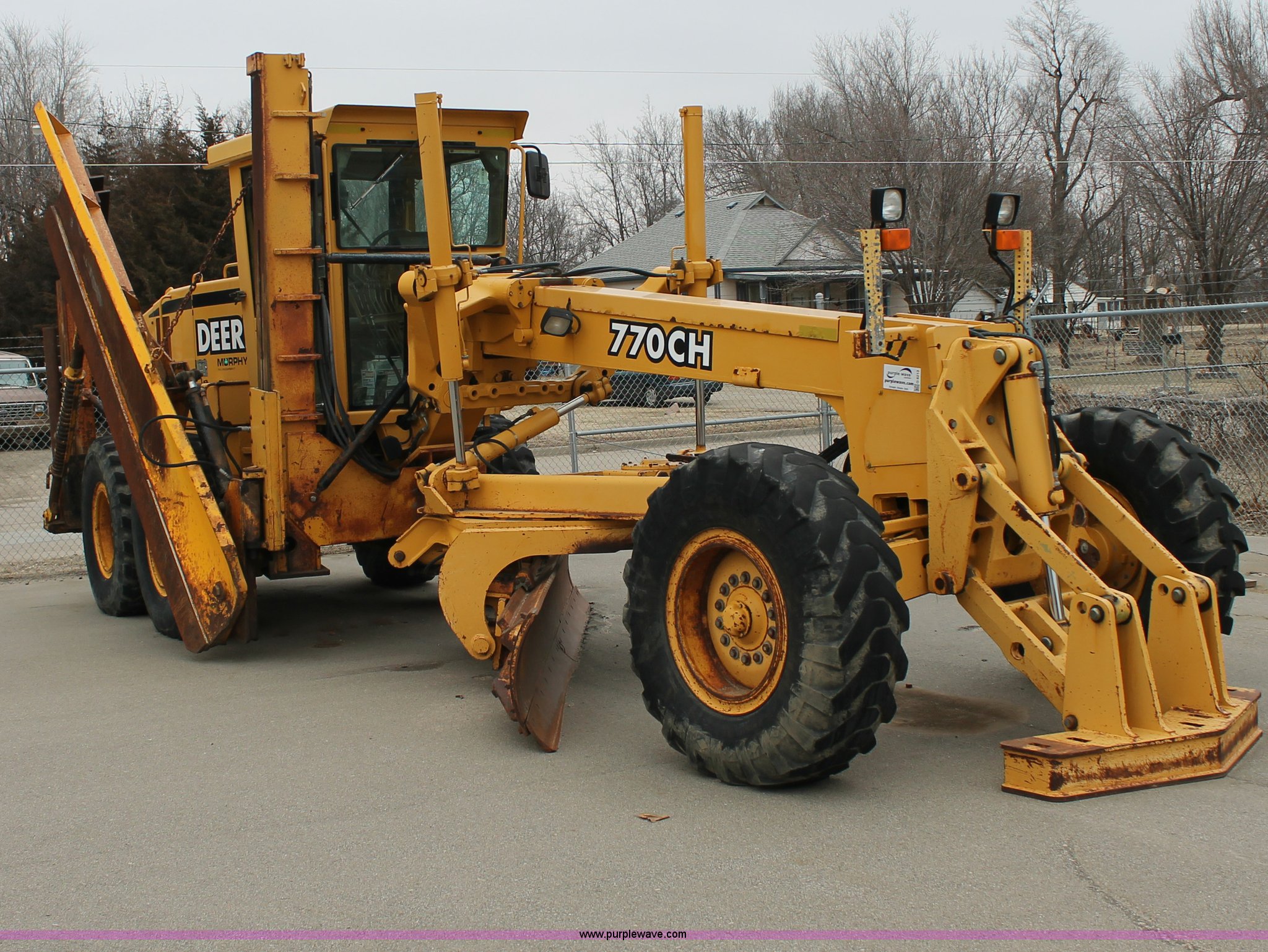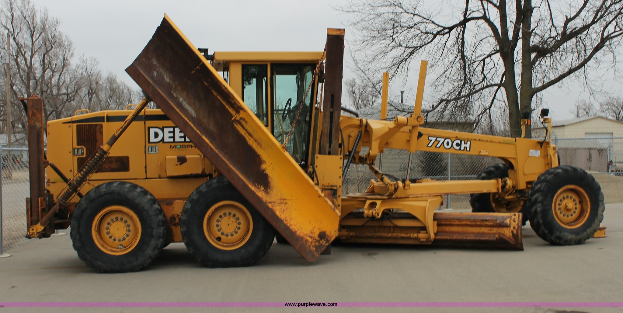 Purple Wave is selling a used Motor Grader in Kansas. This item is a 2001 John Deere 770CH articulated motor grader with the following: 4,836 hours on meter, John Deere 6081H six cylinder diesel engine, Eight speed powershift transmission, Non-operational transmission, Inching clutch, Locking differential, EROPS, AC and heat, Tilt stick, AM/FM, Suspension seat, Front windshield wipers, Front work lights, Front auxiliary hydraulics, 14' moldboard, 12' wing blade, Front scarifier, No teeth, Rear pin hitch, 14.00-24 tires, Bad circle bushings, Serial DW770CH580170, KDOT ID 335-2011