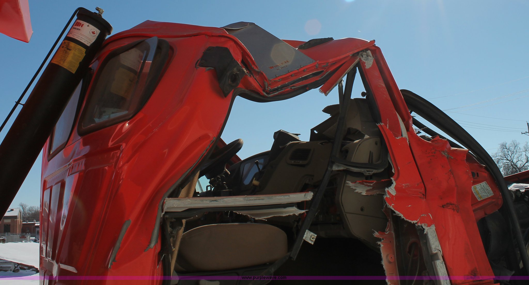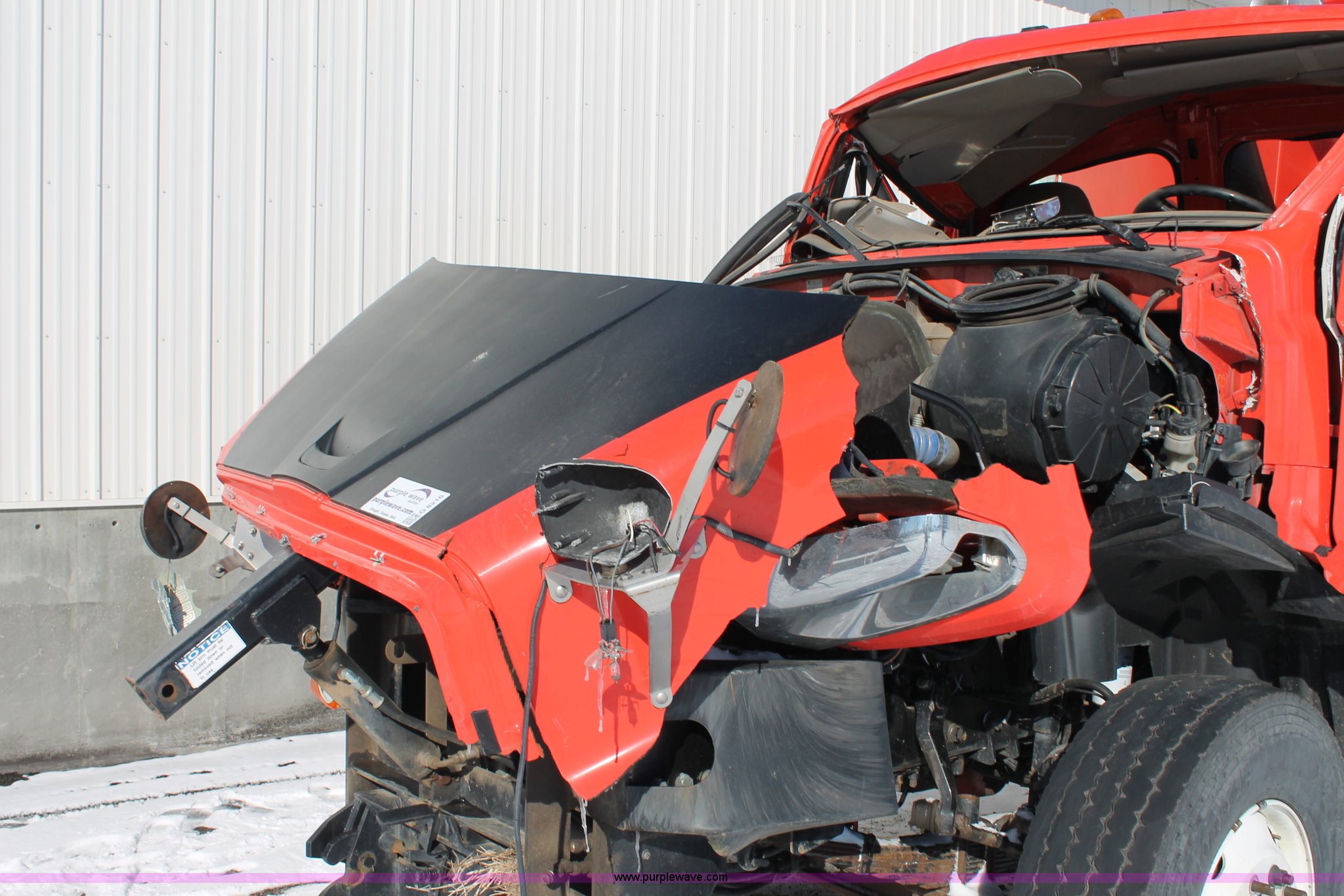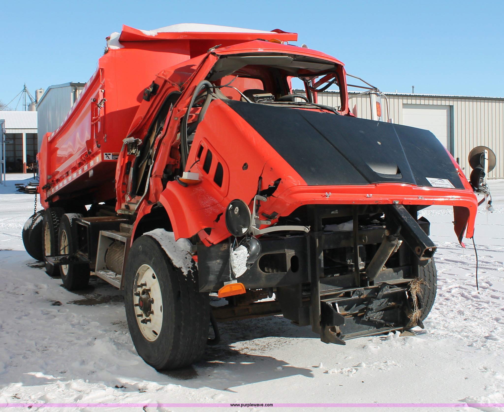 Purple Wave is selling a used Construction Dump Truck in Kansas. This item is a 2009 Sterling L7500 dump truck with the following: 68,000 miles on odometer, Cummins ISC 8.3L L6 diesel engine, Non-operational engine, Allison 3500 automatic transmission, Non-operational transmission, Interaxle differential lock, AC and heat, Cruise, Suspension seat, Force spreader controls, Joystick plow controls, Light console controls, Under bed toolbox, 80 gallon fuel tank, Spring suspension, Air brakes, Pintle hitch, Rear auxiliary hydraulics, 315/80R22.5 tires, GVWR 56,000 lbs, Vehicle wrecked, Substantial front end damage, No passenger door, Cab bent and broken, Hoist unattached from bed, Frame bent, Dump bed broken, Parts may be missing, KDOT ID 263-3128