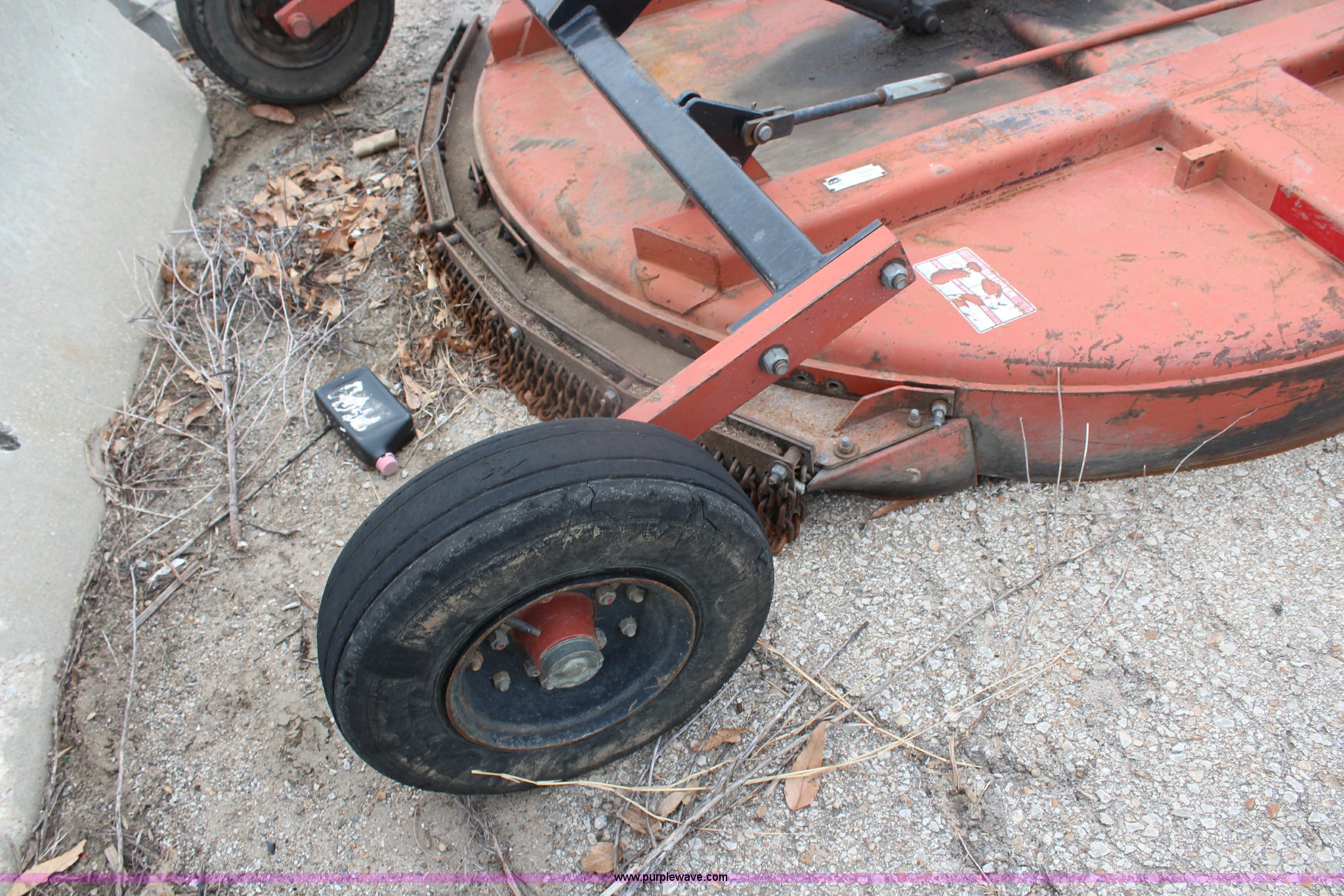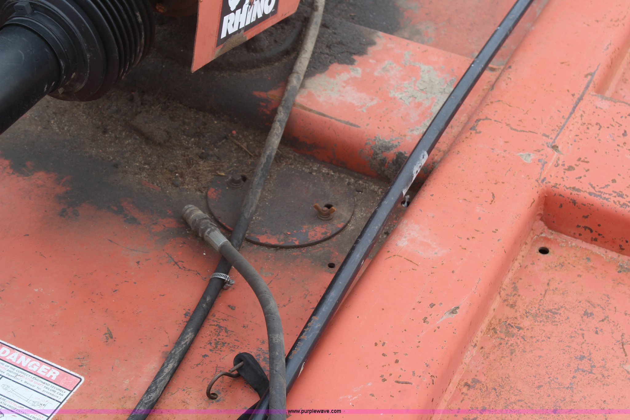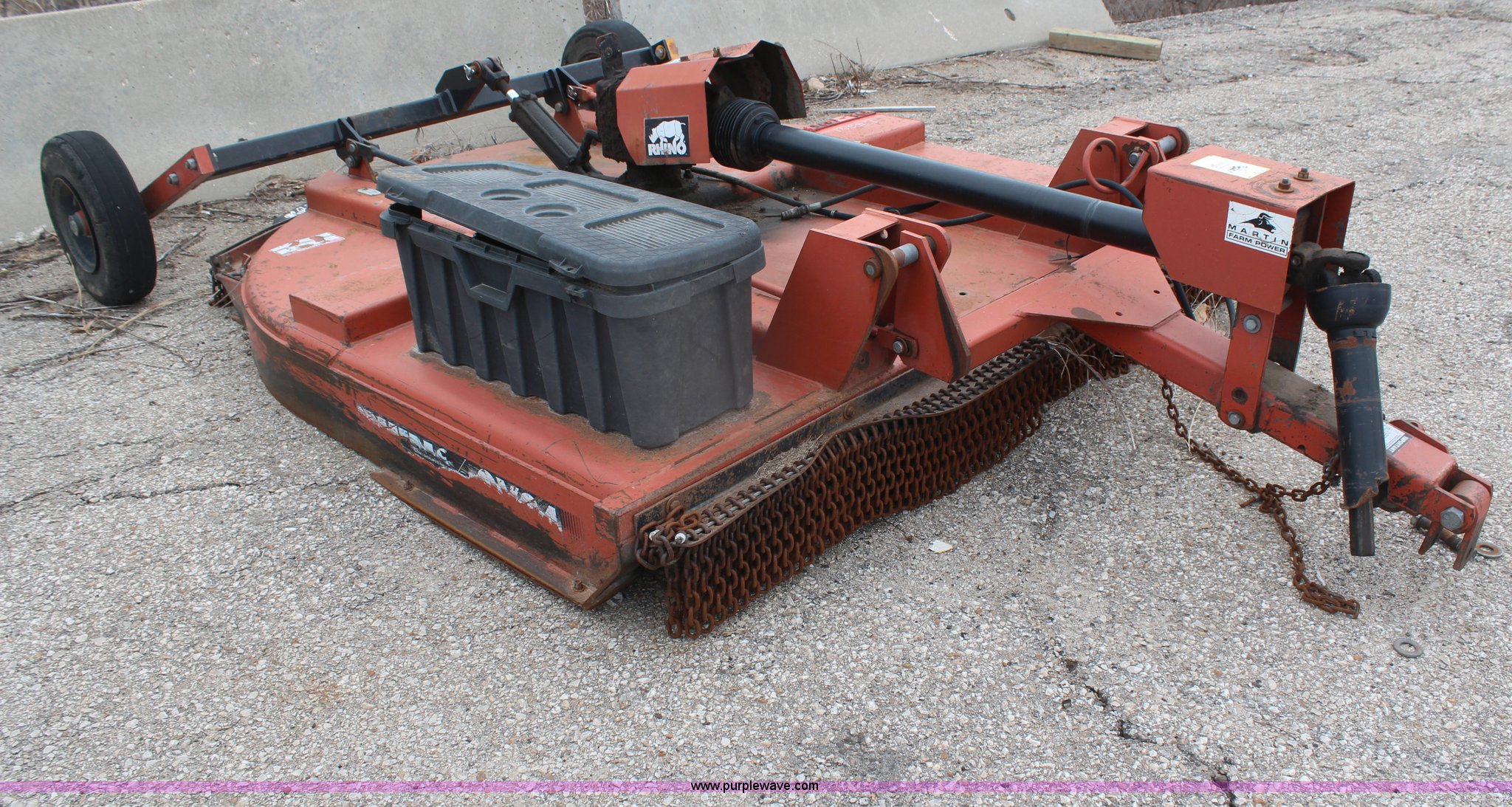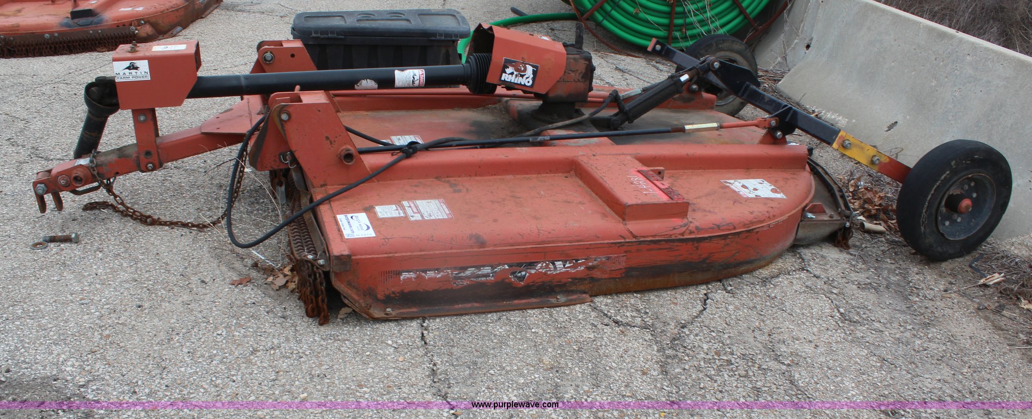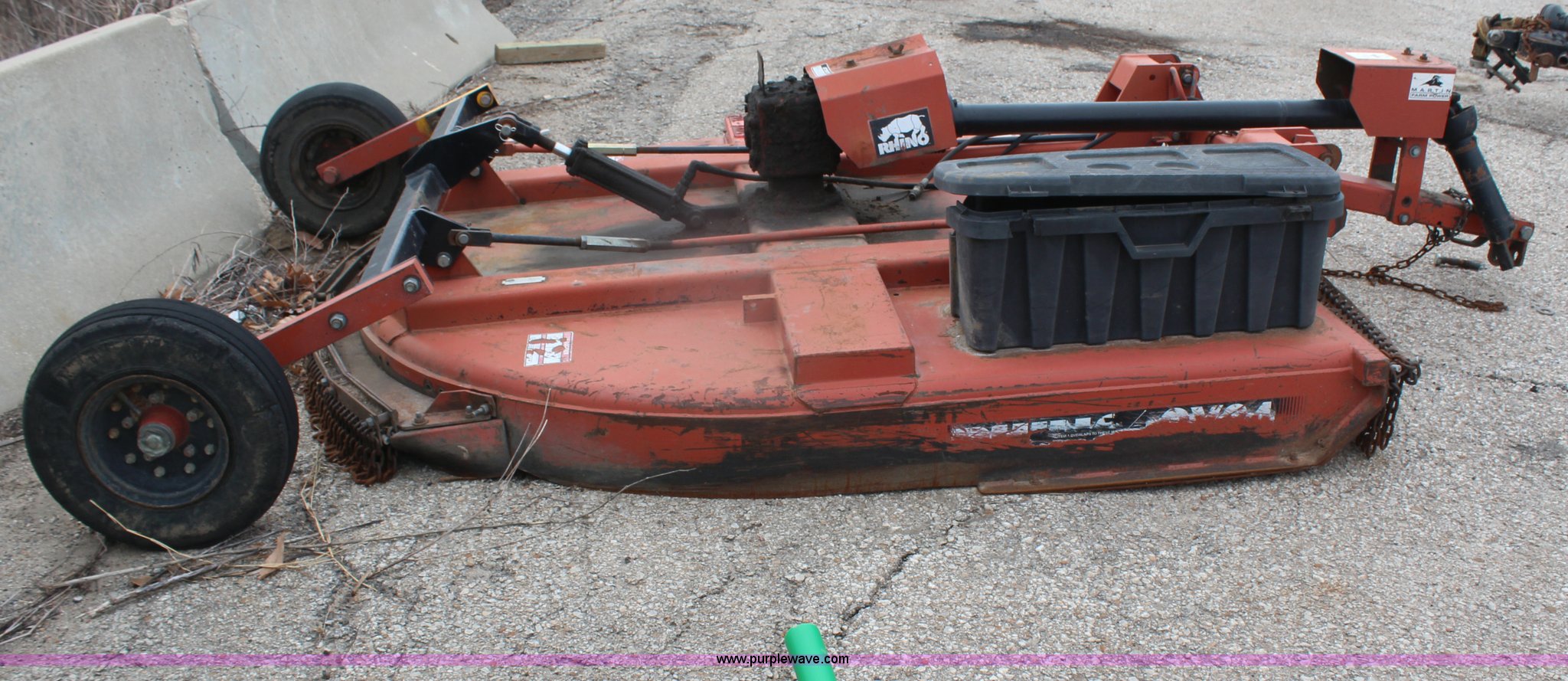 Purple Wave is selling a used Mower, Cutter, Shredder in Kansas. This item is a 2005 Rhino CY84 rotary mower with the following: 7'W cutting capacity, Clevis hitch, Missing PTO shaft, Tires worn, Serial 10439, KDOT ID 392-1095