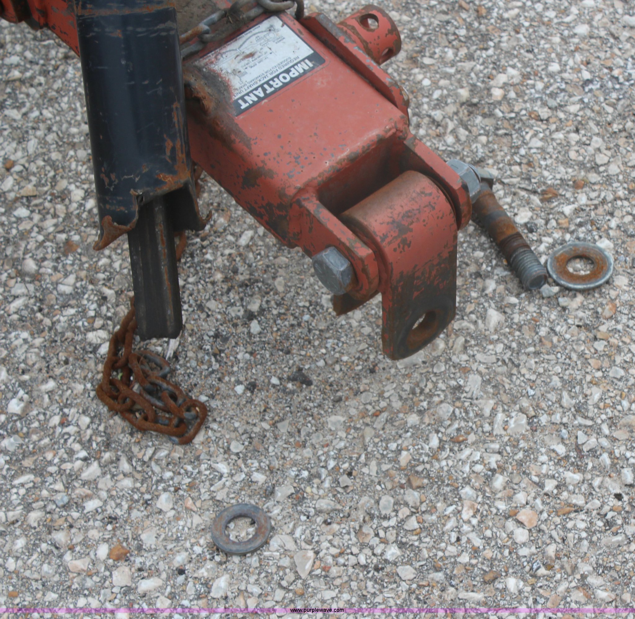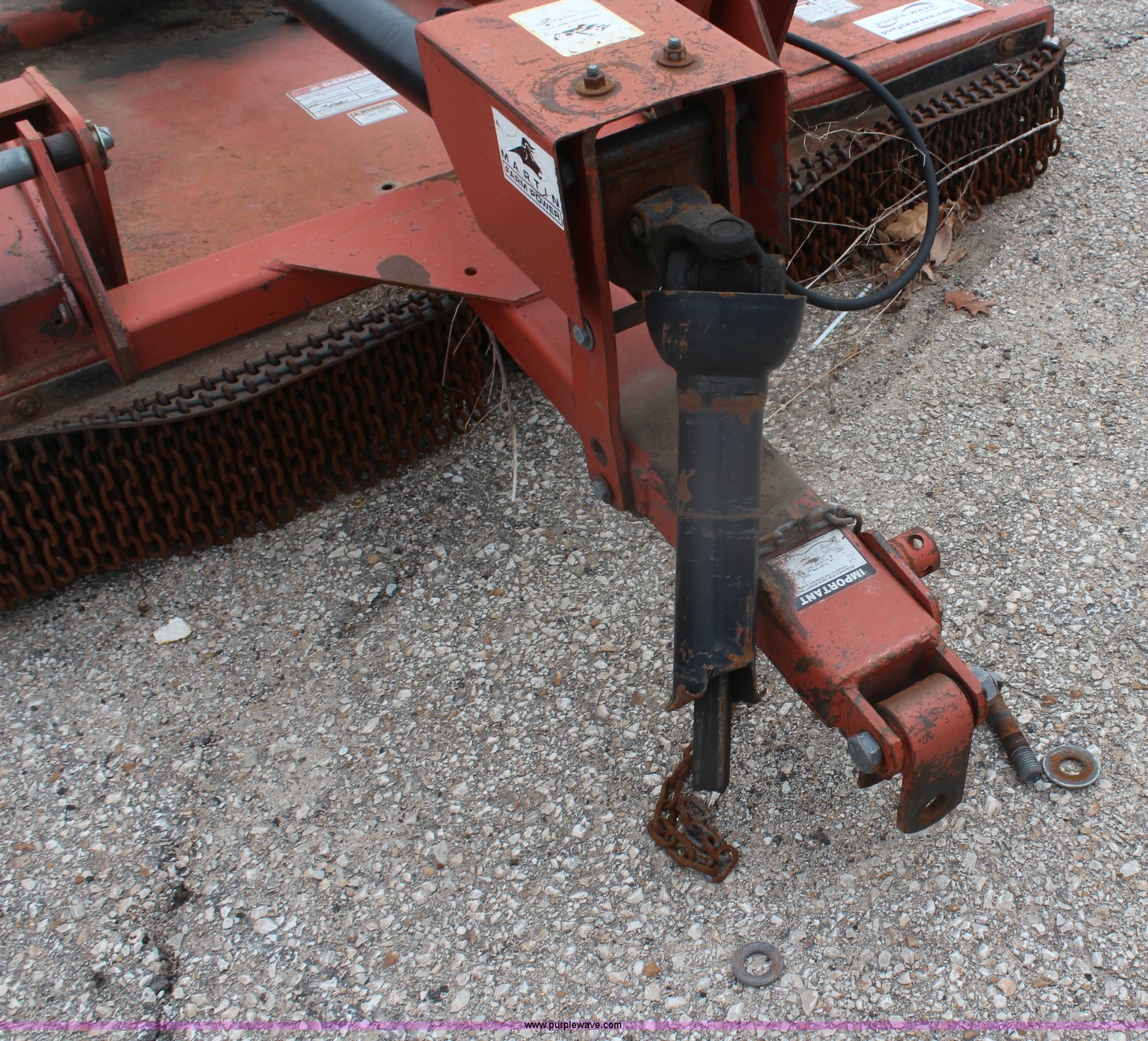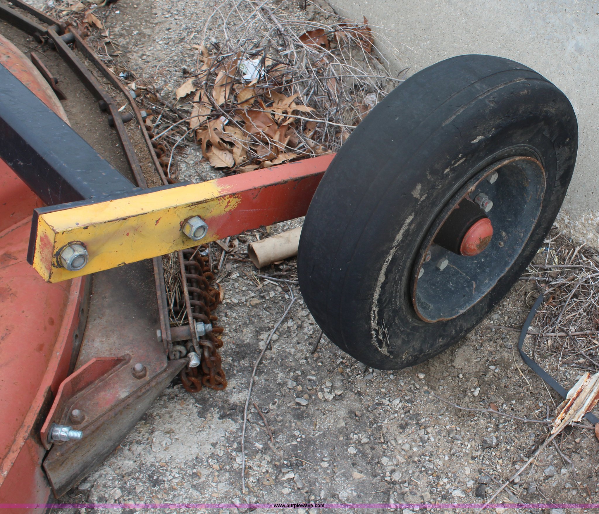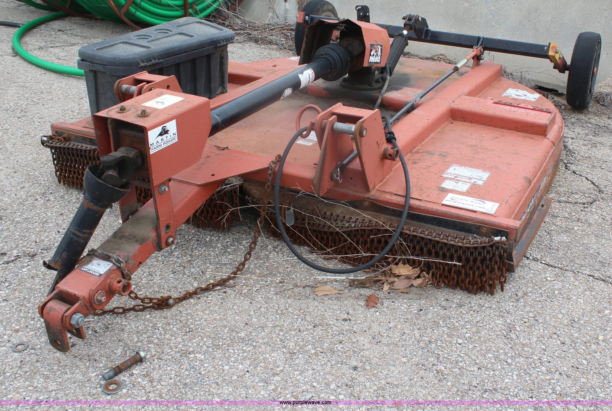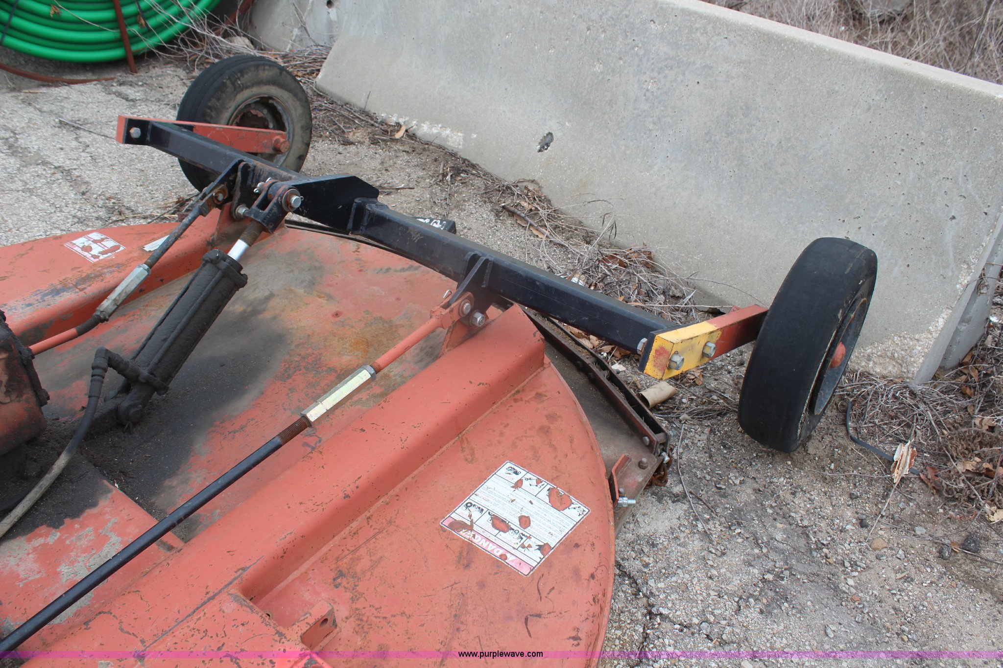 Purple Wave is selling a used Mower, Cutter, Shredder in Kansas. This item is a 2005 Rhino CY84 rotary mower with the following: 7'W cutting capacity, Clevis hitch, Missing PTO shaft, Tires worn, Serial 10439, KDOT ID 392-1095