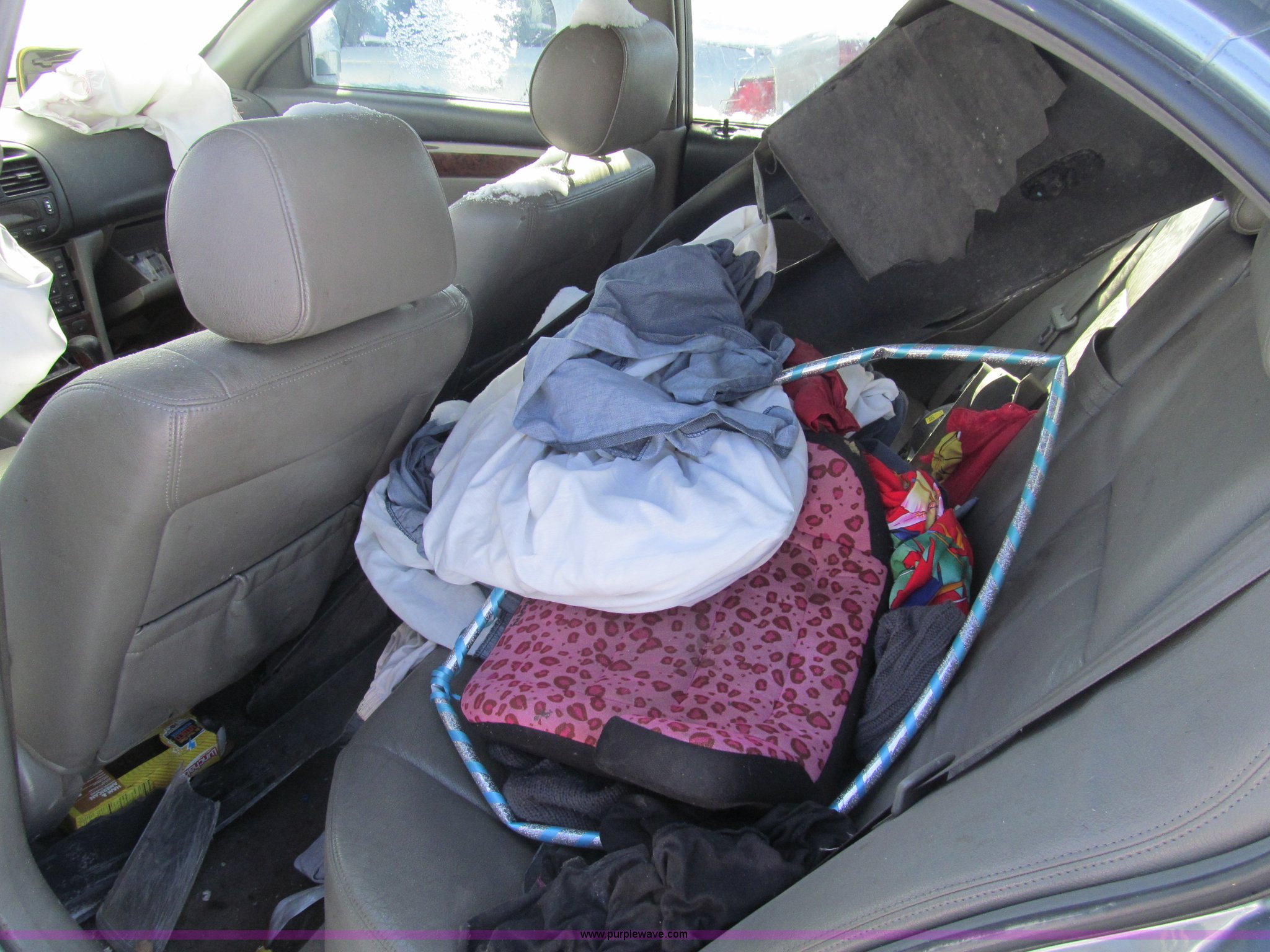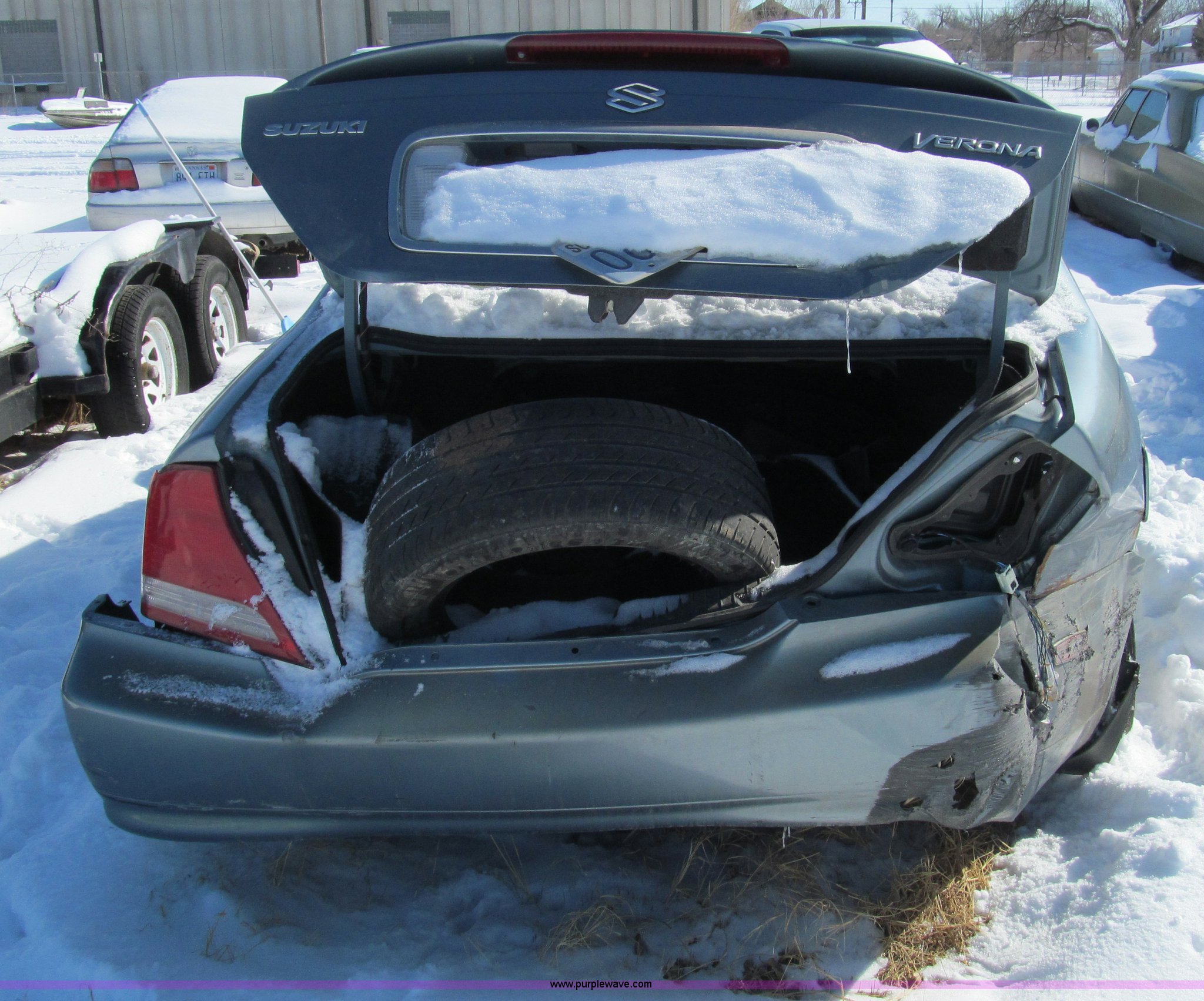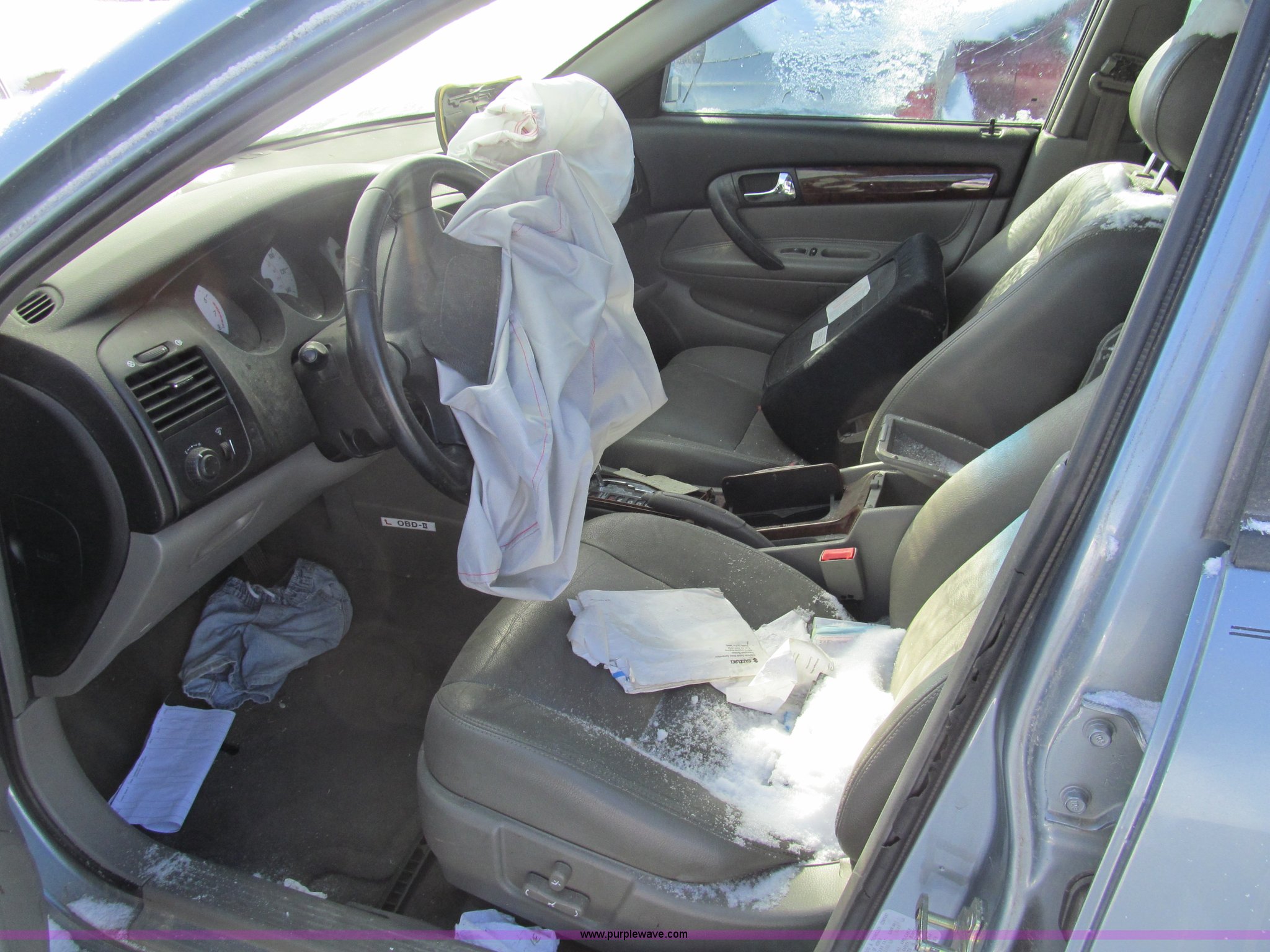 Purple Wave is selling a used Wrecked and Abandoned in Kansas. This item is a 2004 Suzuki Verona with the following: Unknown miles on odometer, 2.5L six cylinder gas engine, Automatic transmission, AC and heat, Tilt, Cruise, AM/FM/CD, Power windows, locks, and seats, Leather interior, Sunroof, 215/50R16 tires, Air bags deployed, Major collision damage, Case# 13C29531