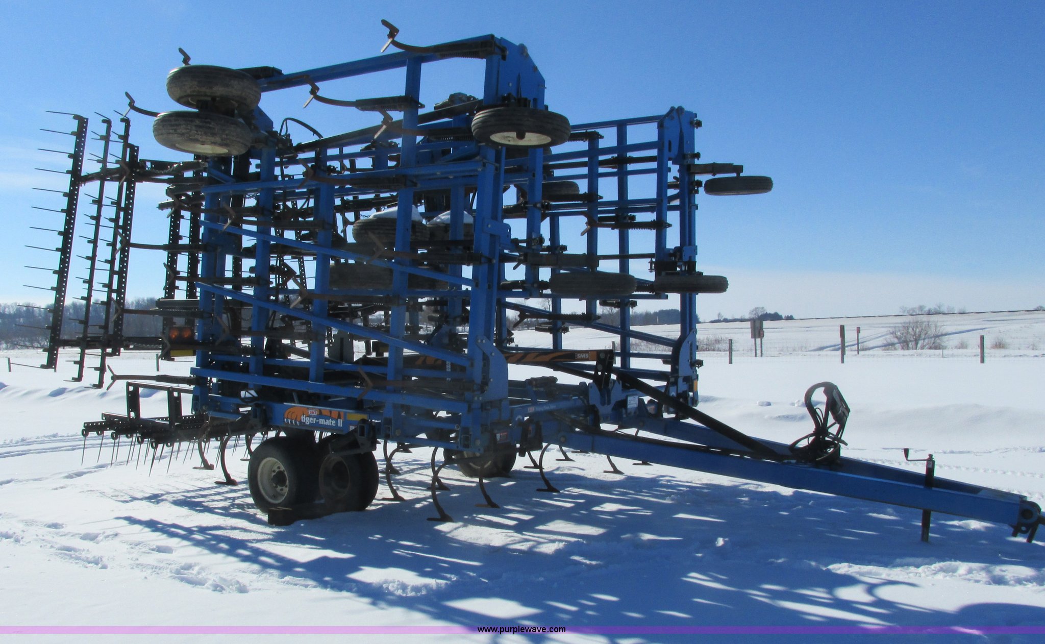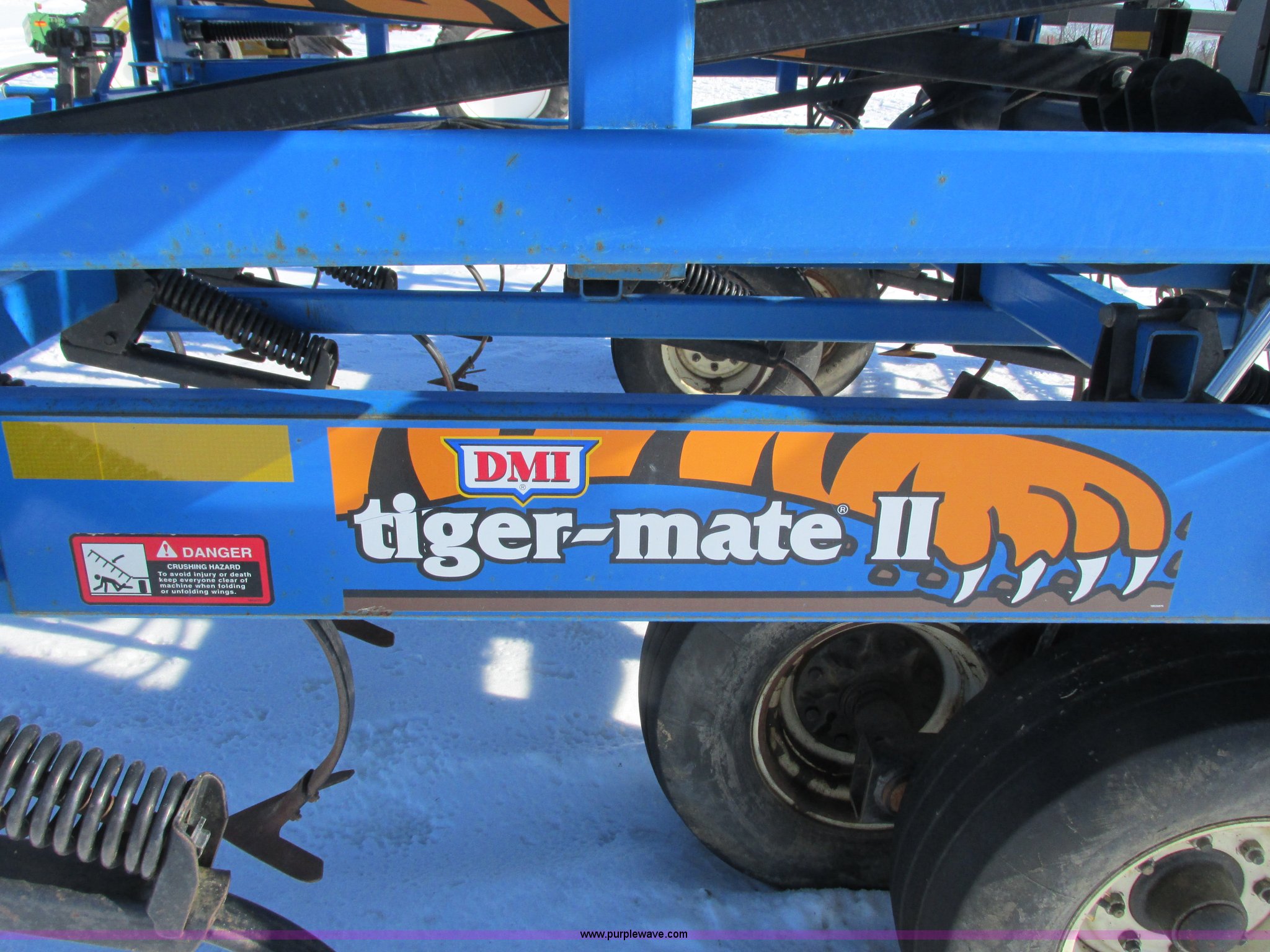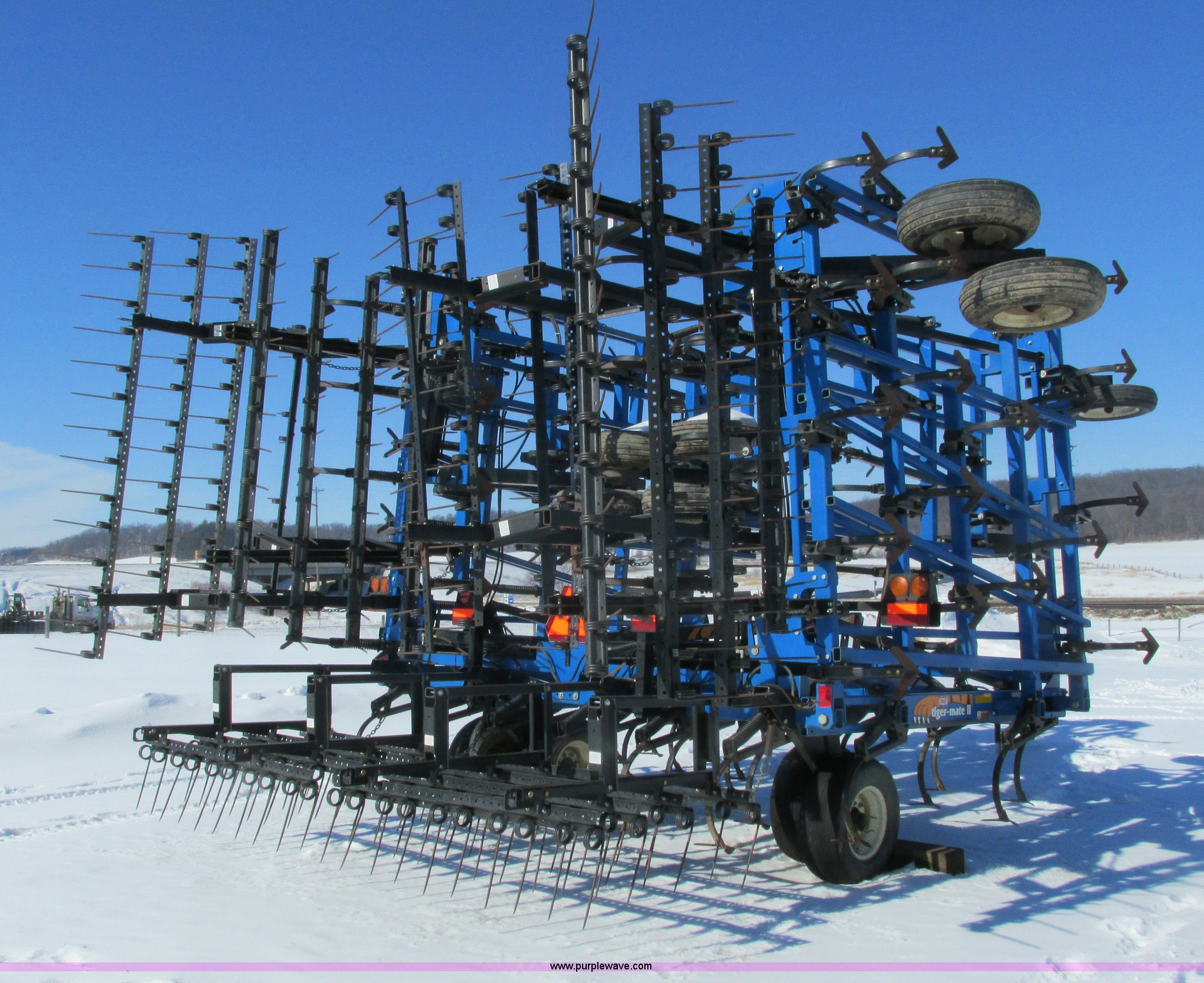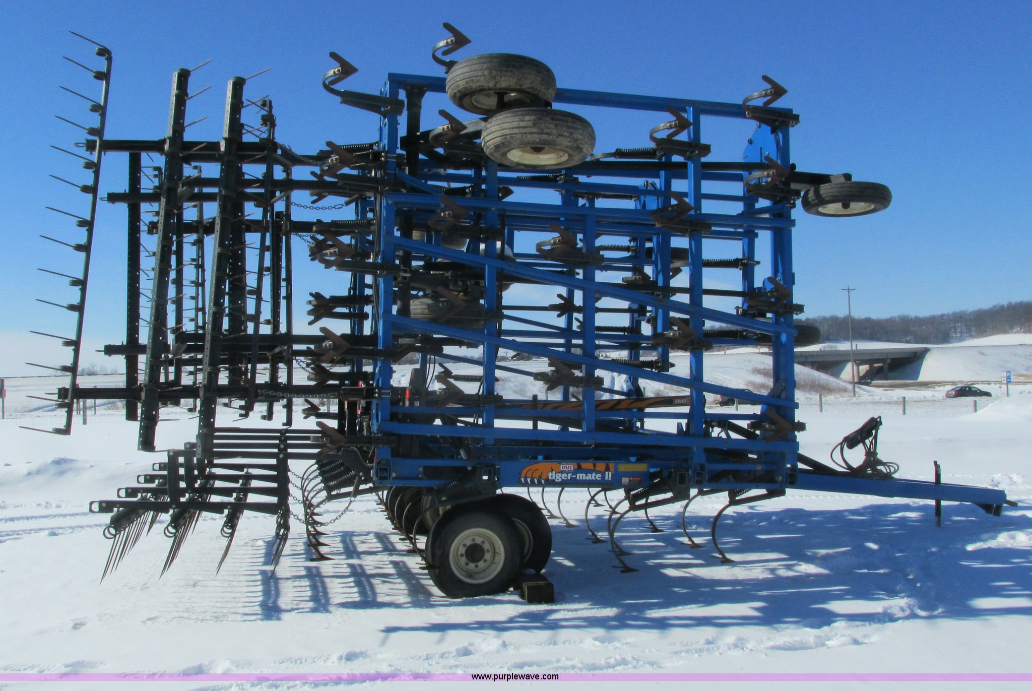 Purple Wave is selling a used Field Cultivator or Sweep Plow in Wisconsin. This item is a DMI Tigermate II field cultivator with the following: 45'W, Hydraulic raise and fold, (5) section bi-fold wings, Four bar coil toothed harrows with shovels, C-shank, (6) 6' sweeps, Road lights, Hydraulic lines, Pintle hitch, (4) 5.90-15SL guide wheels, (12) 11L-15 tires, Serial JFW0010124, Stock# 122422