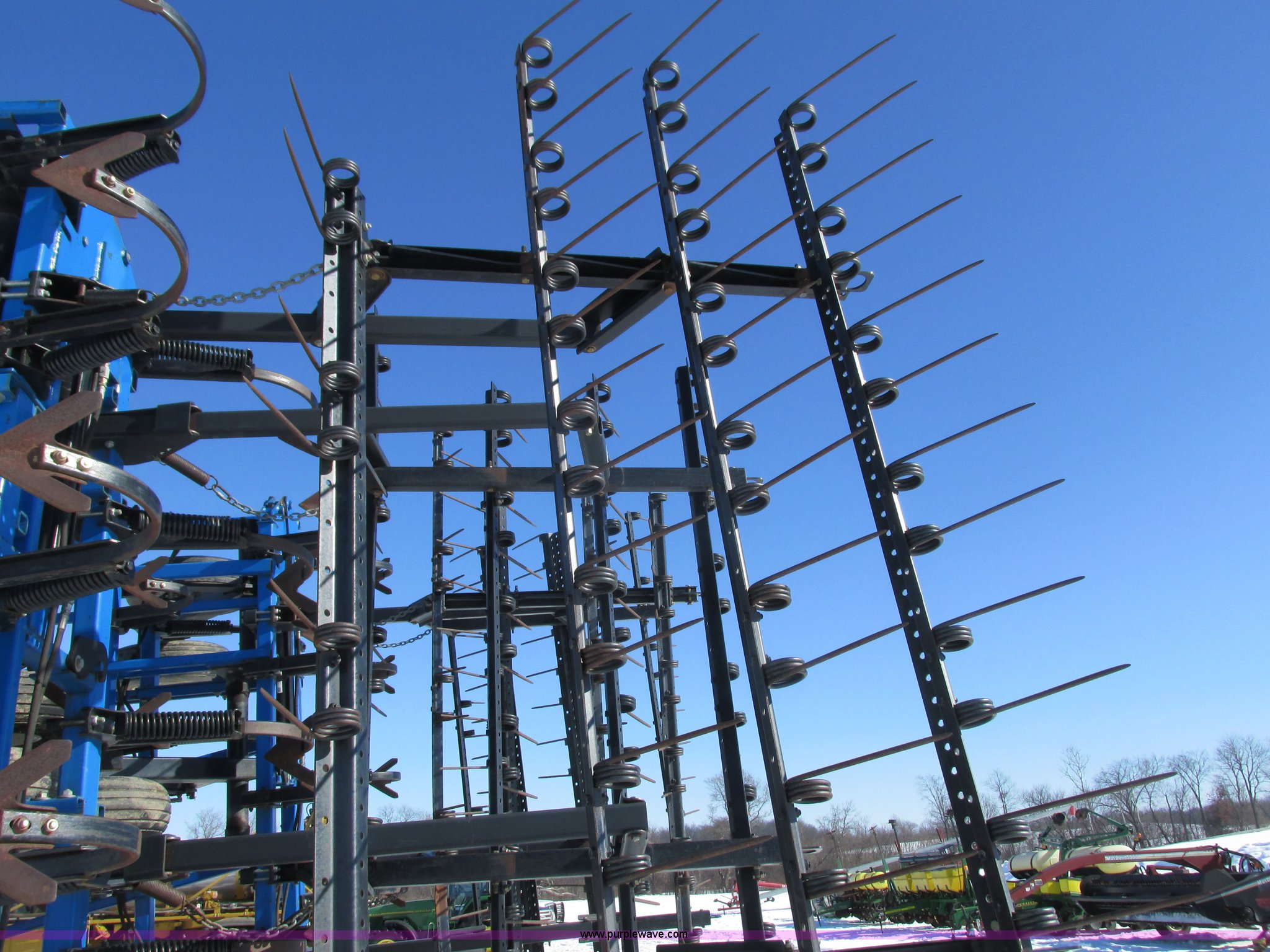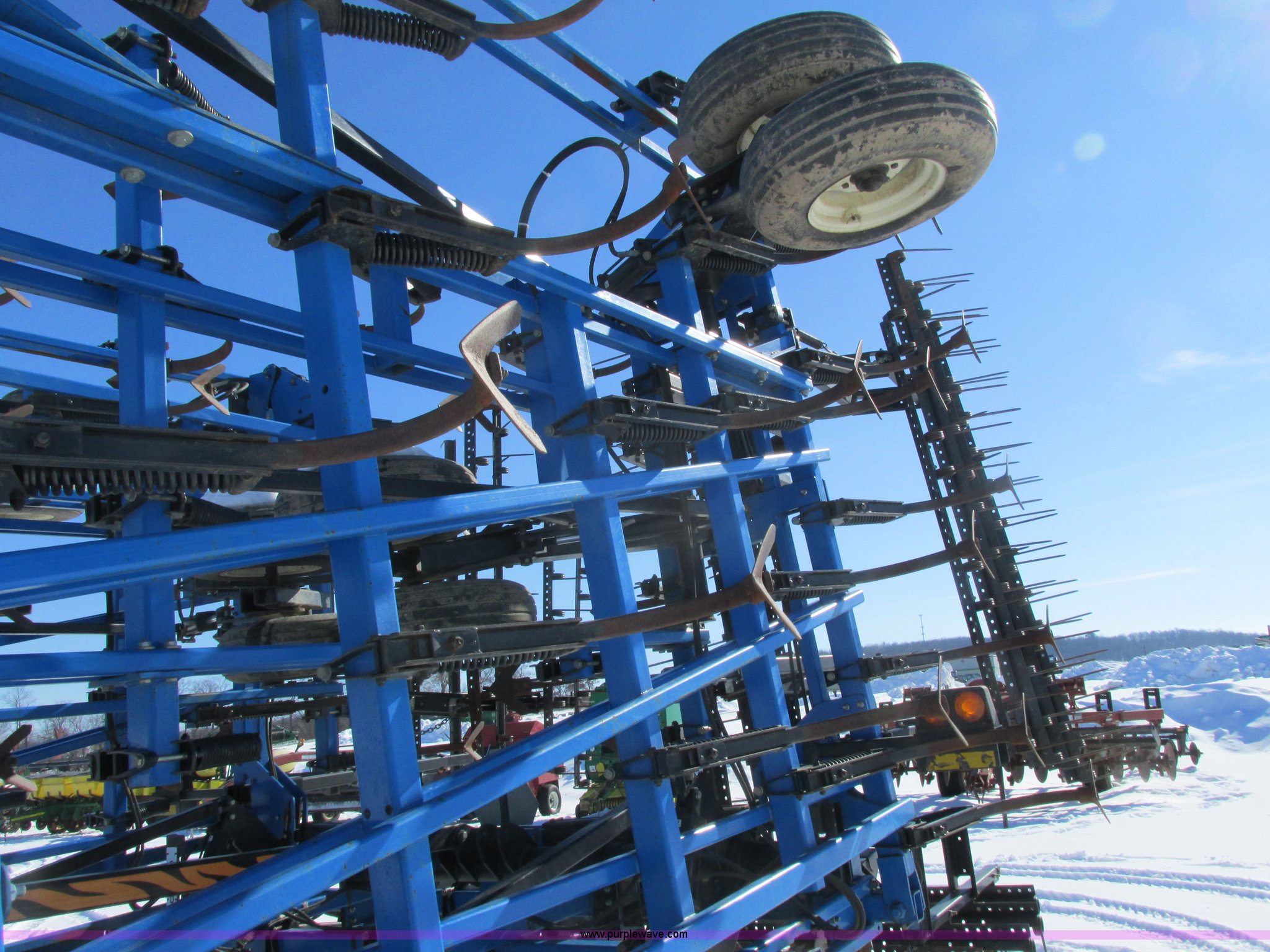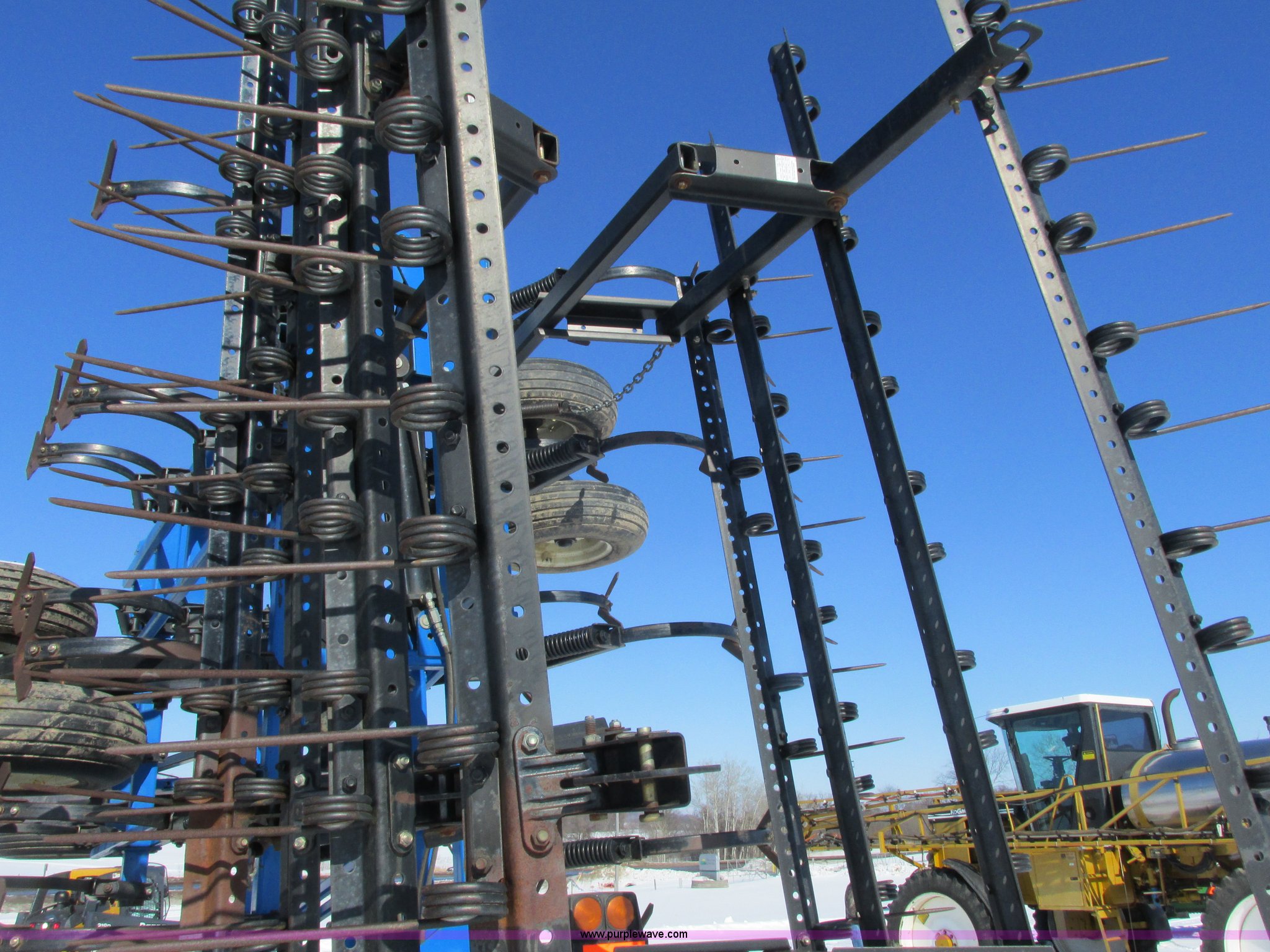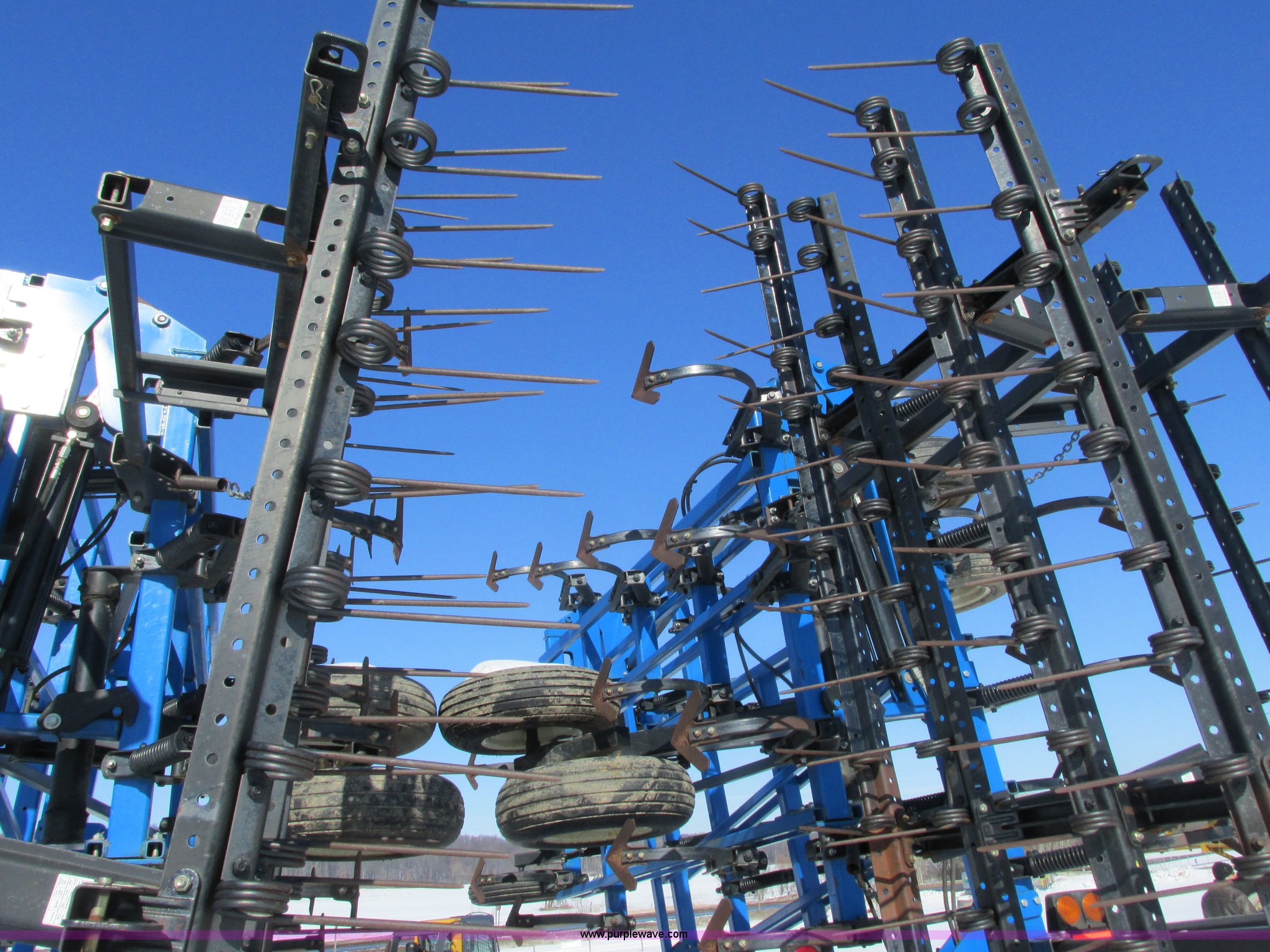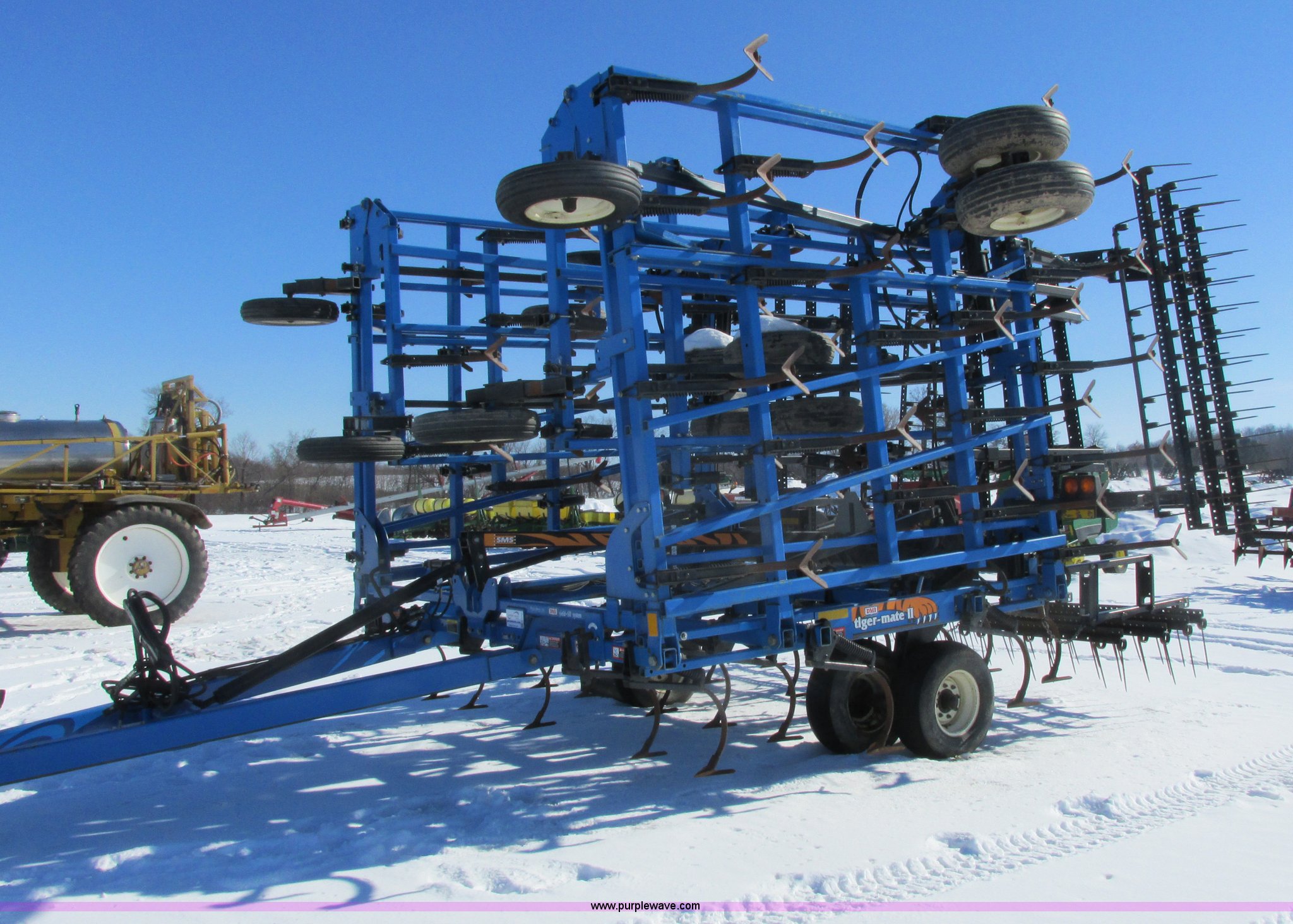 Purple Wave is selling a used Field Cultivator or Sweep Plow in Wisconsin. This item is a DMI Tigermate II field cultivator with the following: 45'W, Hydraulic raise and fold, (5) section bi-fold wings, Four bar coil toothed harrows with shovels, C-shank, (6) 6' sweeps, Road lights, Hydraulic lines, Pintle hitch, (4) 5.90-15SL guide wheels, (12) 11L-15 tires, Serial JFW0010124, Stock# 122422