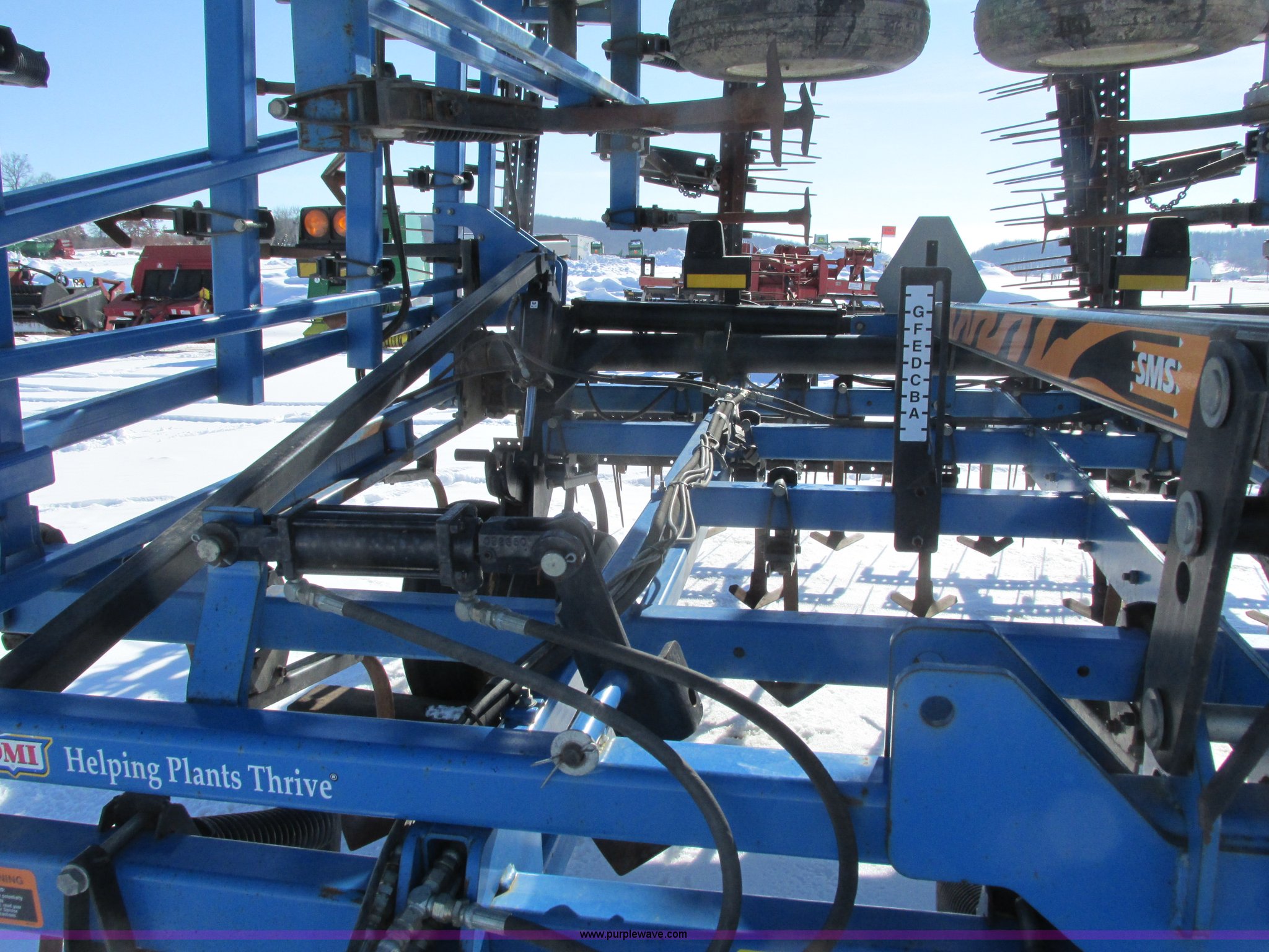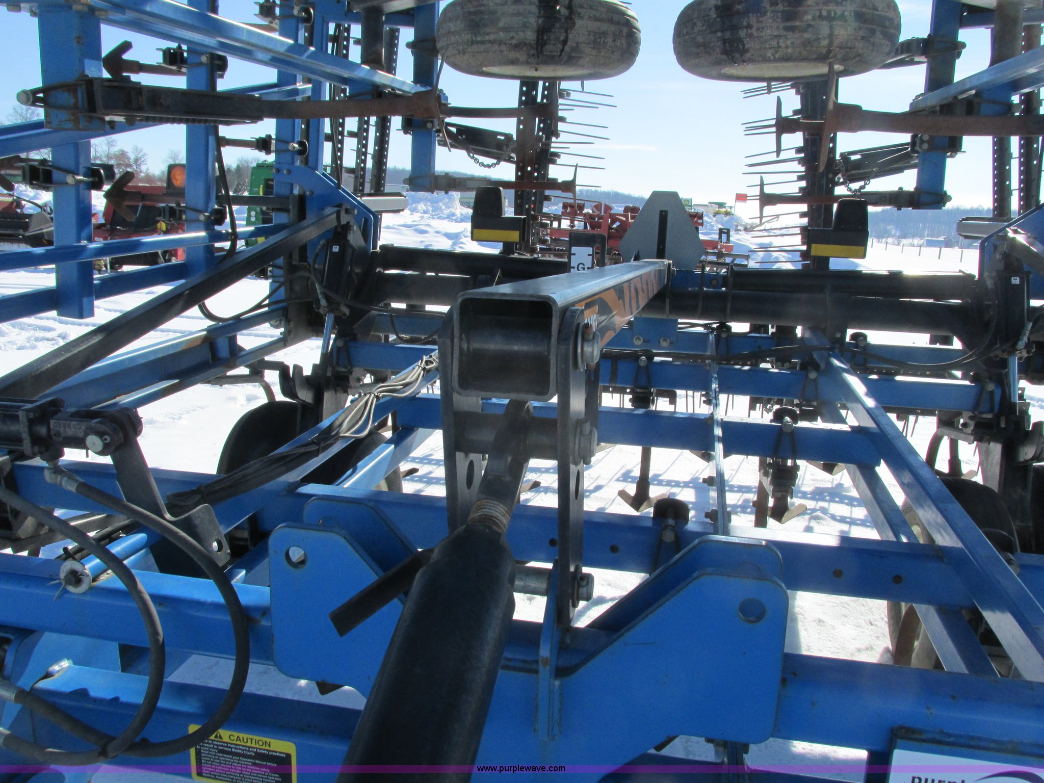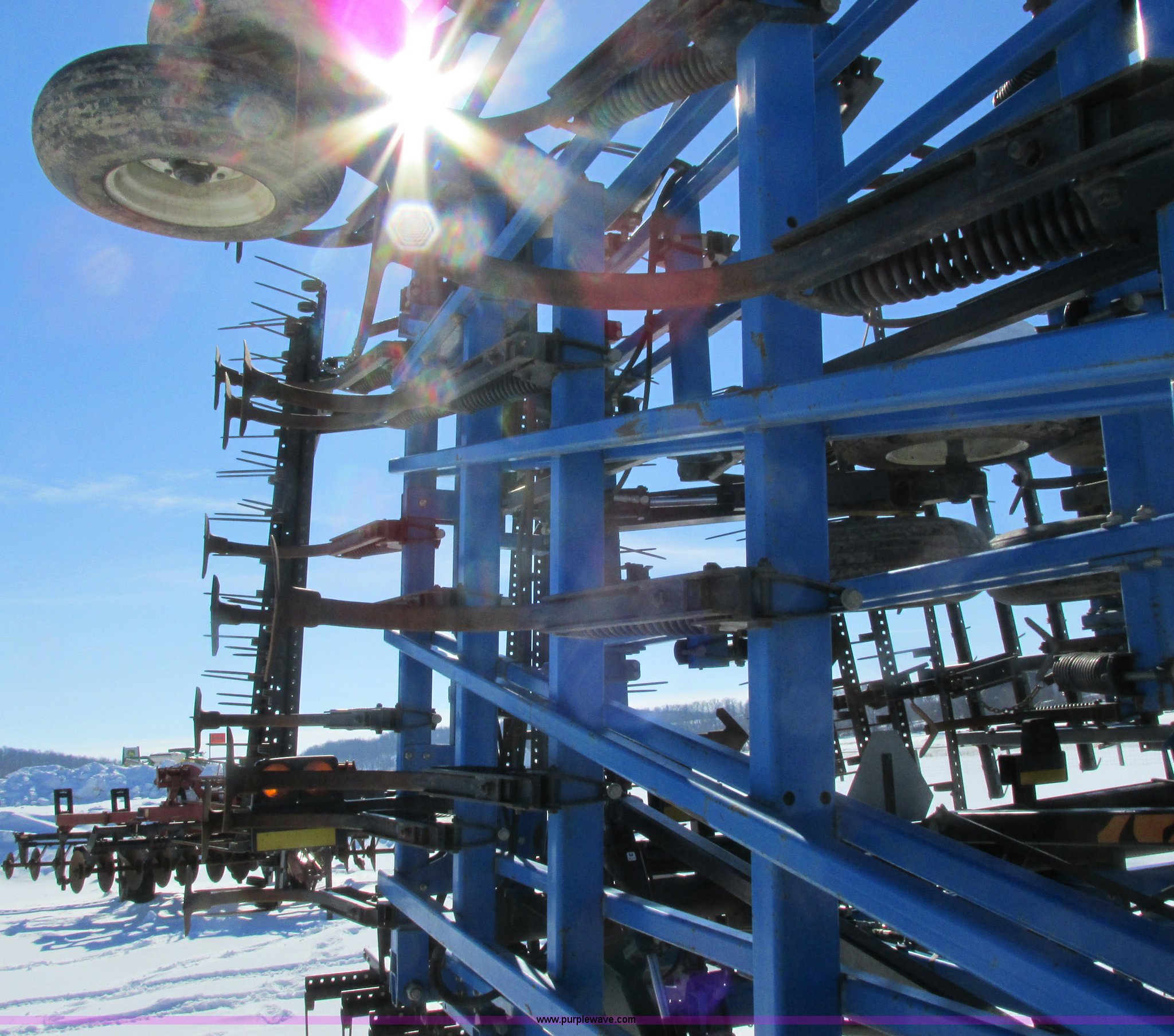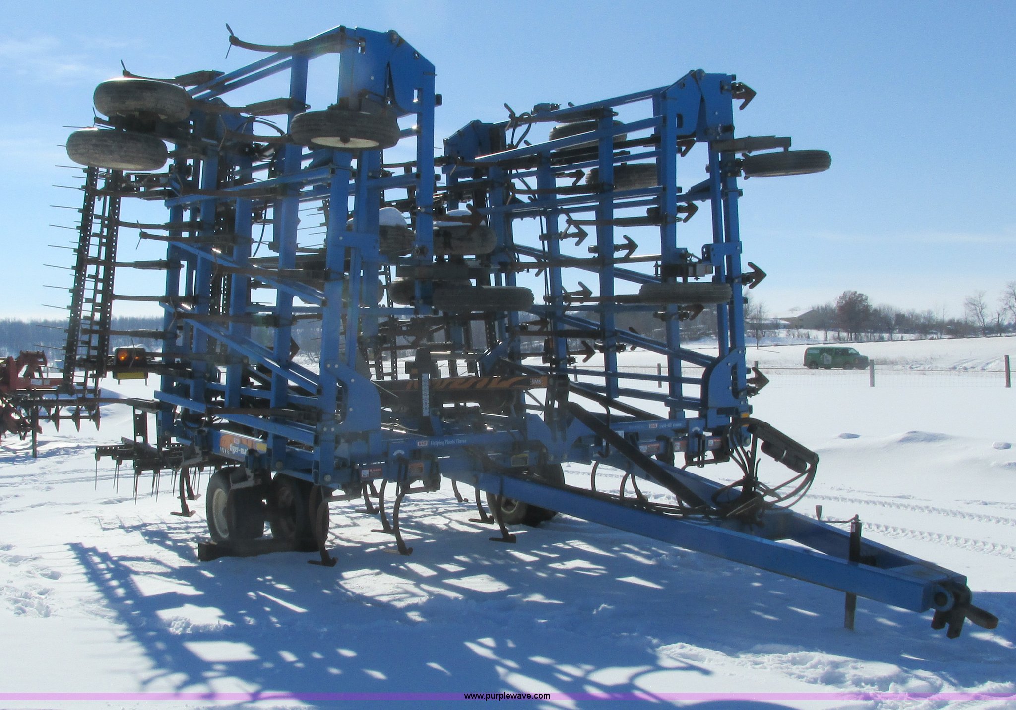 Purple Wave is selling a used Field Cultivator or Sweep Plow in Wisconsin. This item is a DMI Tigermate II field cultivator with the following: 45'W, Hydraulic raise and fold, (5) section bi-fold wings, Four bar coil toothed harrows with shovels, C-shank, (6) 6' sweeps, Road lights, Hydraulic lines, Pintle hitch, (4) 5.90-15SL guide wheels, (12) 11L-15 tires, Serial JFW0010124, Stock# 122422