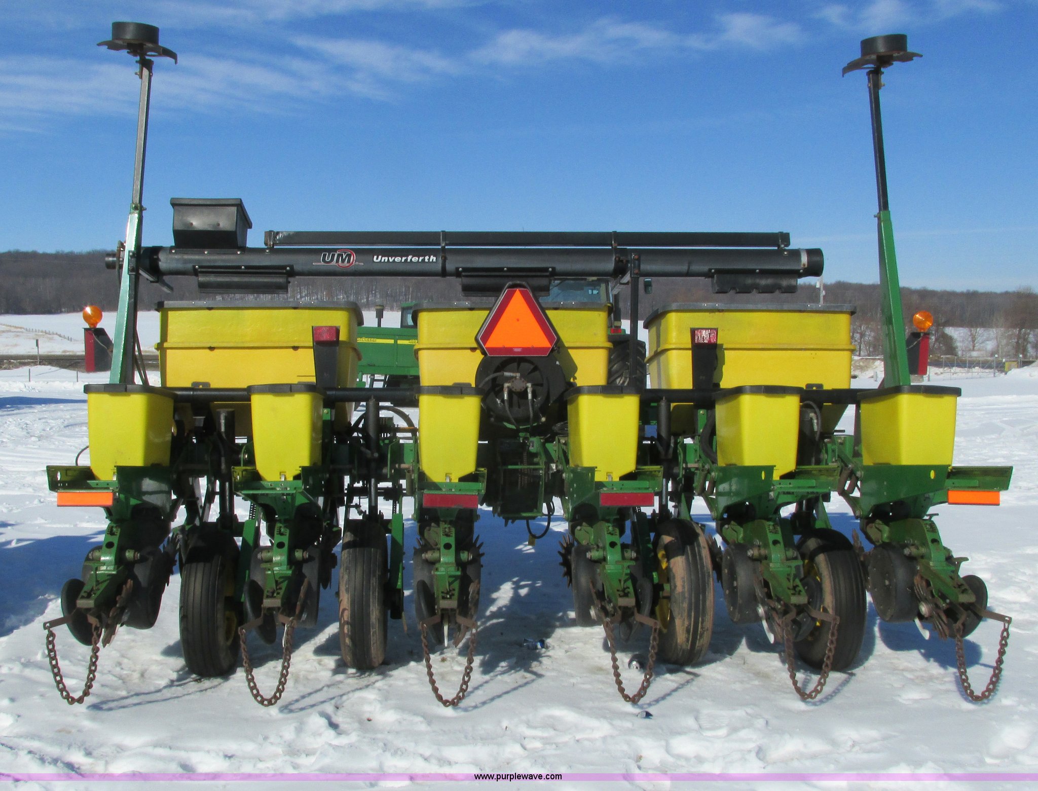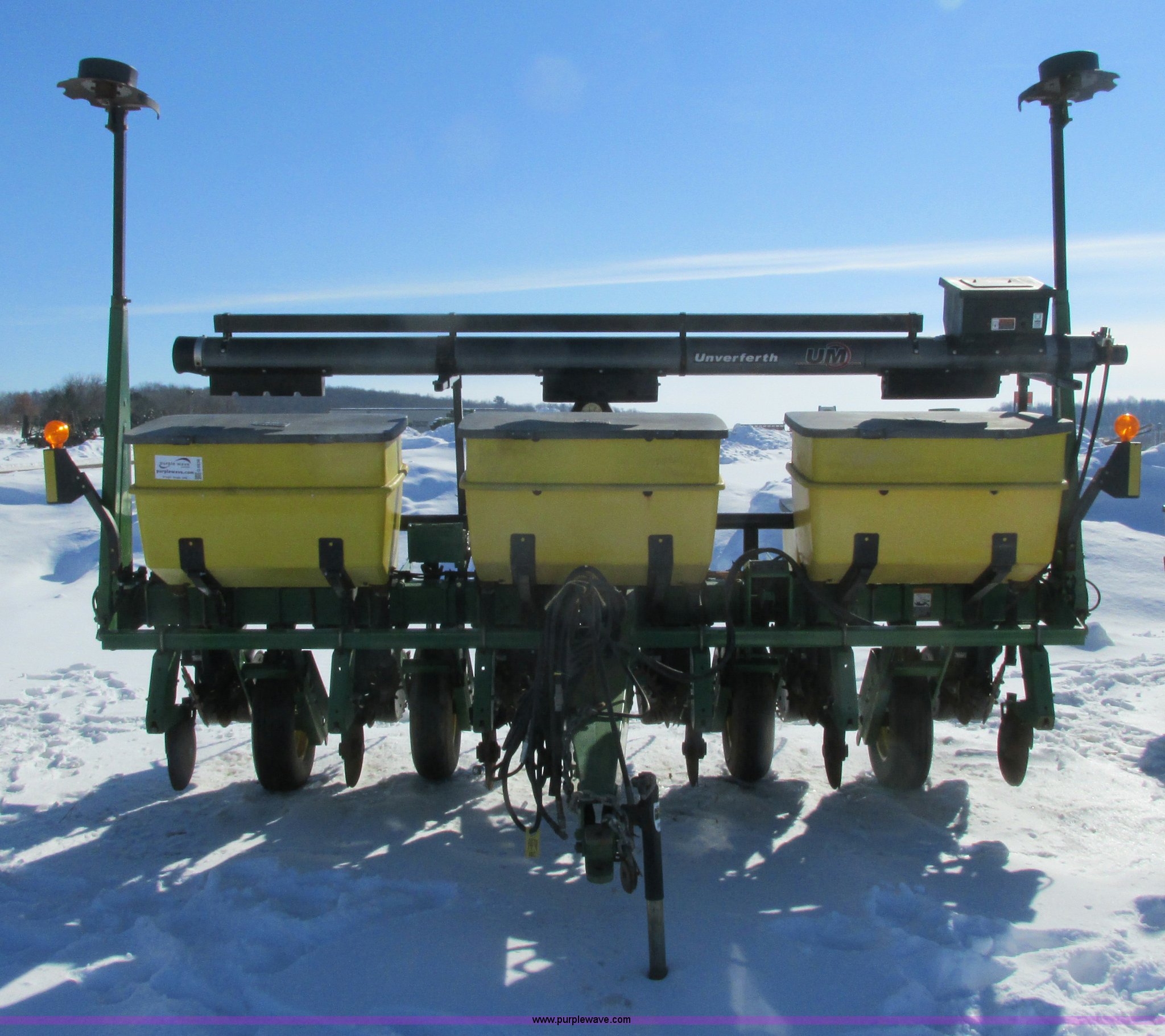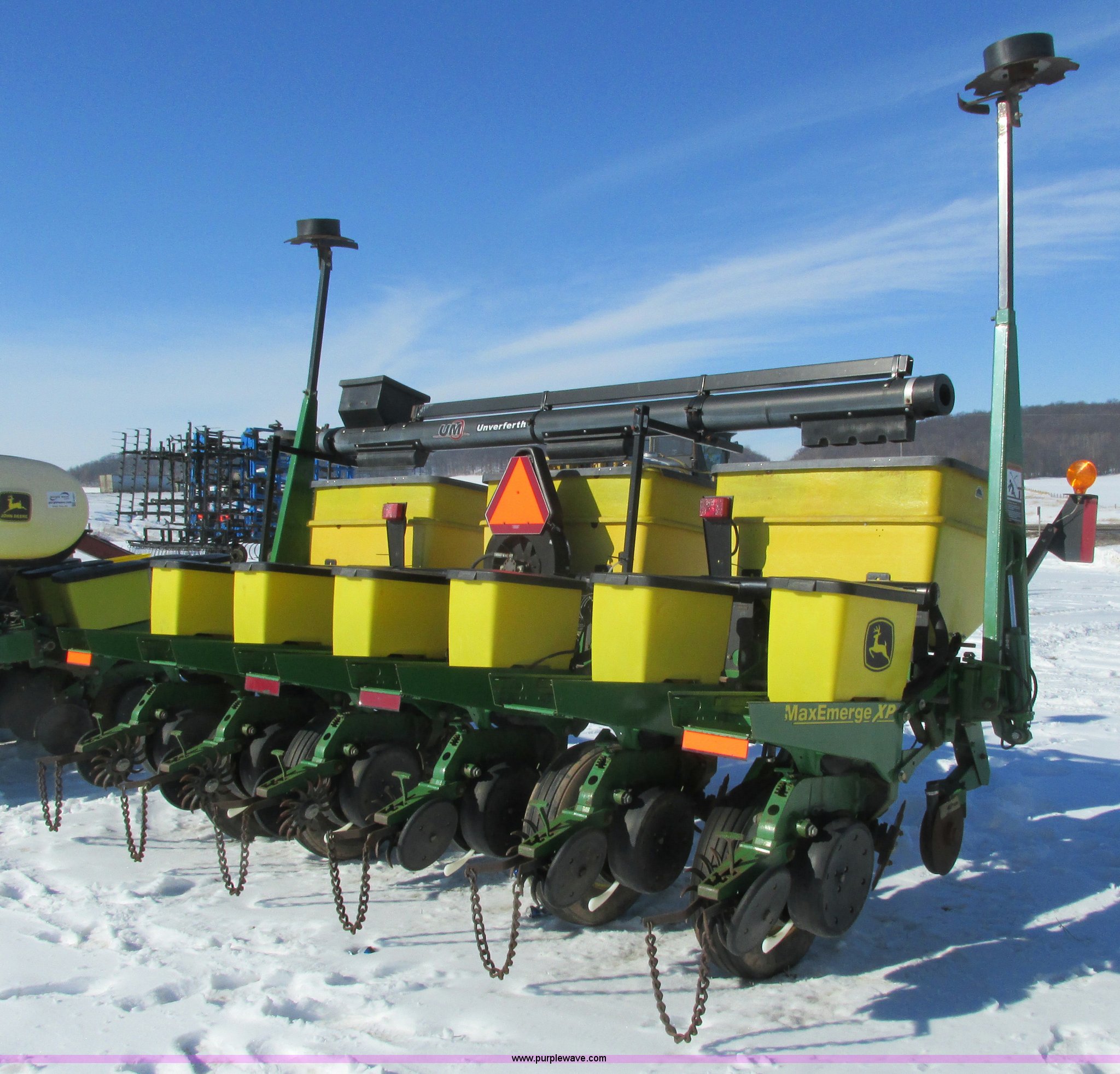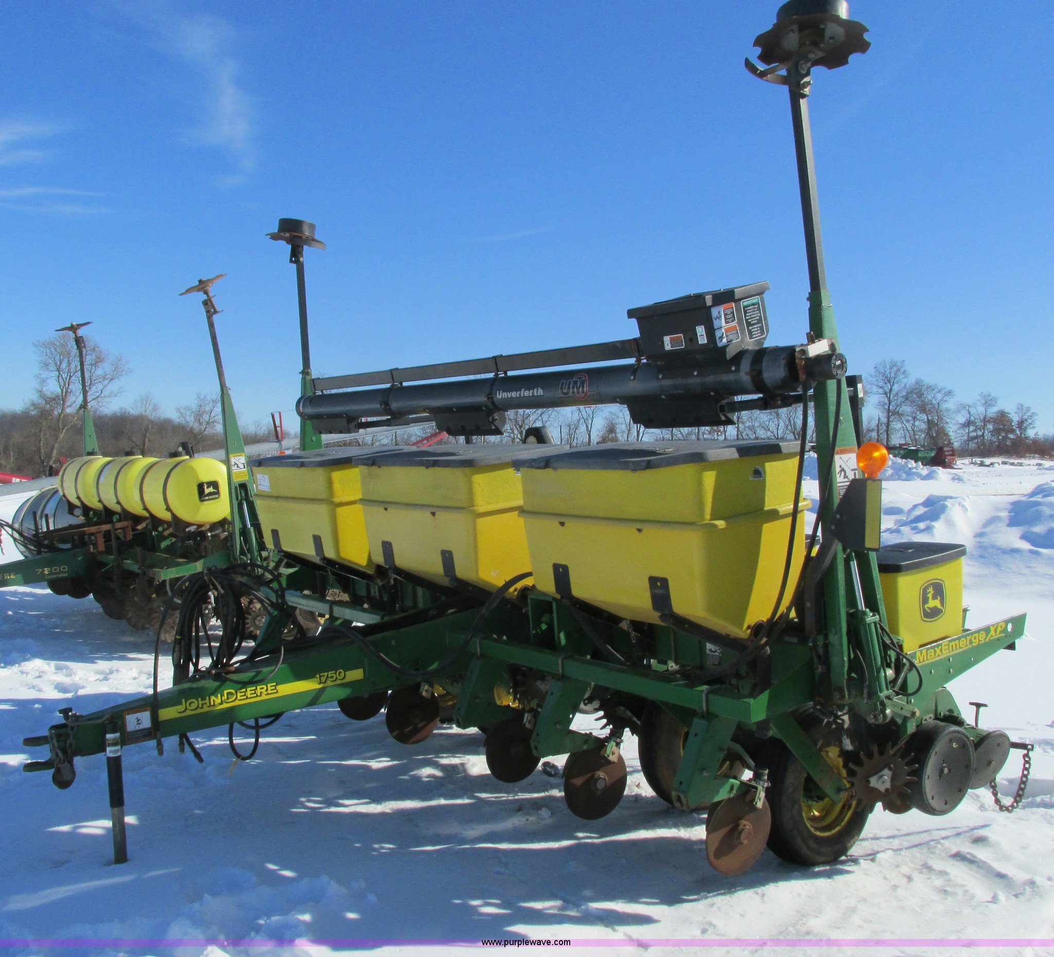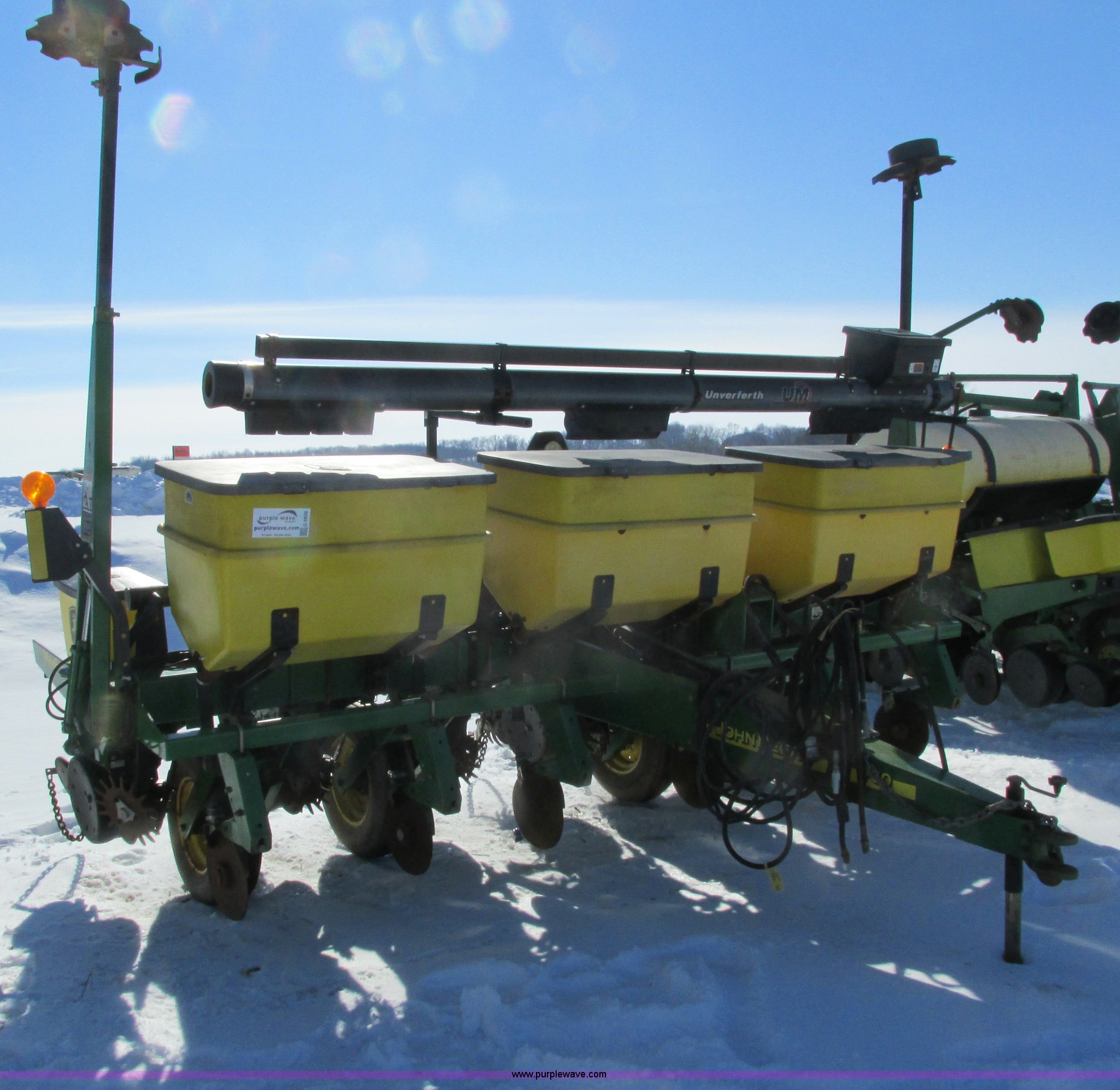 Purple Wave is selling a used Planter in Wisconsin. This item is a 2005 John Deere 1750 planter with the following: Six row, 30" spacing, Individual hoppers, Vacuum meters, Ground meter drive system, Corn disks, Yetter row cleaners, Dawn closing wheels, Dry liquid fertilizer, (3) hoppers, Unverfeath cross auger, Double disk fertilizer openers, Fertilizer hopper extensions, John Deere 150 monitor, Maxemerge XP row units, Serial A01750R710920, Stock# 119450