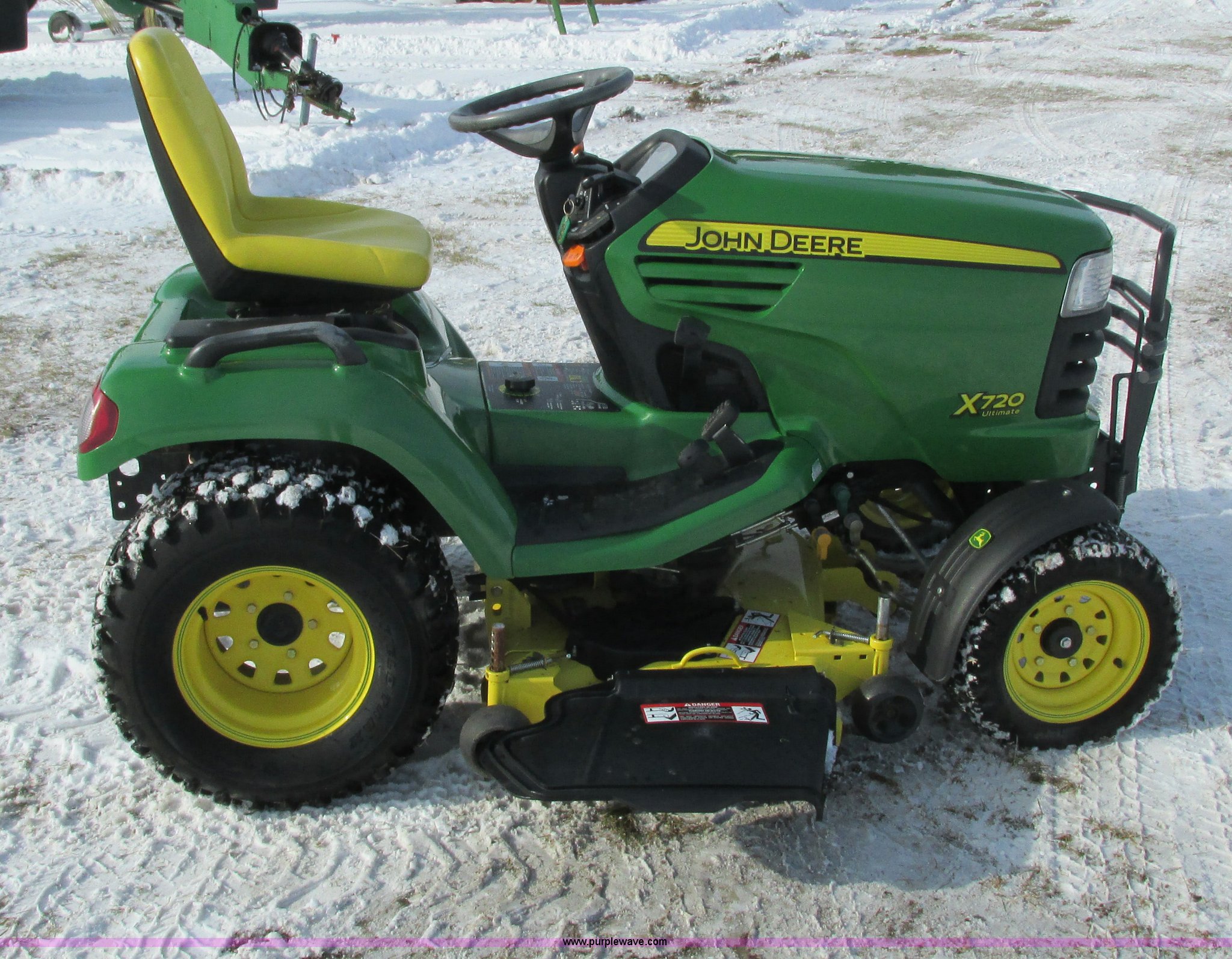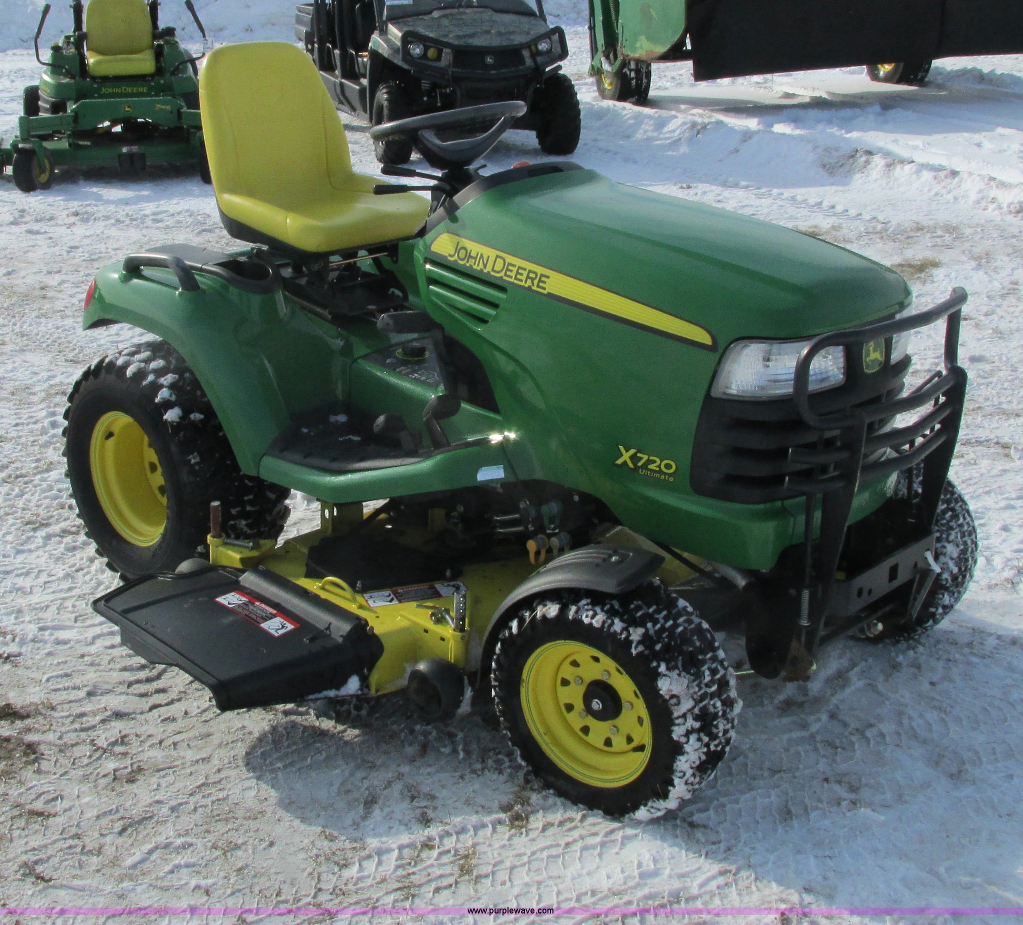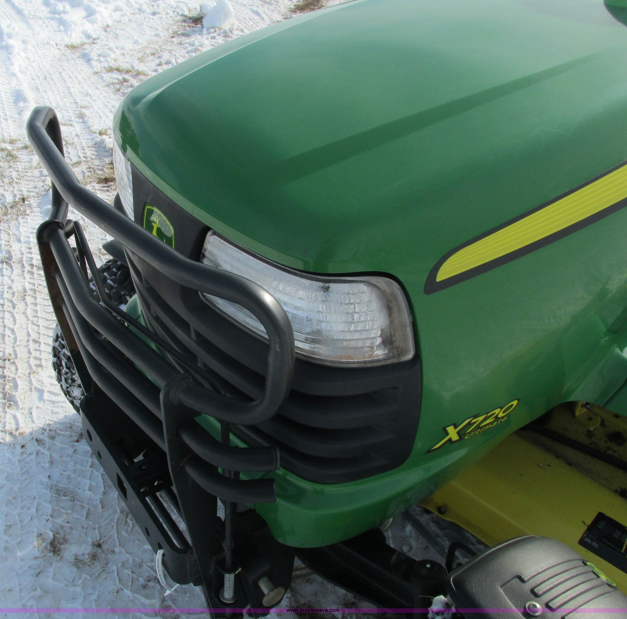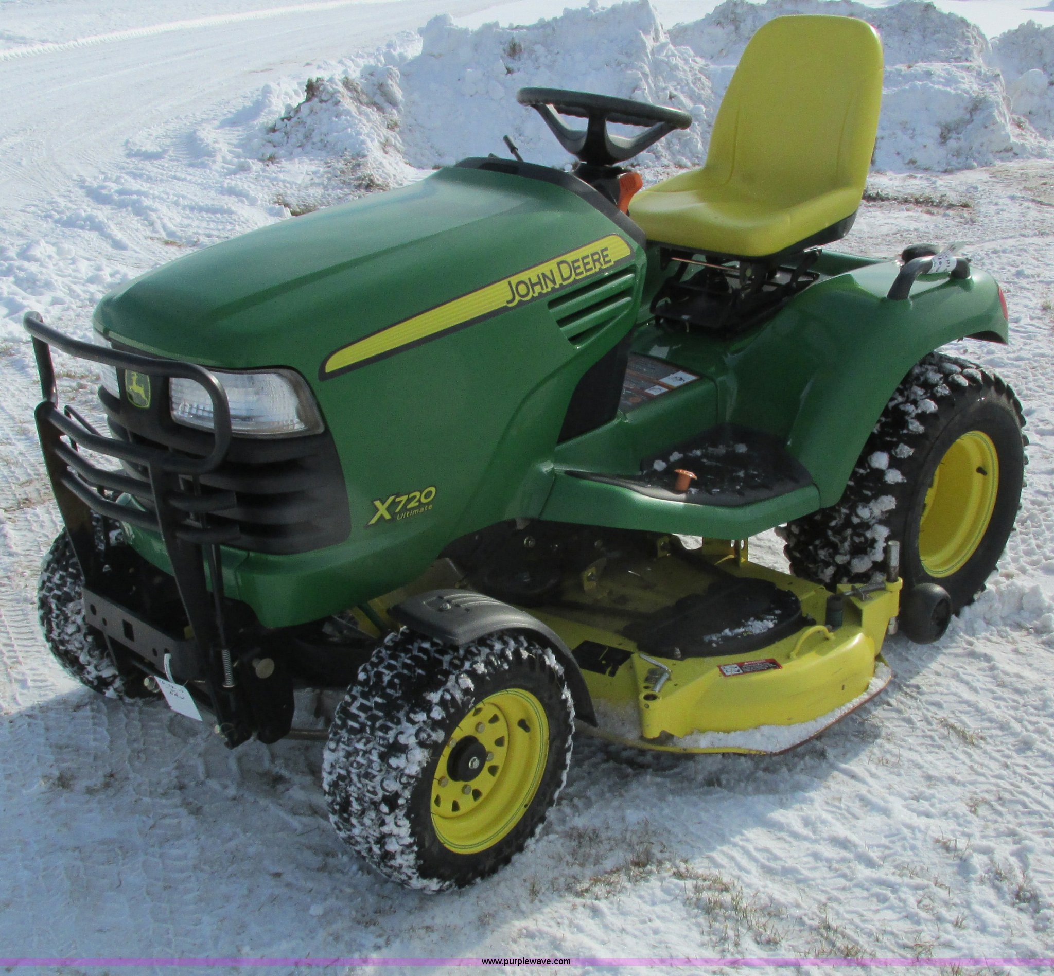 Purple Wave is selling a used Lawn Mower in Wisconsin. This item is a 2009 John Deere X720 Ultimate lawn mower with the following: 422 hours on meter, 54" cut, Kawasaki 745cc gas engine, Hydrostatic transmission, Cruise, Spring suspension seat, Front fenders, Power steering, Front brush guard, Rear hitch, (2) hydraulic remotes, 8x8.5-10 front tires, 26x12-12 rear tires, Serial M0X720A040442, Stock# 115473