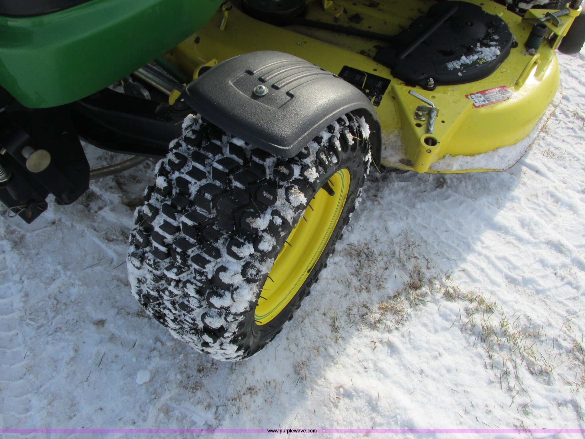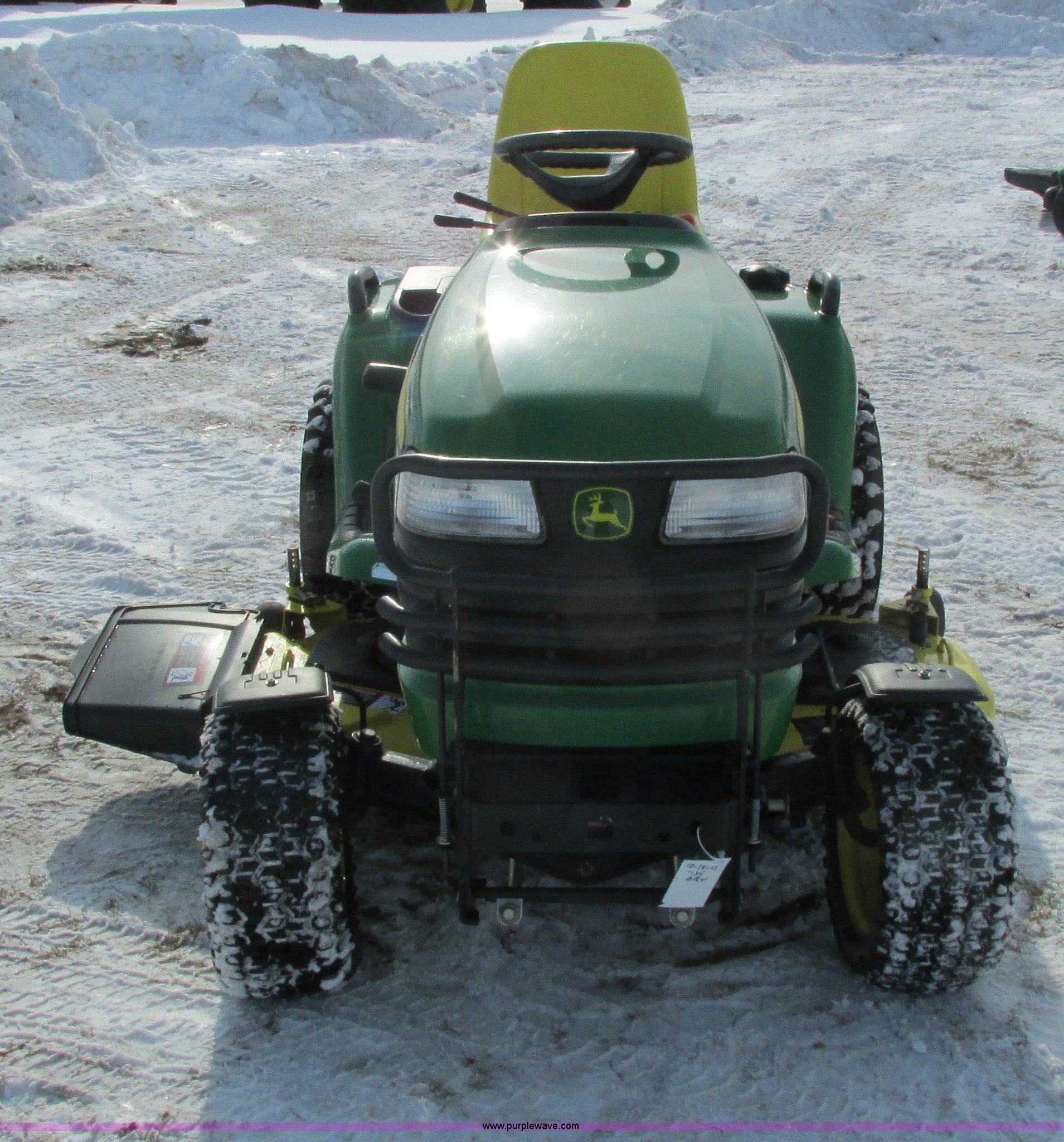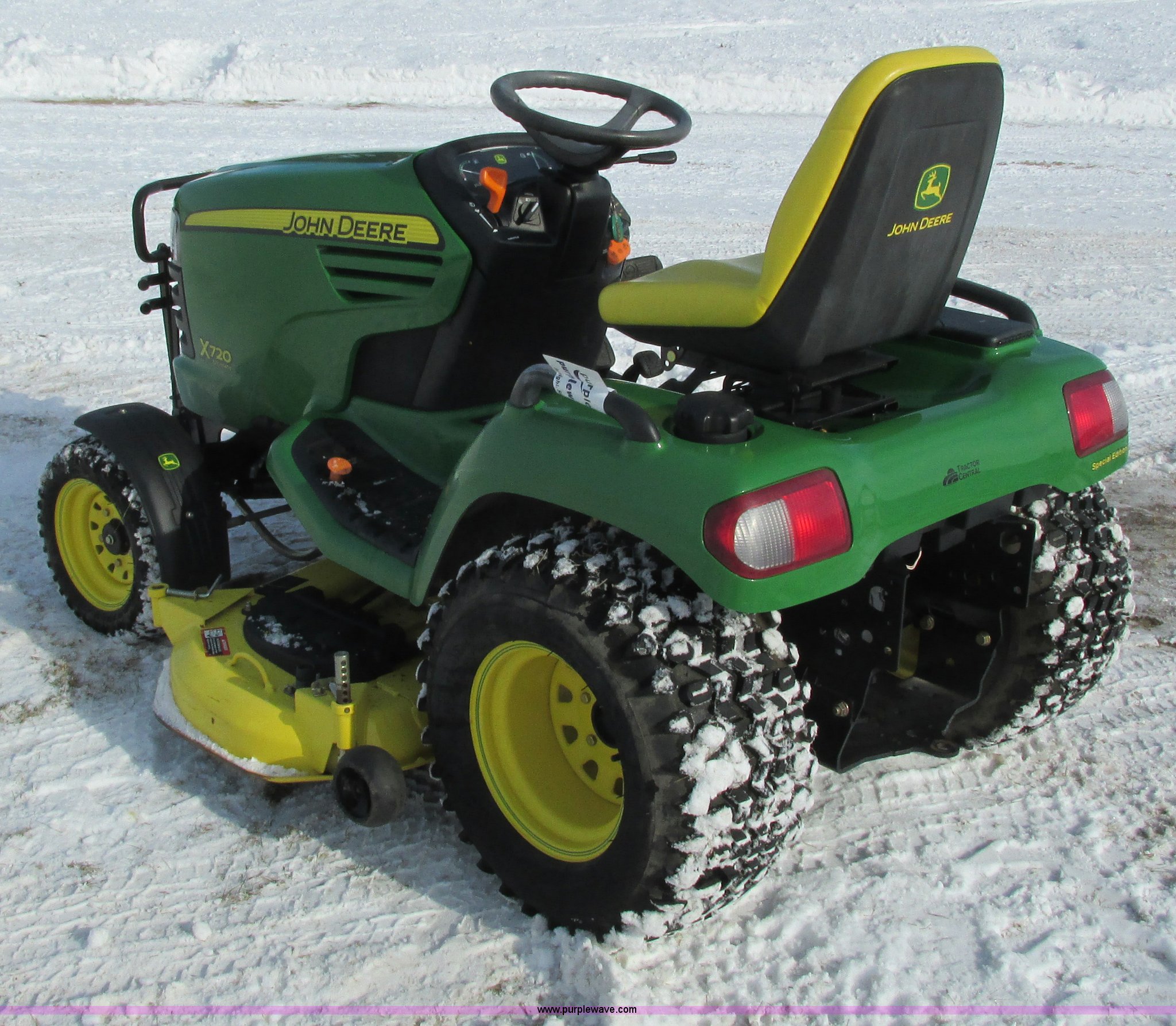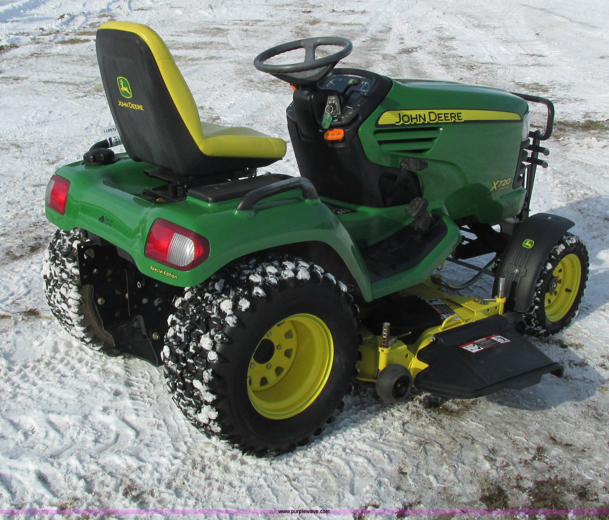 Purple Wave is selling a used Lawn Mower in Wisconsin. This item is a 2009 John Deere X720 Ultimate lawn mower with the following: 422 hours on meter, 54" cut, Kawasaki 745cc gas engine, Hydrostatic transmission, Cruise, Spring suspension seat, Front fenders, Power steering, Front brush guard, Rear hitch, (2) hydraulic remotes, 8x8.5-10 front tires, 26x12-12 rear tires, Serial M0X720A040442, Stock# 115473