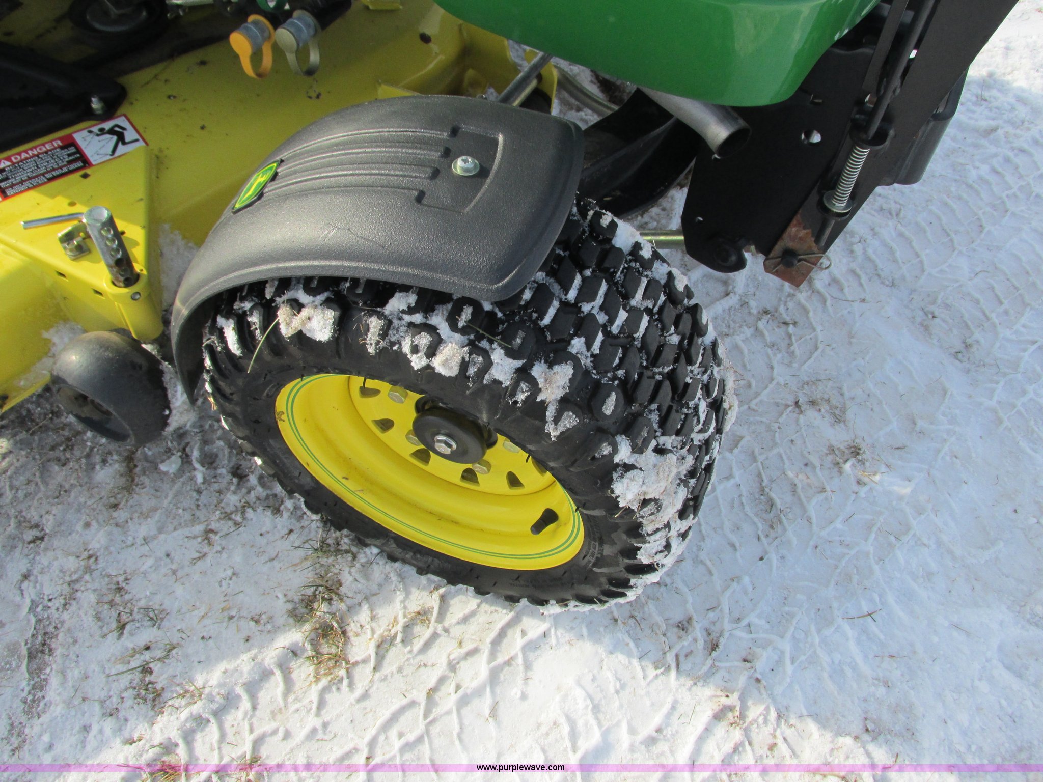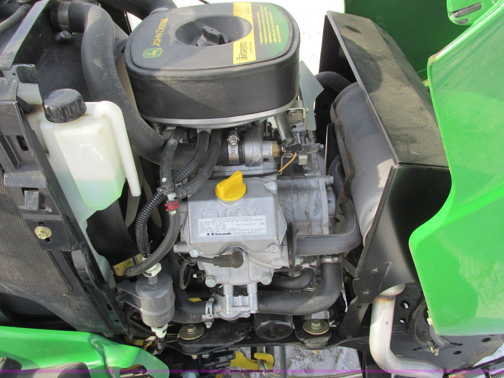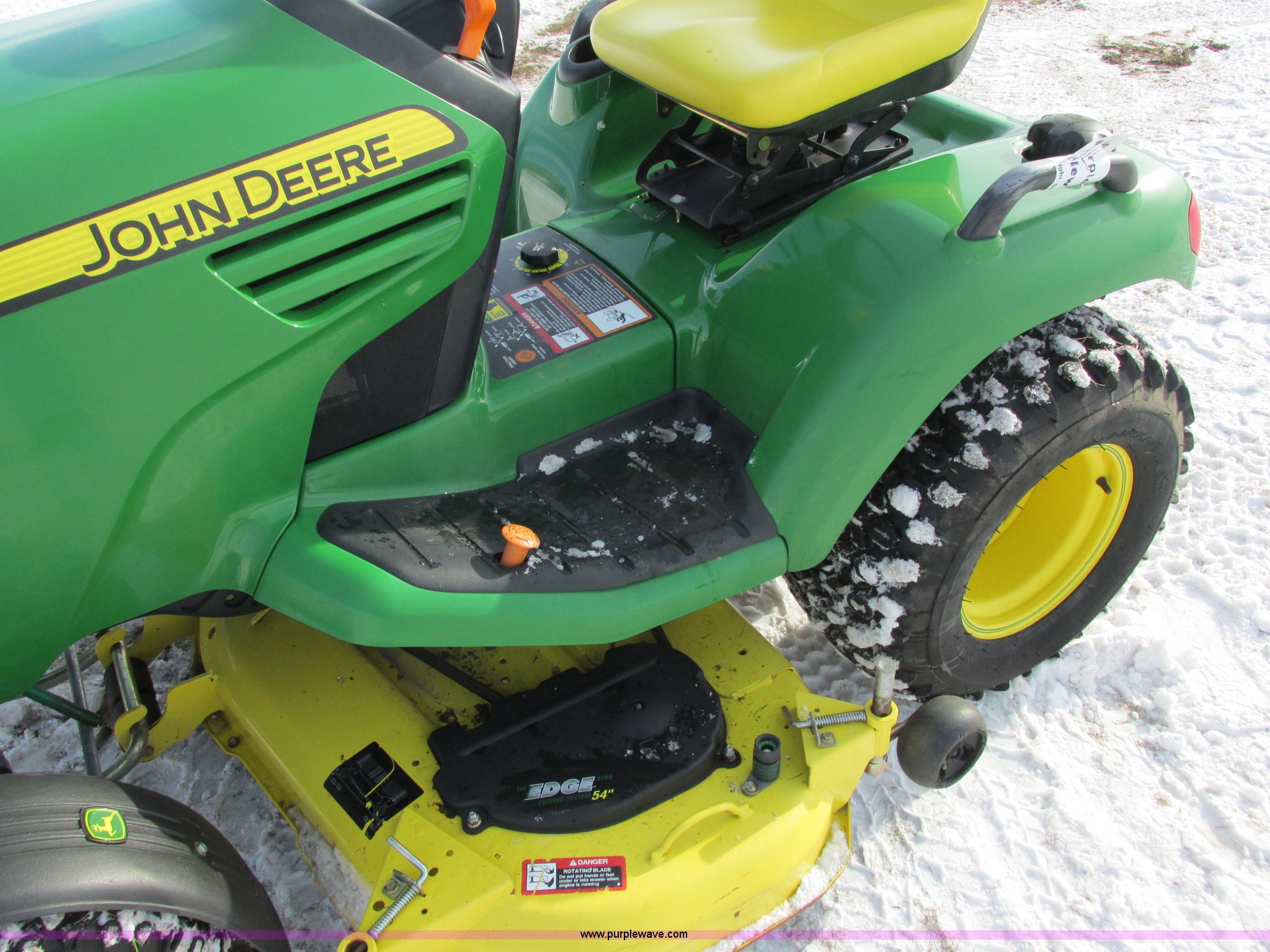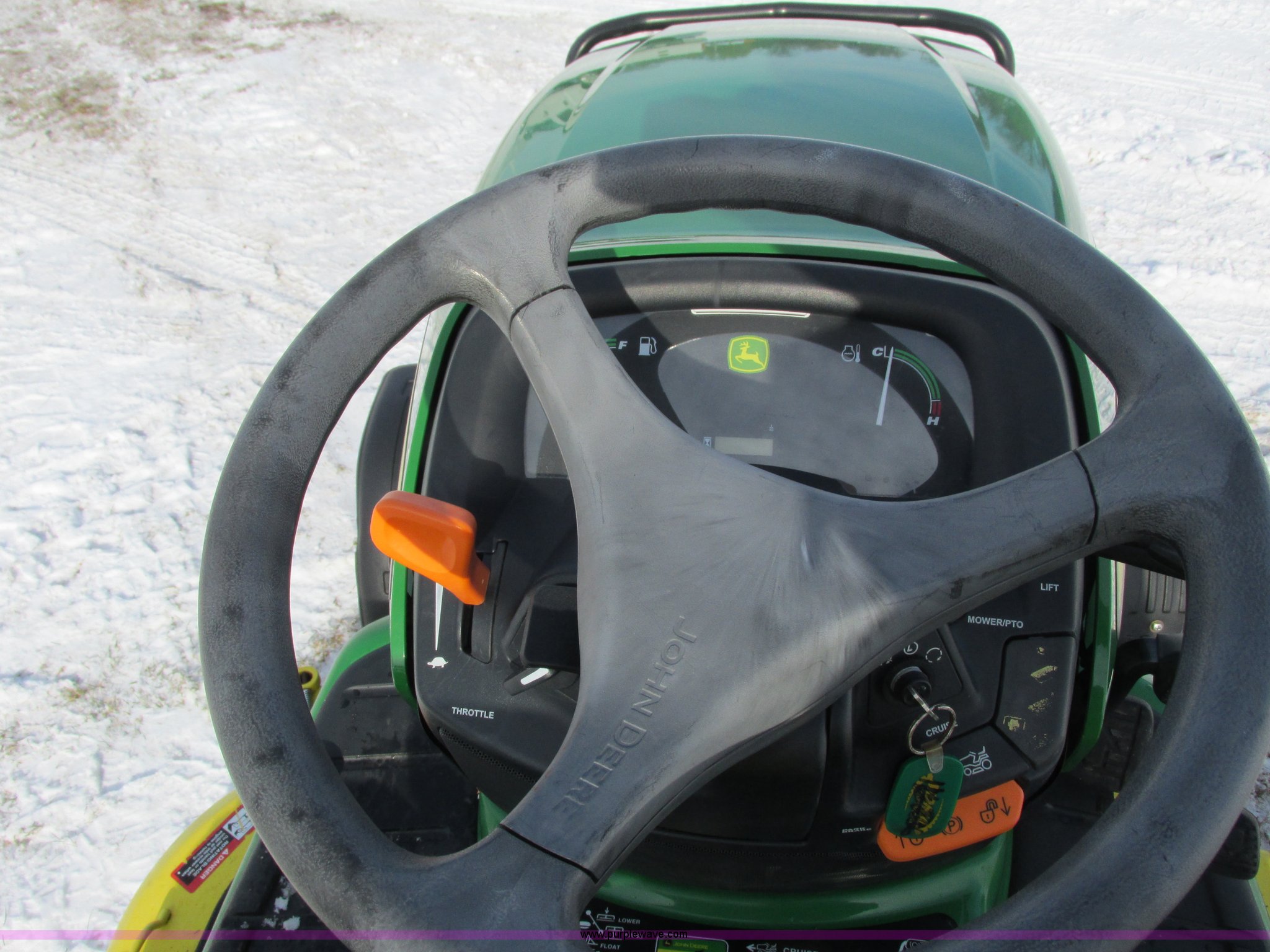 Purple Wave is selling a used Lawn Mower in Wisconsin. This item is a 2009 John Deere X720 Ultimate lawn mower with the following: 422 hours on meter, 54" cut, Kawasaki 745cc gas engine, Hydrostatic transmission, Cruise, Spring suspension seat, Front fenders, Power steering, Front brush guard, Rear hitch, (2) hydraulic remotes, 8x8.5-10 front tires, 26x12-12 rear tires, Serial M0X720A040442, Stock# 115473