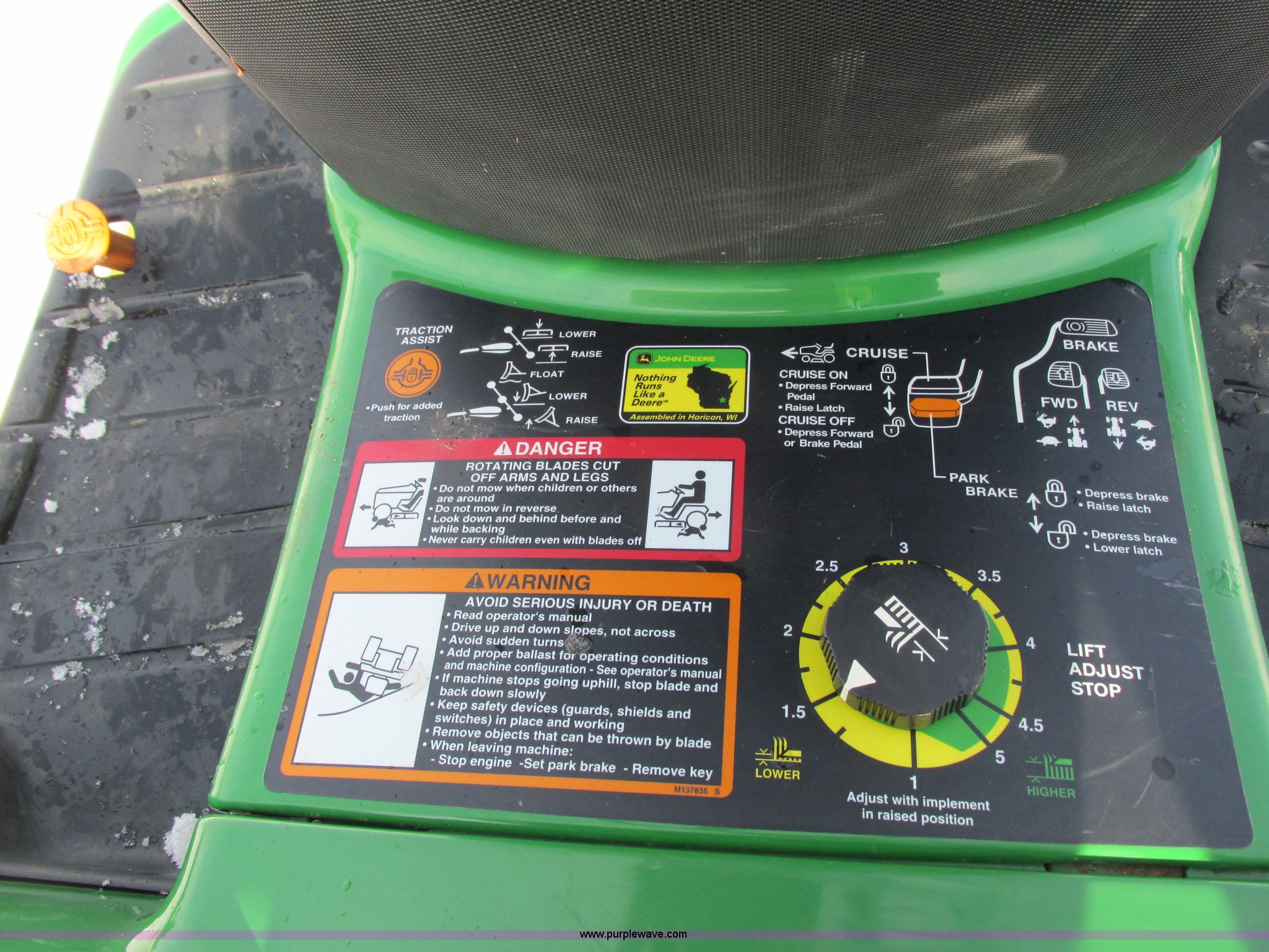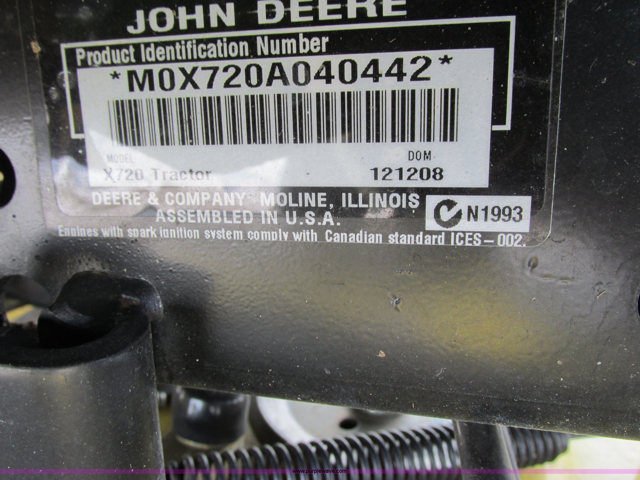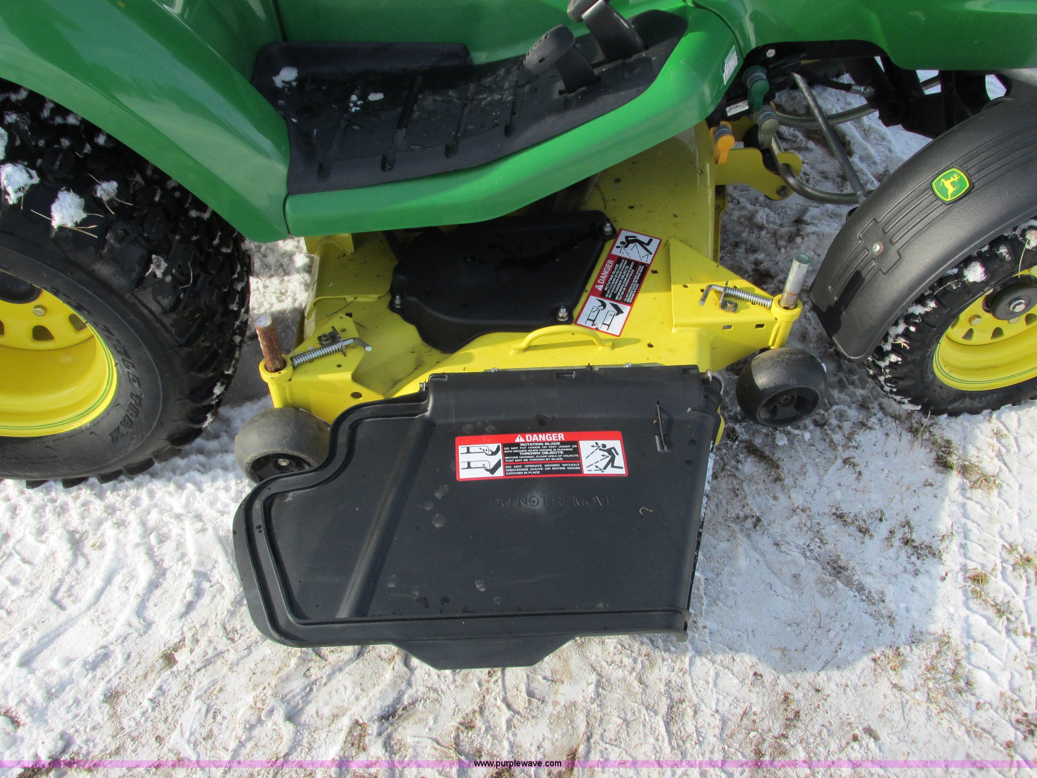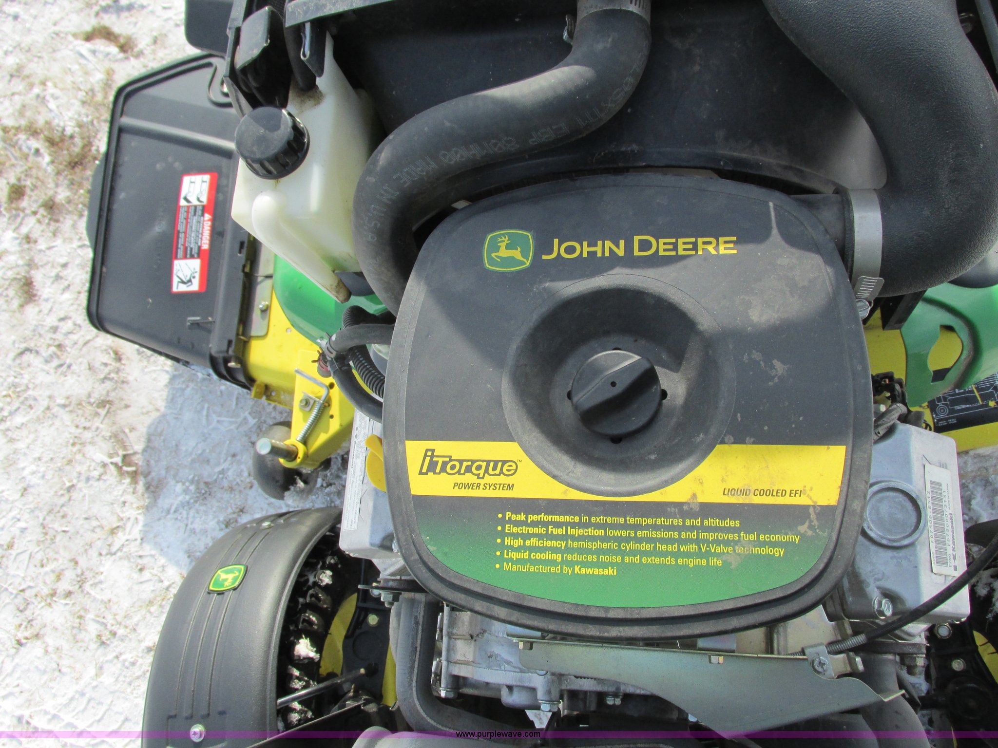 Purple Wave is selling a used Lawn Mower in Wisconsin. This item is a 2009 John Deere X720 Ultimate lawn mower with the following: 422 hours on meter, 54" cut, Kawasaki 745cc gas engine, Hydrostatic transmission, Cruise, Spring suspension seat, Front fenders, Power steering, Front brush guard, Rear hitch, (2) hydraulic remotes, 8x8.5-10 front tires, 26x12-12 rear tires, Serial M0X720A040442, Stock# 115473
