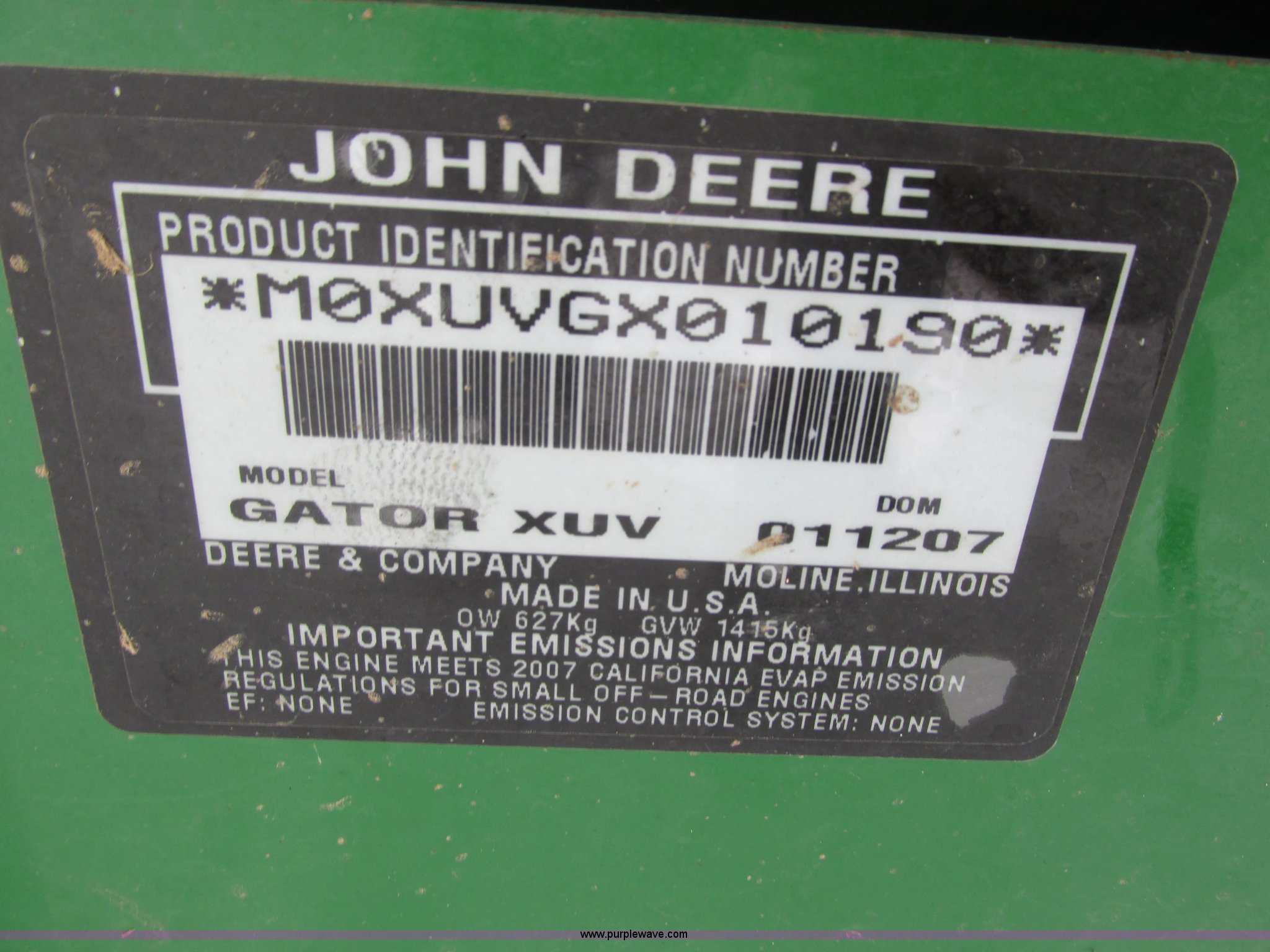 2007 John Deere 620i Gator utility vehicle. 662 hours on meter, Kawasaki EFI gas engine, Hi/Low forward gears plus reverse, Four wheel drive, OROPS, Manual lift bed, Lights, Receiver hitch, 25x11.00-12 tires, Cracked right front fender, Stock# 129499. Item specific inquires should be directed to Mike Kroeger at 715.205.8410. M0XUVGX010190. Tractor Central - Cameron. 1528 20 1/2 St. Cameron, WI 54822