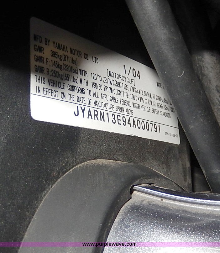 Purple Wave is selling a used Motorcycle in Kansas. This item is a 2004 Yamaha YZF-R1 motorcycle with the following: 24,642 miles on odometer, 998cc gas engine, Engine turns over, Foot pegs, Disk brakes, 120/70ZR17 front tire, 190/50ZR17 rear tire, Unknown running condition