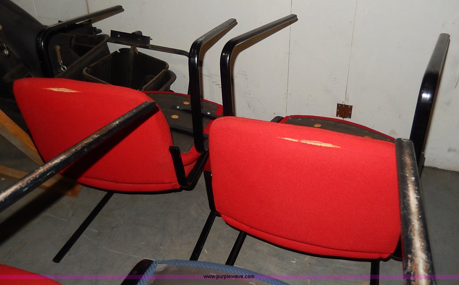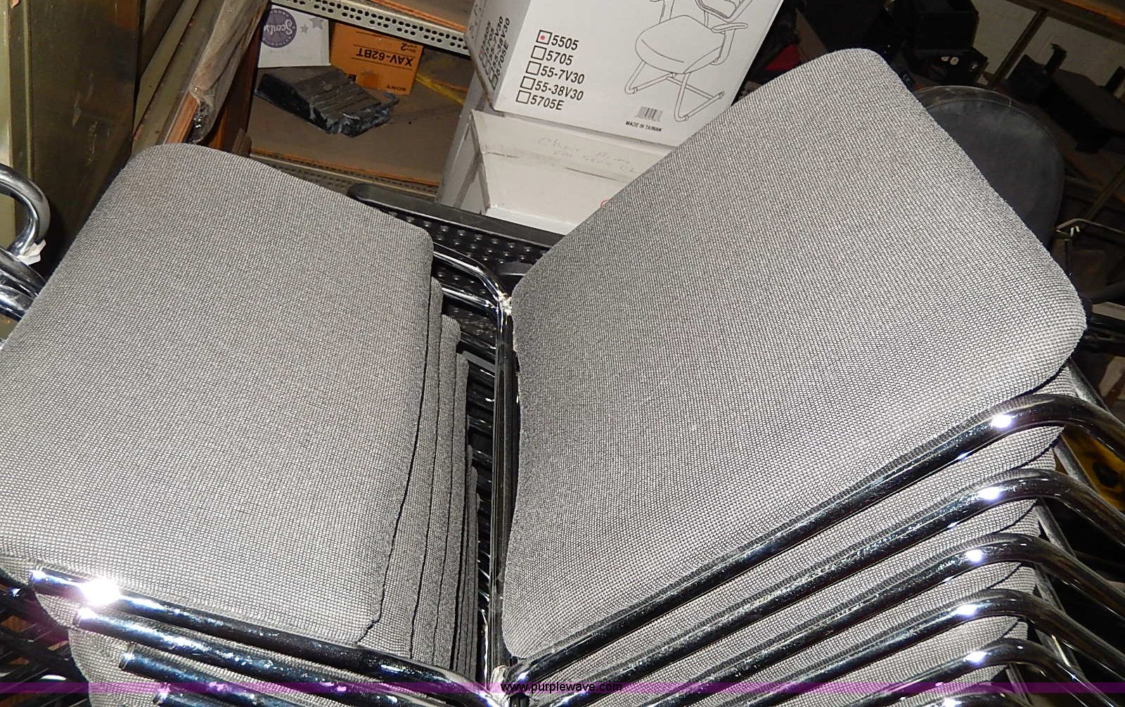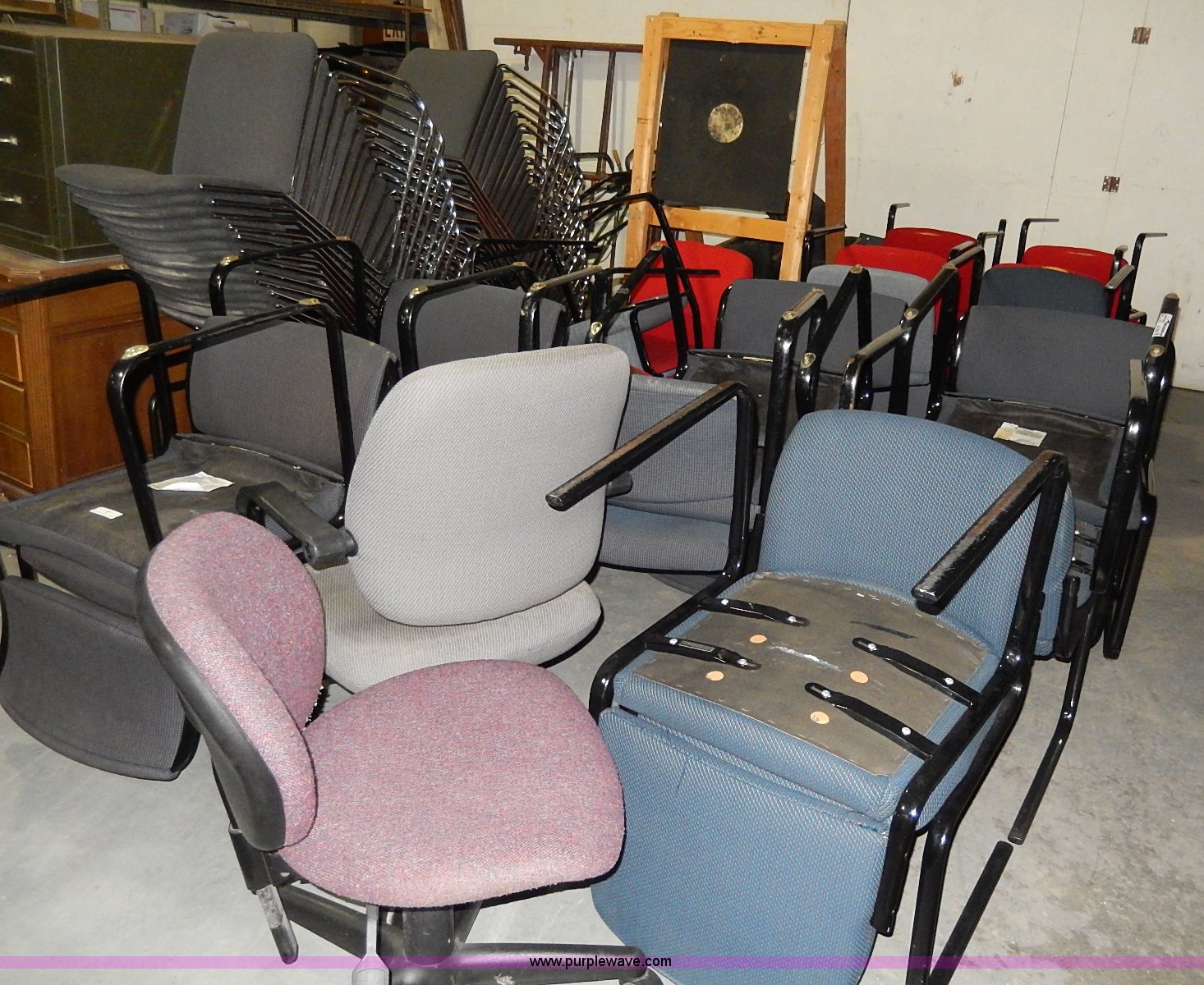 Purple Wave is selling a used Furniture in Kansas. This item is a Approximately 60 assorted chairs with the following: Cloth seats and backs, Some have cosmetic damage, Racks are not included
