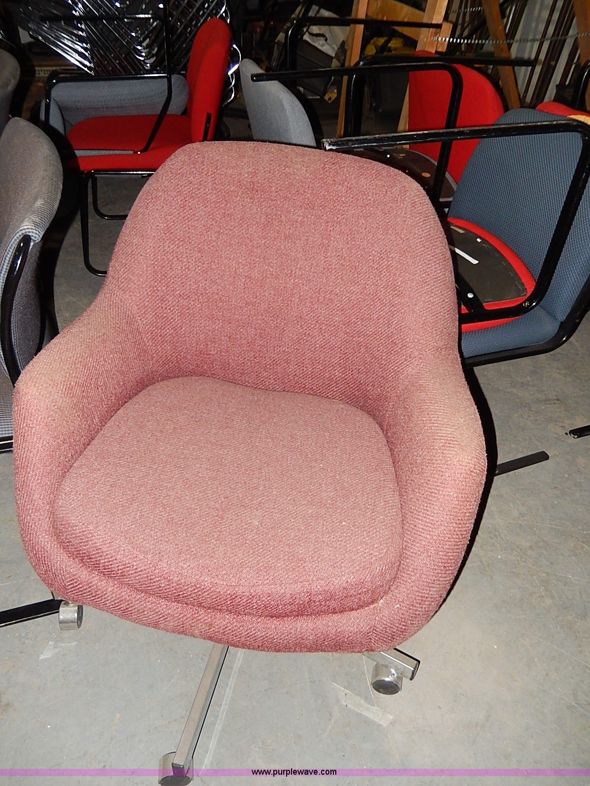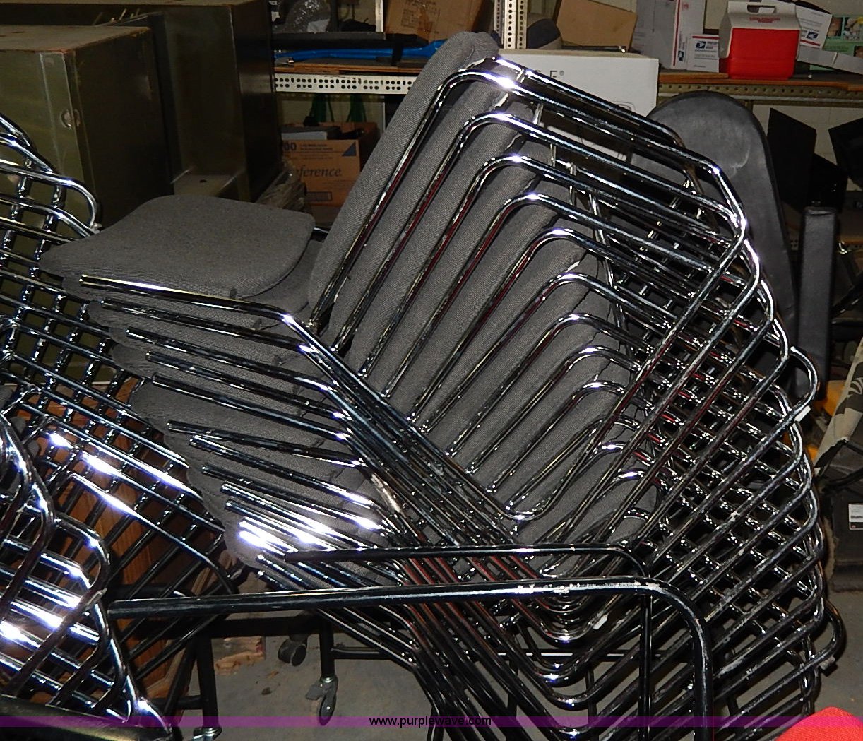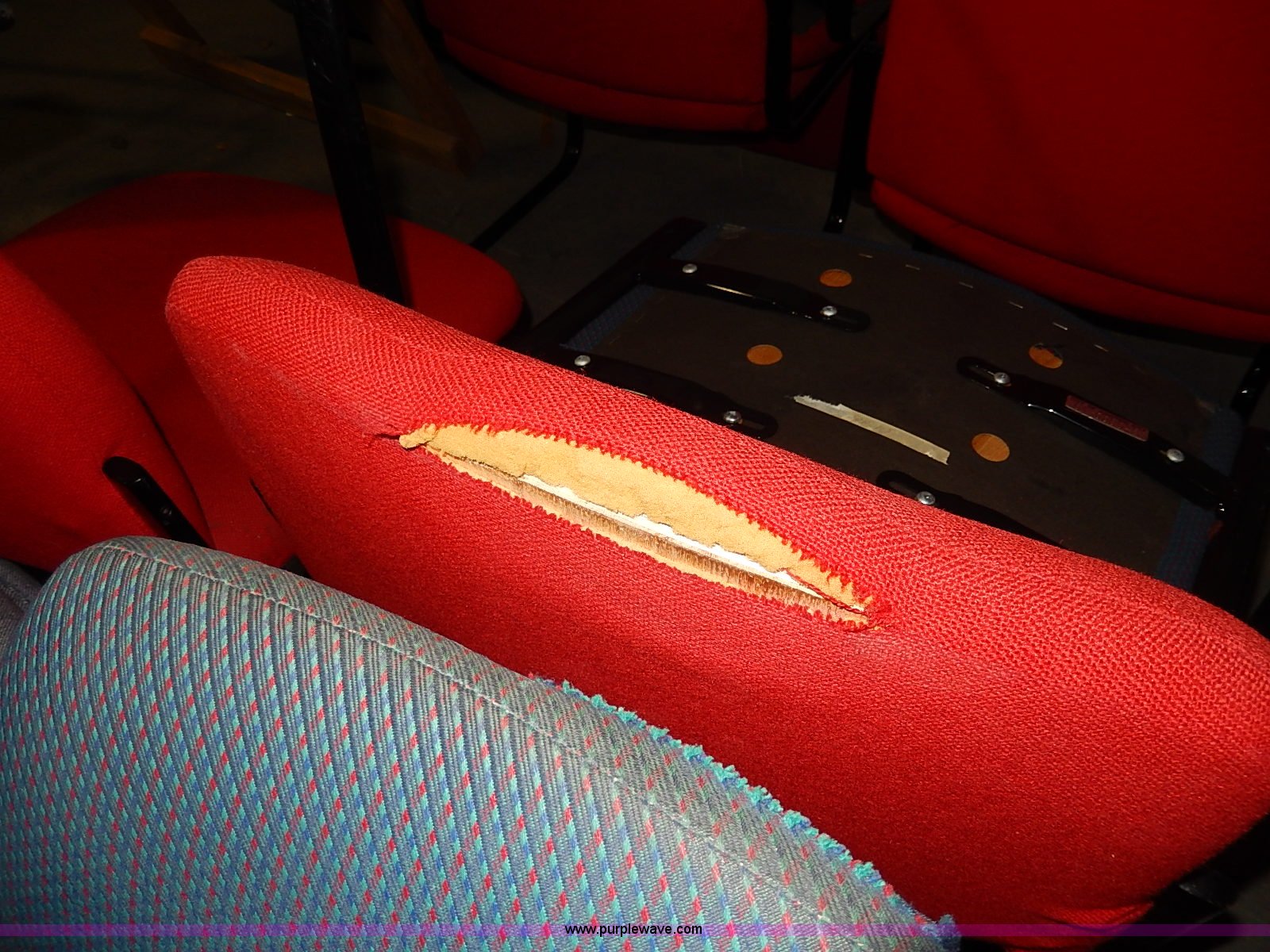 Purple Wave is selling a used Furniture in Kansas. This item is a Approximately 60 assorted chairs with the following: Cloth seats and backs, Some have cosmetic damage, Racks are not included