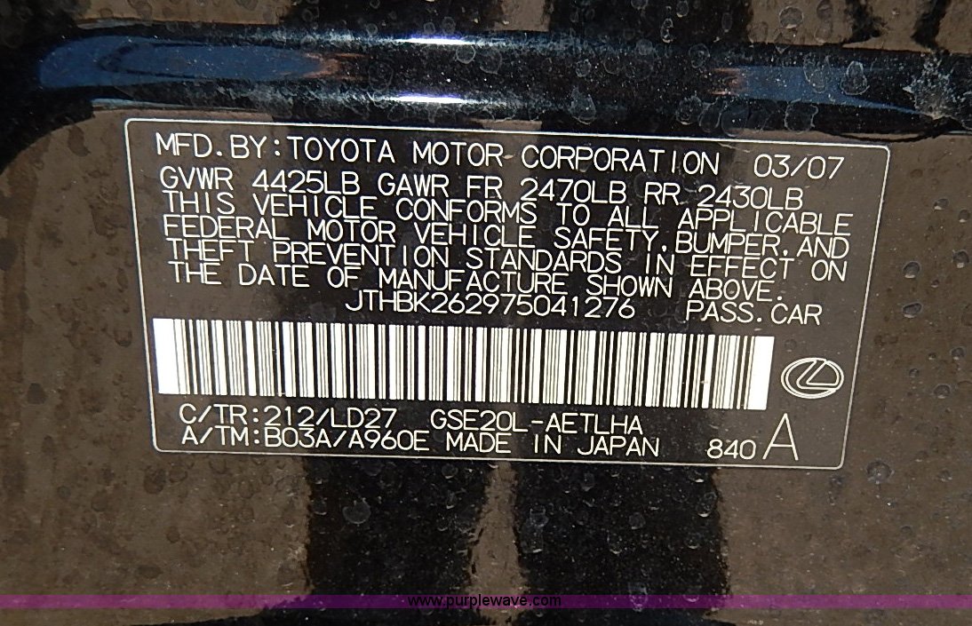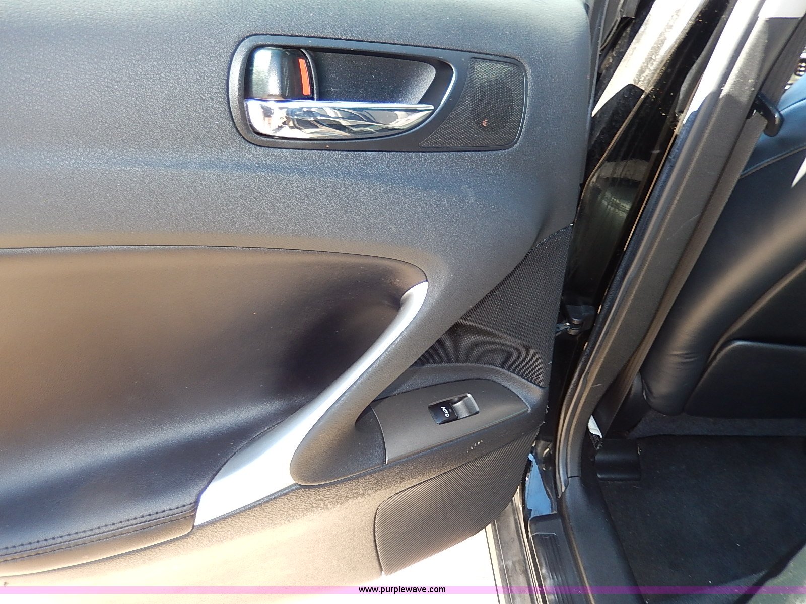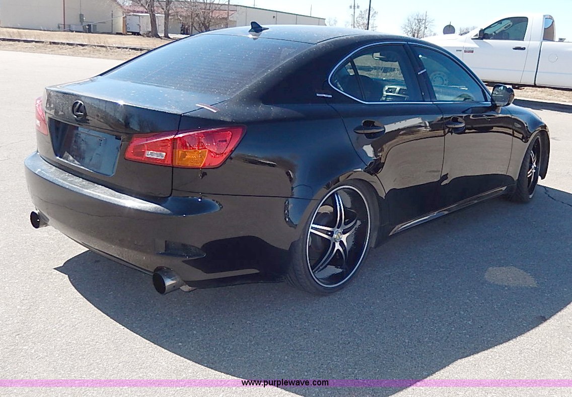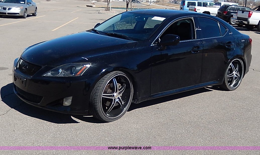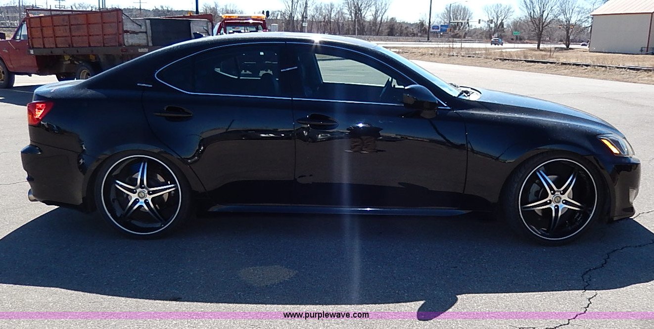 Purple Wave is selling a used Passenger Vehicle in Kansas. This item is a 2007 Lexus IS IS 250 with the following: 85,996 miles on odometer, 2.5L V6 24V DOHC gas engine, Automatic transmission, AC and heat, Tilt, Cruise, AM/FM/CD, Power windows, locks, mirrors, and seats, Leather interior, Sunroof, Rear view mirror compass, Strada wheels, 225/35ZR20 tires, Driver's side front window is the only window that will roll up and down, Check engine light is on, Check VSC light is on, Non-operational speakers