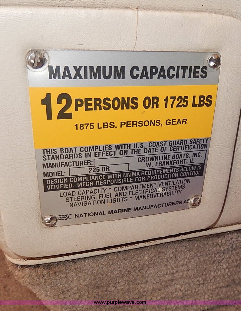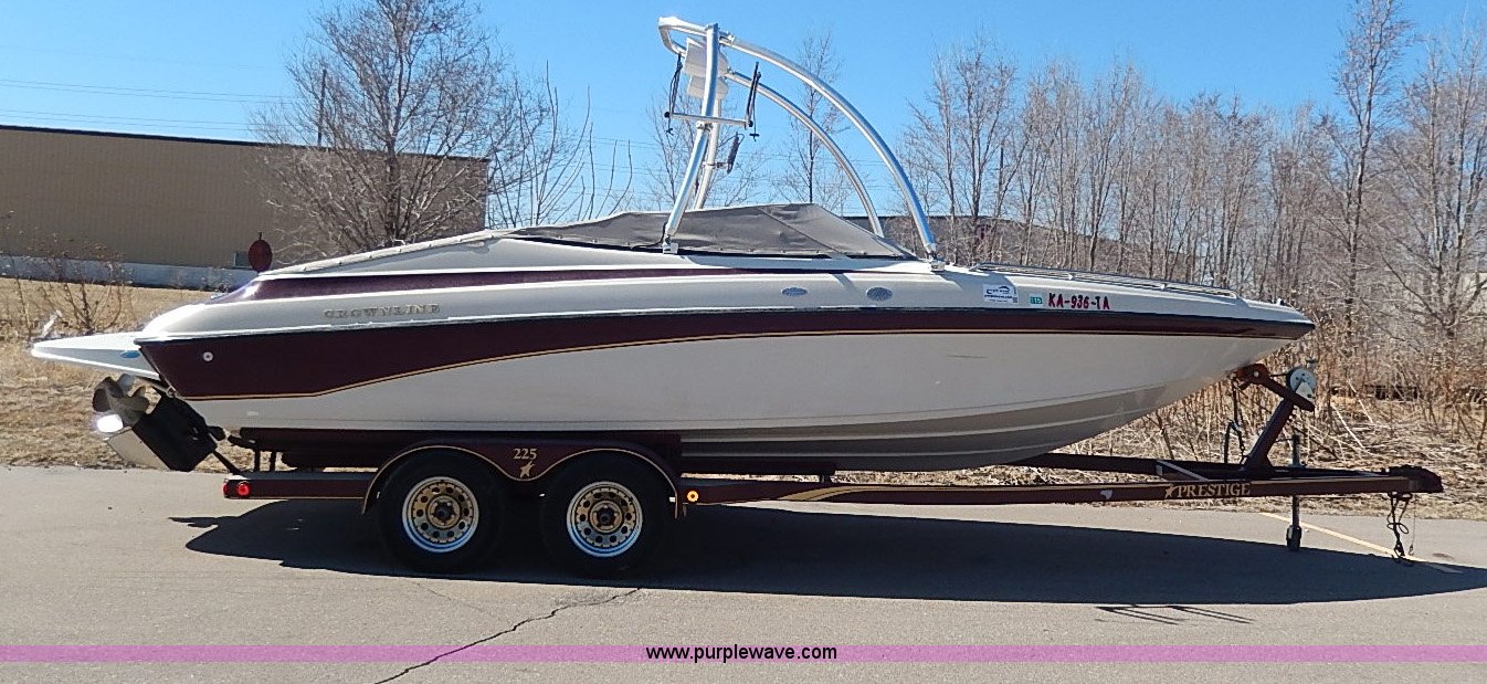 Purple Wave is selling a used Boat in Kansas. This item is a 1997 Crownline 225 boat and trailer with the following: 22', Mercruiser inboard/outboard engine, Serial 0N272168, Winterized, Kenwood AM/FM/CD, Monster Tower, (2) wake board racks, Speakers, Boat cover, Swim platform, Open bow, Counter rotating stainless steel props, 12 person capacity, Tube, (2) wake boards, Hull ID JTC28183E797