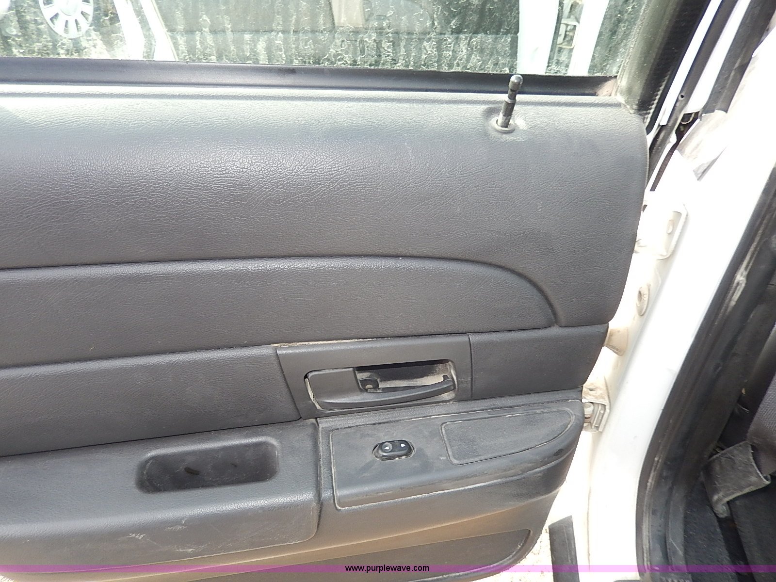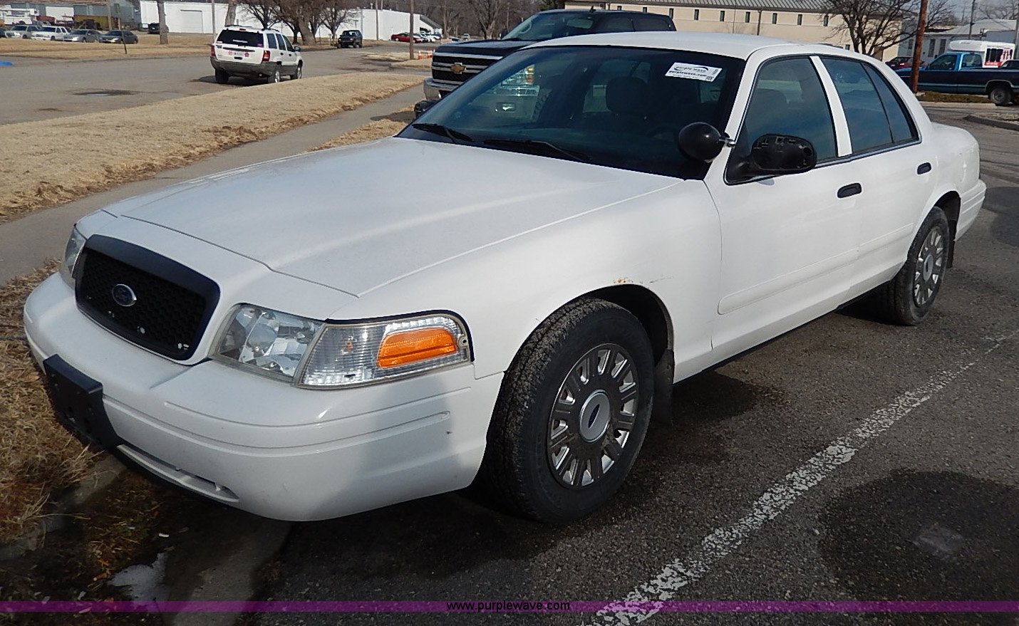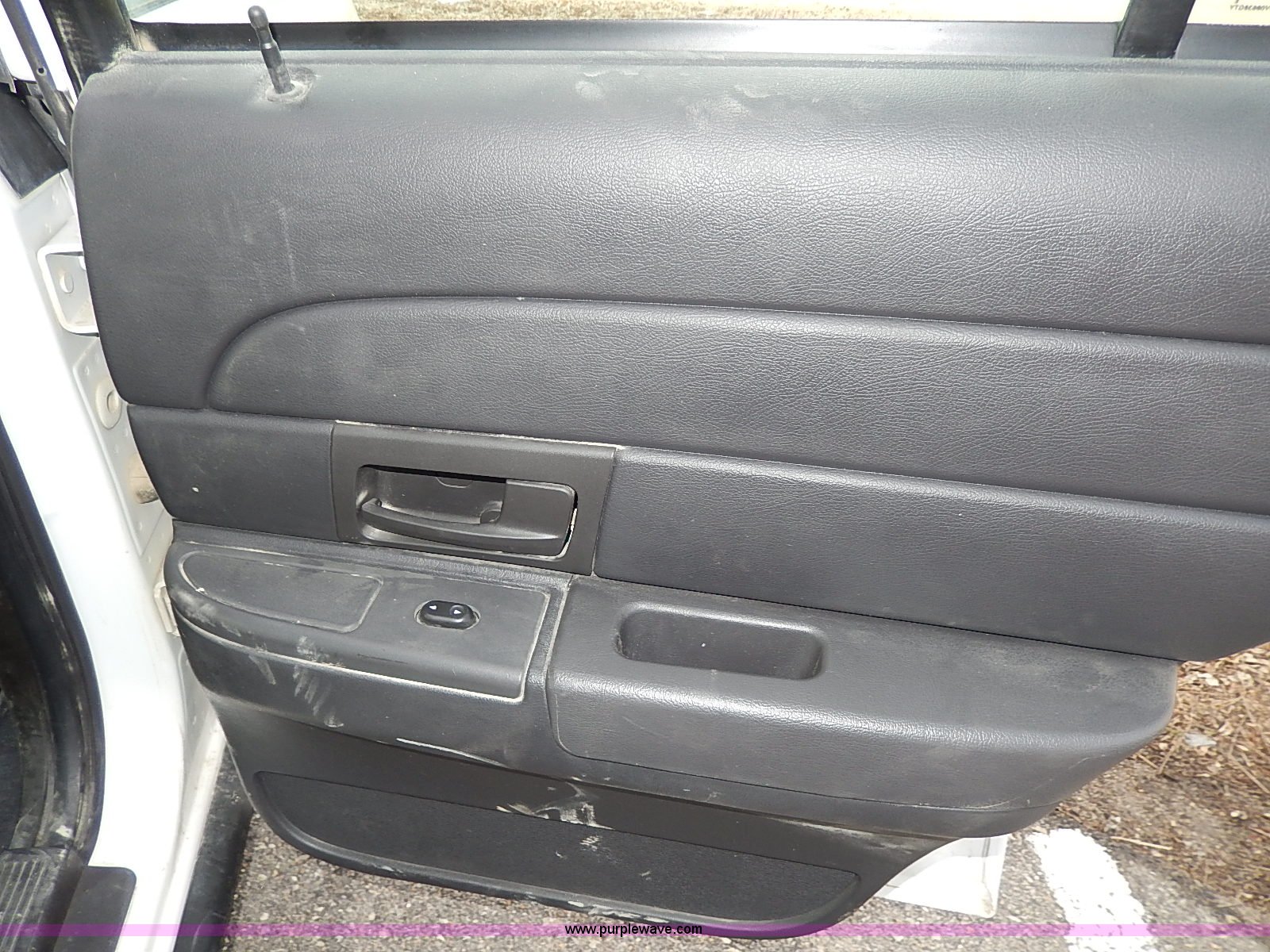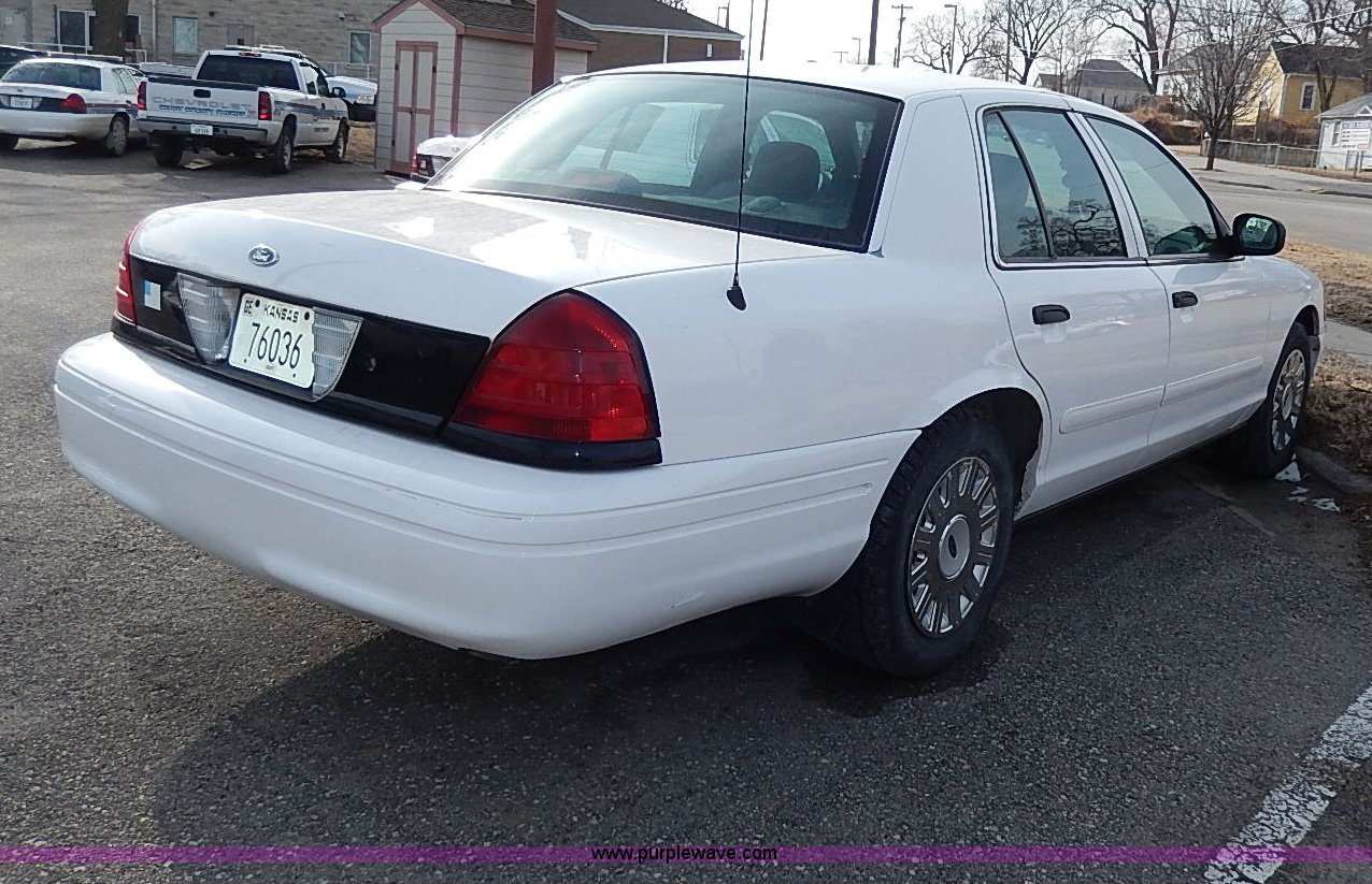Purple Wave is selling a used Passenger Vehicle in Kansas. This item is a 2005 Ford Crown Victoria Police Interceptor with the following: 141,588 miles on odometer, 4.6L V8 SOHC 16V gas engine, Automatic transmission, AC and heat, Tilt, Cruise, AM/FM/cassette, Power windows, locks, mirrors, and seats, Cloth interior, Heated mirrors, Spotlight, 225/60R16 tires, Rear view mirror missing, Paint peeling, Scratched