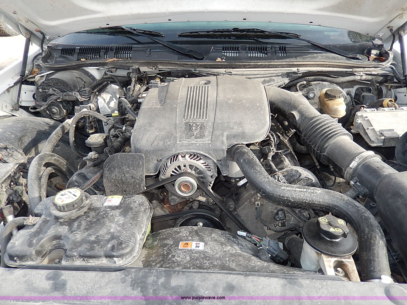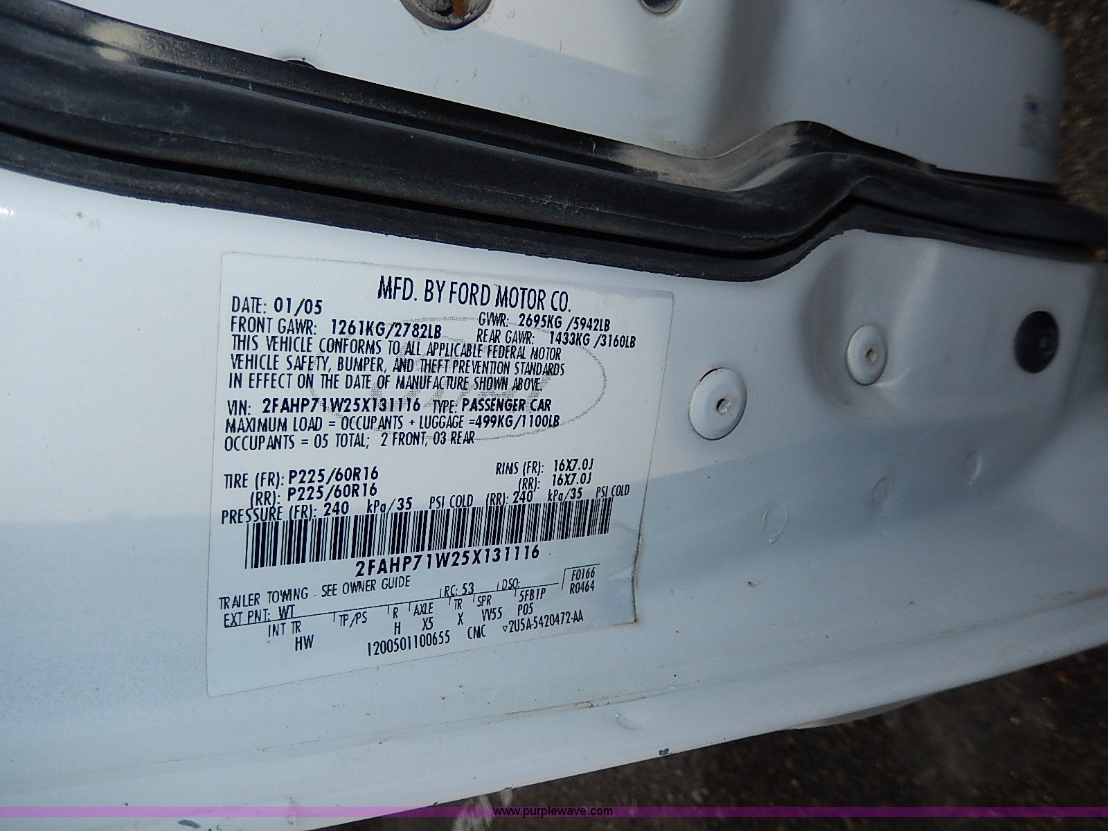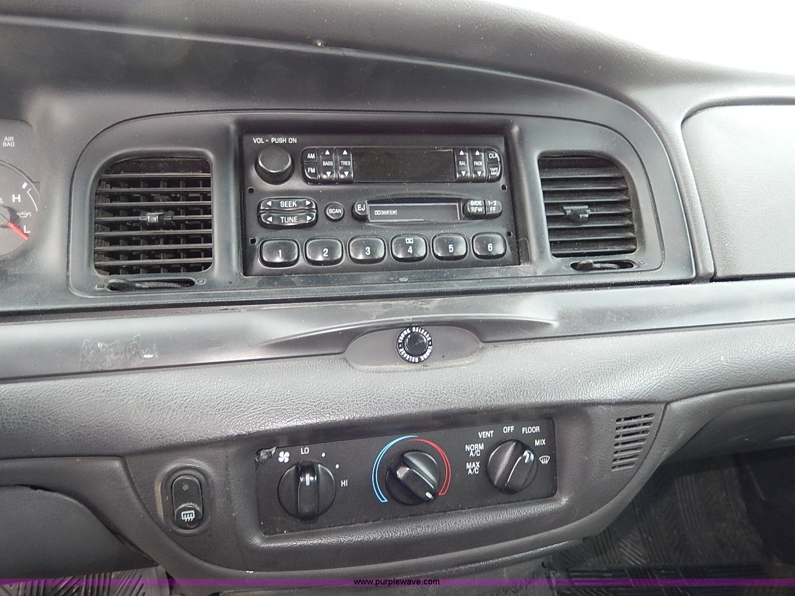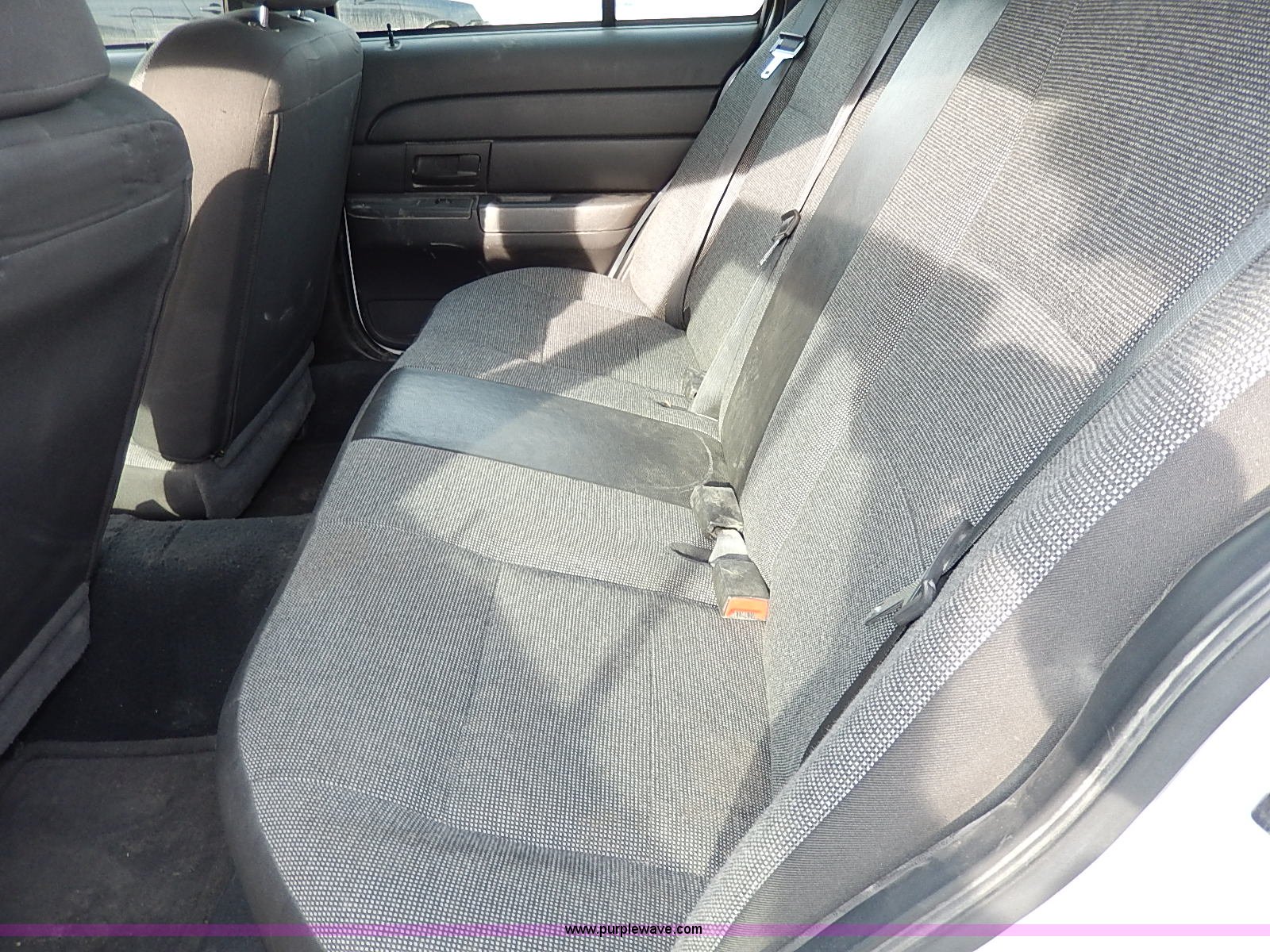 Purple Wave is selling a used Passenger Vehicle in Kansas. This item is a 2005 Ford Crown Victoria Police Interceptor with the following: 141,588 miles on odometer, 4.6L V8 SOHC 16V gas engine, Automatic transmission, AC and heat, Tilt, Cruise, AM/FM/cassette, Power windows, locks, mirrors, and seats, Cloth interior, Heated mirrors, Spotlight, 225/60R16 tires, Rear view mirror missing, Paint peeling, Scratched
