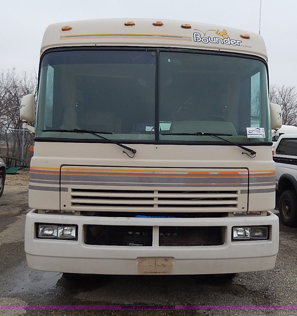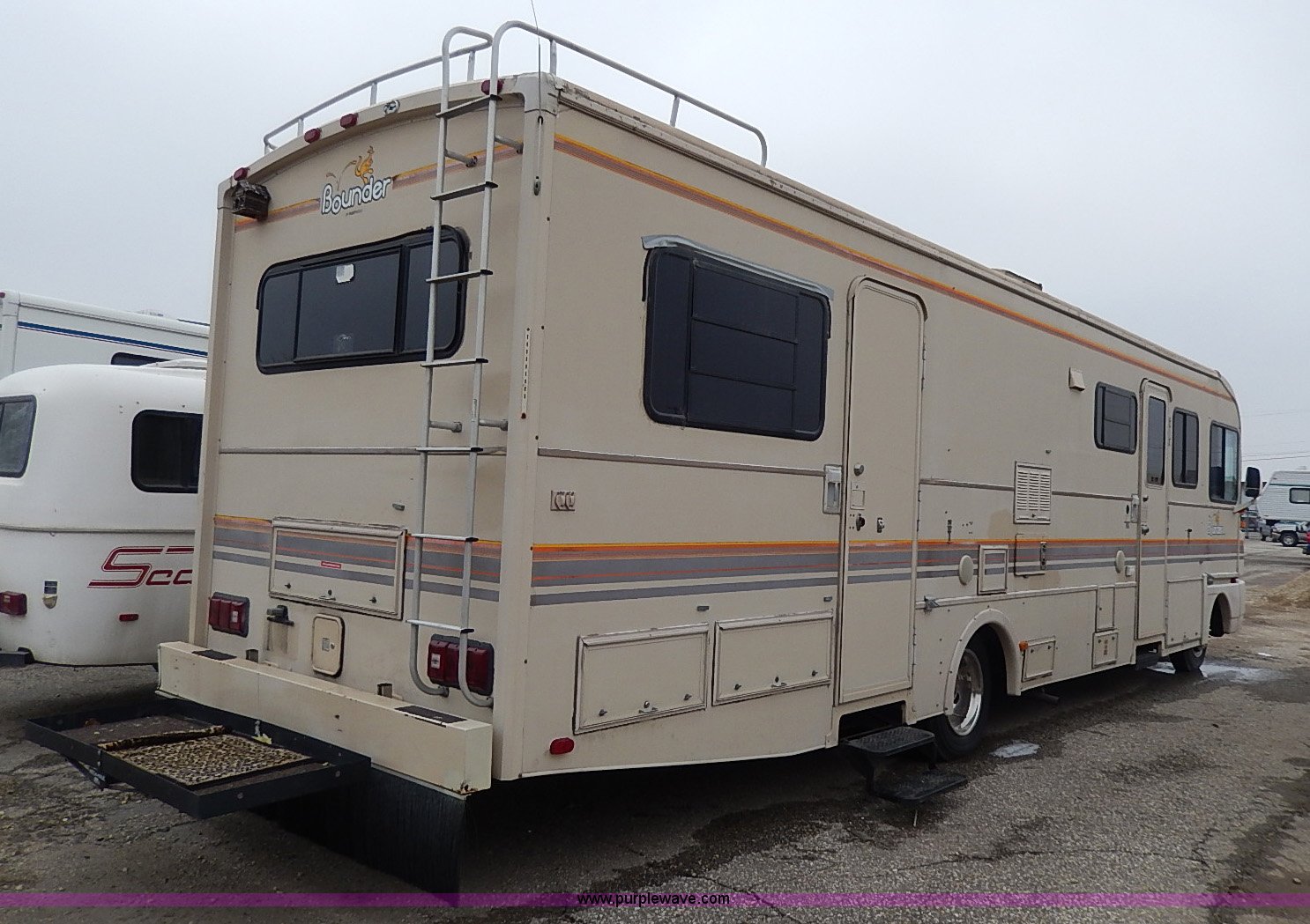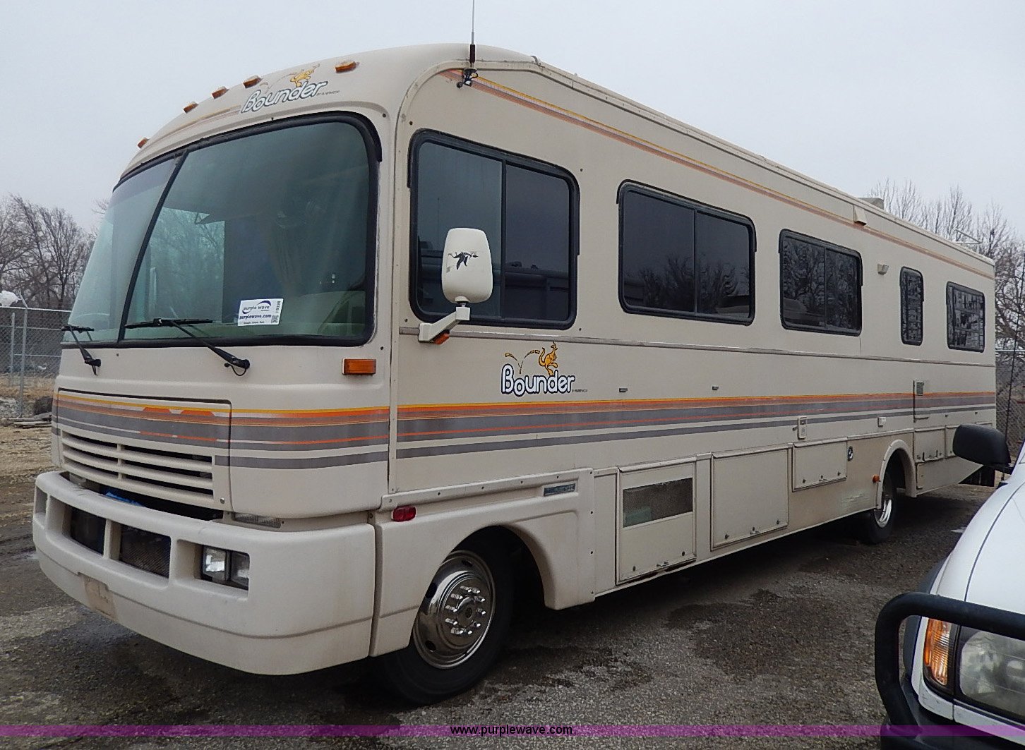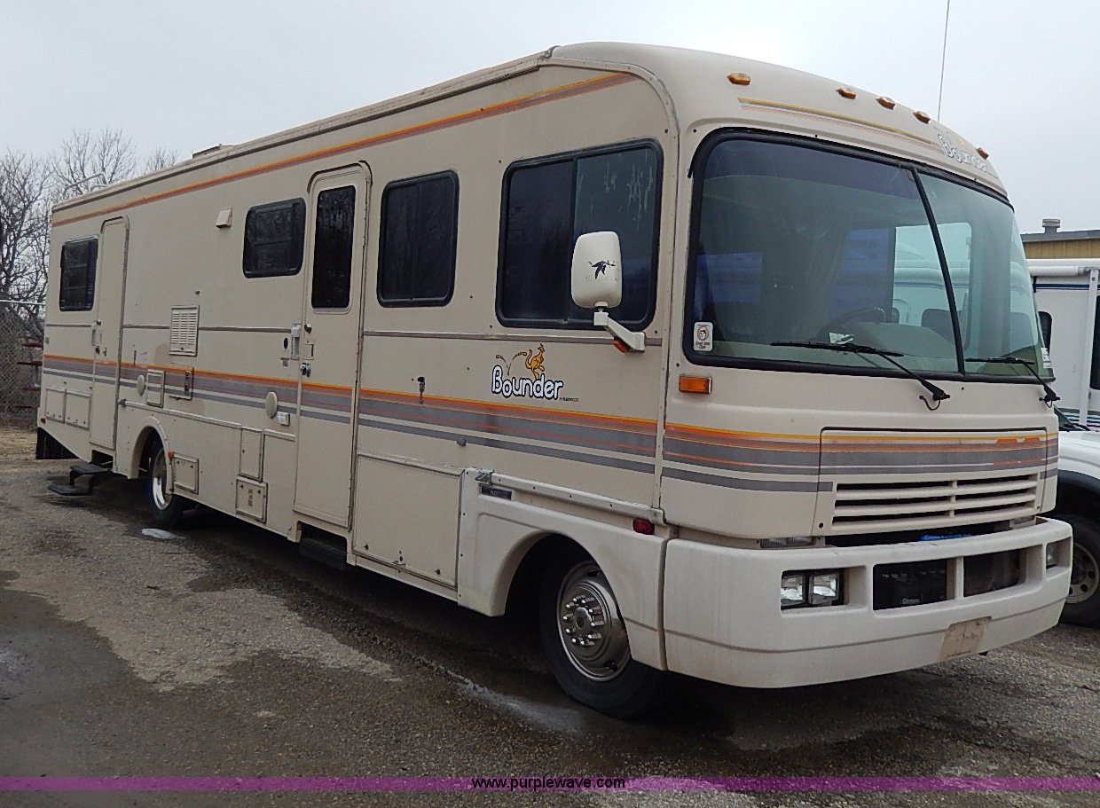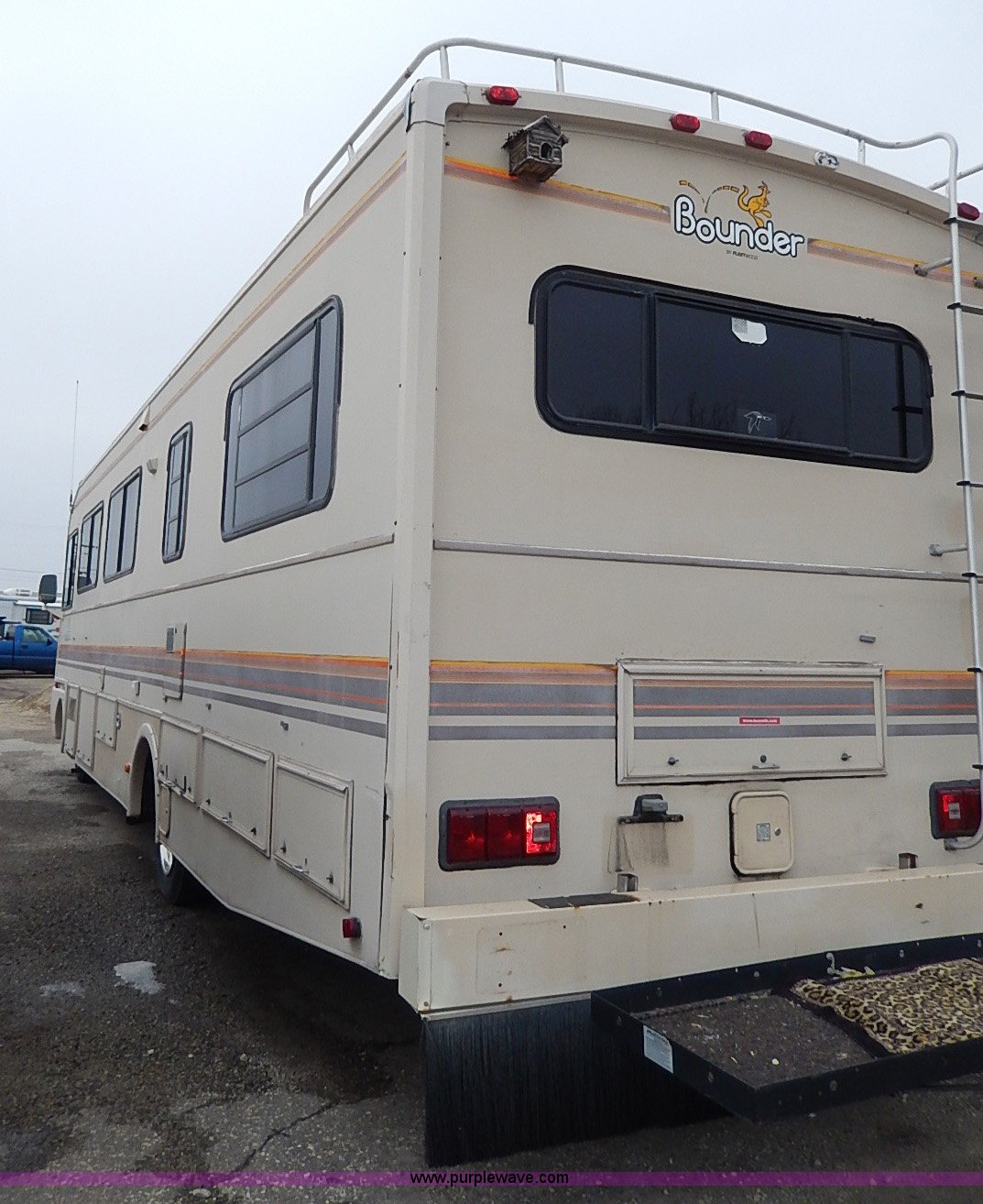 Purple Wave is selling a used RV in Kansas. This item is a 1989 Chevrolet Fleetwood P30 Bounder RV with the following: 51,427 miles on odometer, 7.4L V8 OHV 16V gas engine, Automatic transmission, AC and heat, Tilt, Cruise, AM/FM/CD, Manual windows and locks, Cloth interior, Model 80 electrical control center, Serial 733SL4708105, Rear bedroom, No mattress, Storage, Sink, Coleman AC system, Emerald III generator, VCR, (2) side entry doors, Rear platform, 110/125V AC, Fold out couch, Chair, LP hook-up, Wood flooring, Closet storage, Bathroom, Sink, Shower, Toilet, Kitchen, Dometic refrigerator/freezer, Magic Chef stove, Magic Chef microwave, Sink, Storage, Table with bench seats, Receiver hitch, 8R19.5 tires, Dead battery