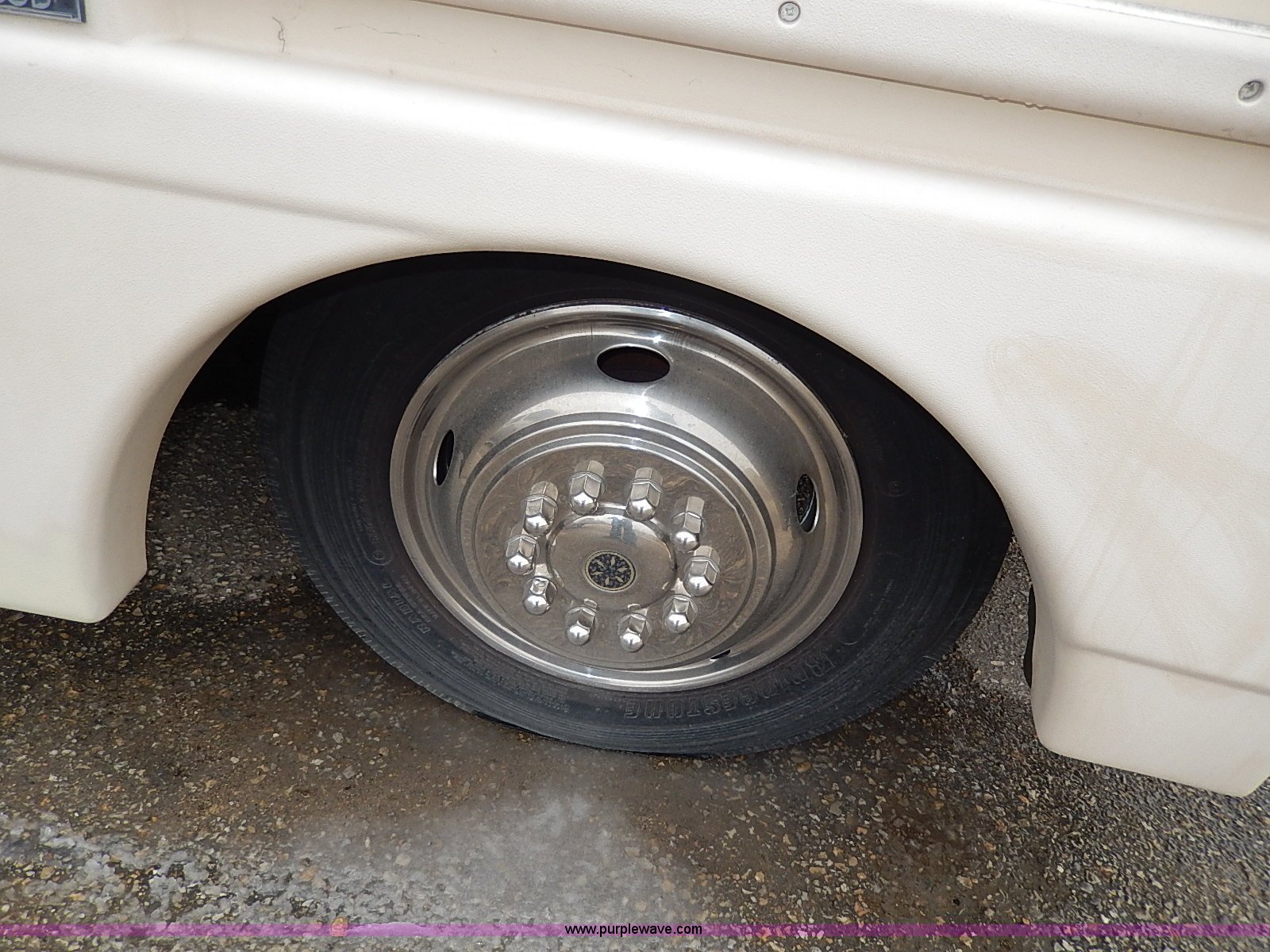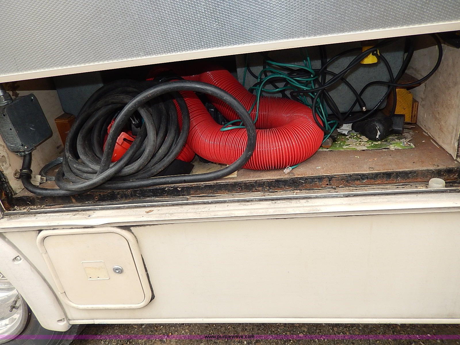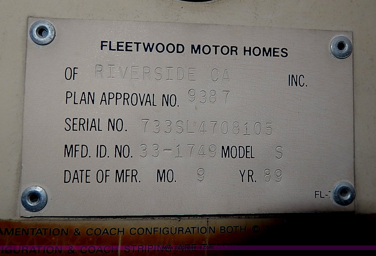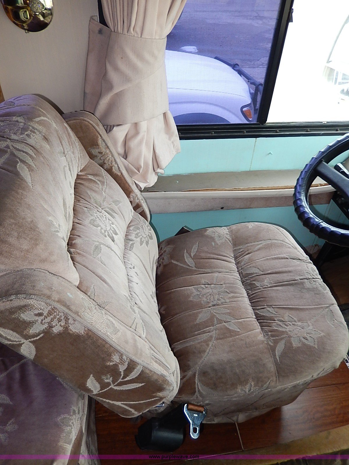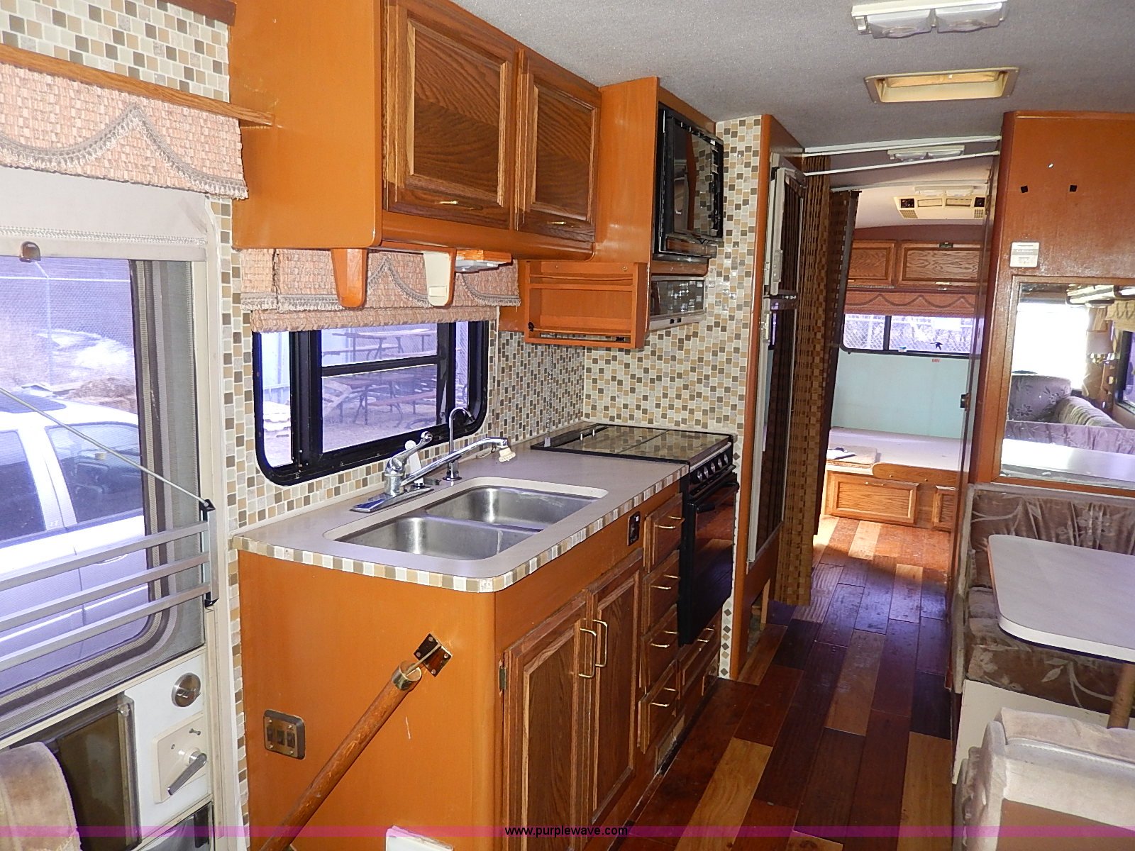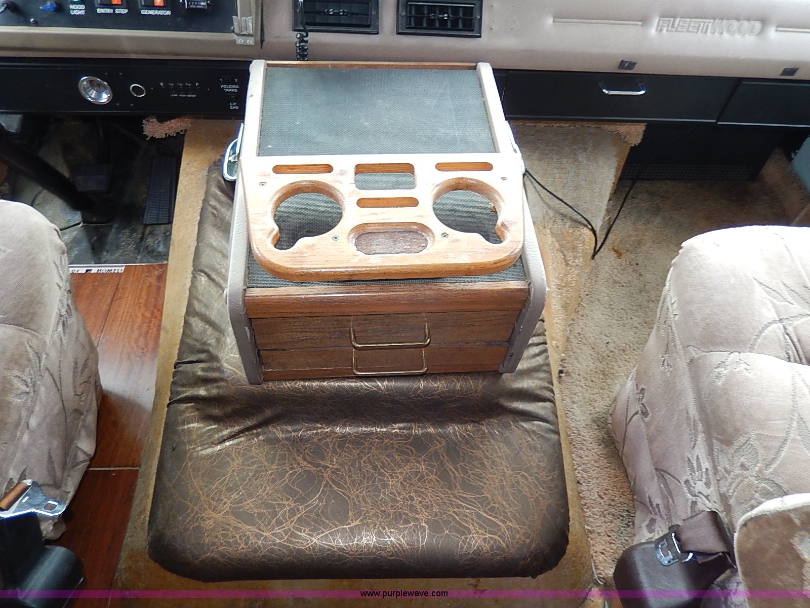 Purple Wave is selling a used RV in Kansas. This item is a 1989 Chevrolet Fleetwood P30 Bounder RV with the following: 51,427 miles on odometer, 7.4L V8 OHV 16V gas engine, Automatic transmission, AC and heat, Tilt, Cruise, AM/FM/CD, Manual windows and locks, Cloth interior, Model 80 electrical control center, Serial 733SL4708105, Rear bedroom, No mattress, Storage, Sink, Coleman AC system, Emerald III generator, VCR, (2) side entry doors, Rear platform, 110/125V AC, Fold out couch, Chair, LP hook-up, Wood flooring, Closet storage, Bathroom, Sink, Shower, Toilet, Kitchen, Dometic refrigerator/freezer, Magic Chef stove, Magic Chef microwave, Sink, Storage, Table with bench seats, Receiver hitch, 8R19.5 tires, Dead battery