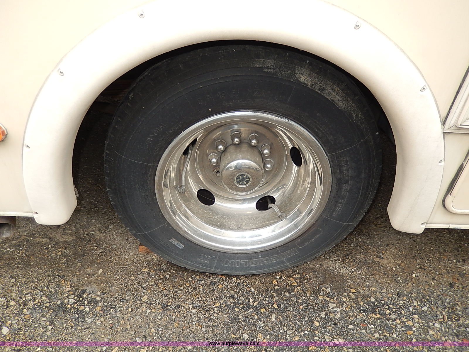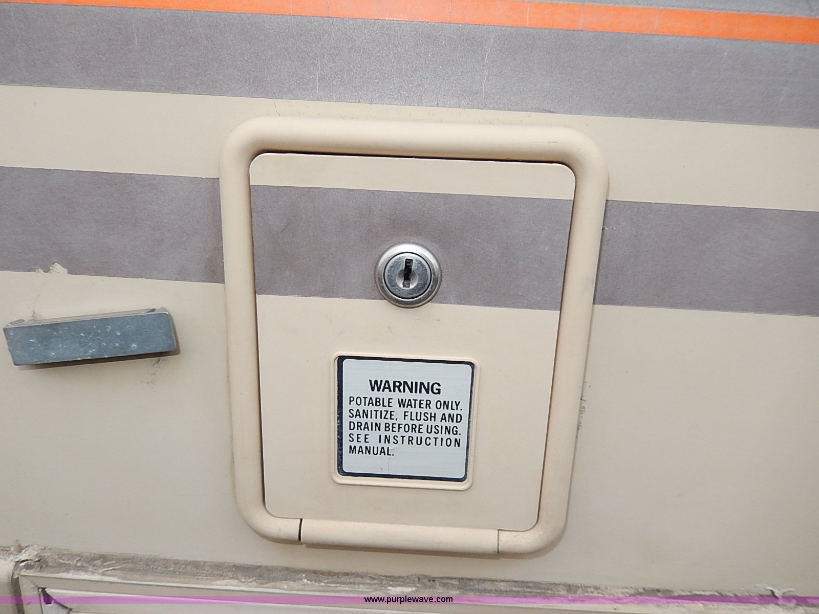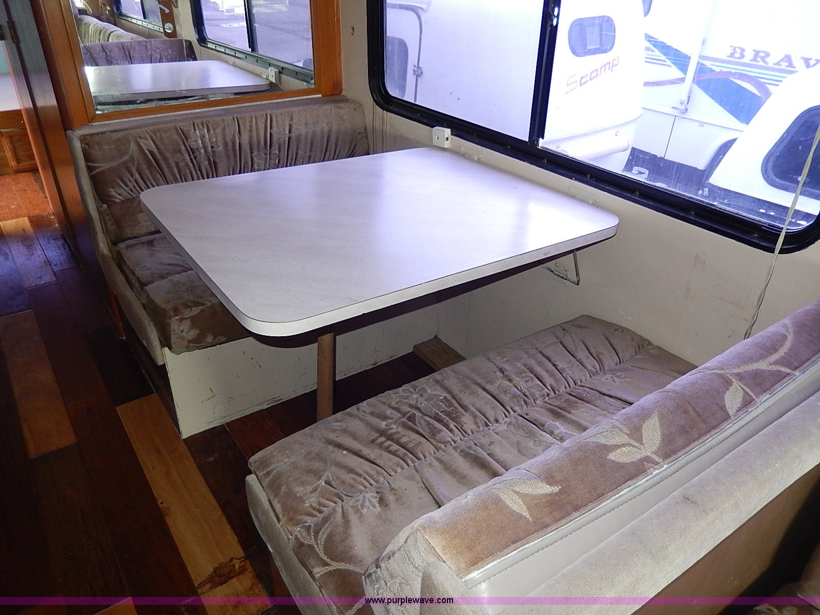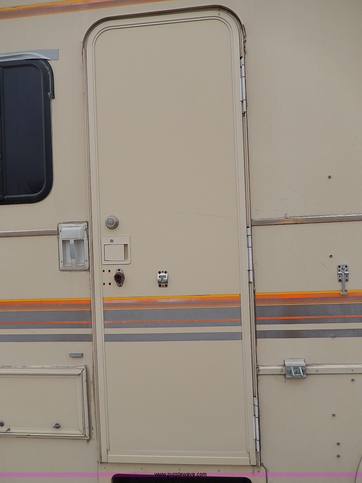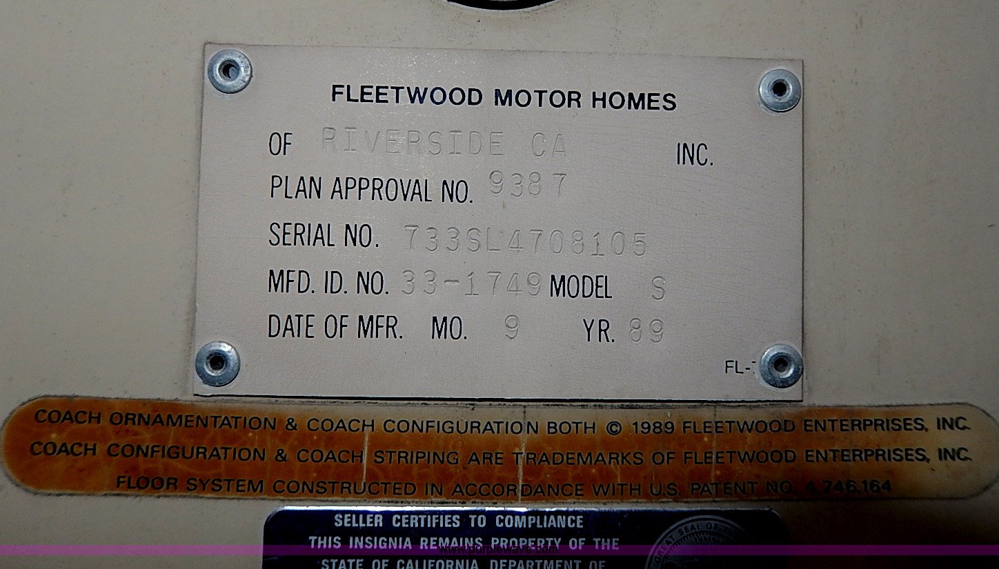 Purple Wave is selling a used RV in Kansas. This item is a 1989 Chevrolet Fleetwood P30 Bounder RV with the following: 51,427 miles on odometer, 7.4L V8 OHV 16V gas engine, Automatic transmission, AC and heat, Tilt, Cruise, AM/FM/CD, Manual windows and locks, Cloth interior, Model 80 electrical control center, Serial 733SL4708105, Rear bedroom, No mattress, Storage, Sink, Coleman AC system, Emerald III generator, VCR, (2) side entry doors, Rear platform, 110/125V AC, Fold out couch, Chair, LP hook-up, Wood flooring, Closet storage, Bathroom, Sink, Shower, Toilet, Kitchen, Dometic refrigerator/freezer, Magic Chef stove, Magic Chef microwave, Sink, Storage, Table with bench seats, Receiver hitch, 8R19.5 tires, Dead battery