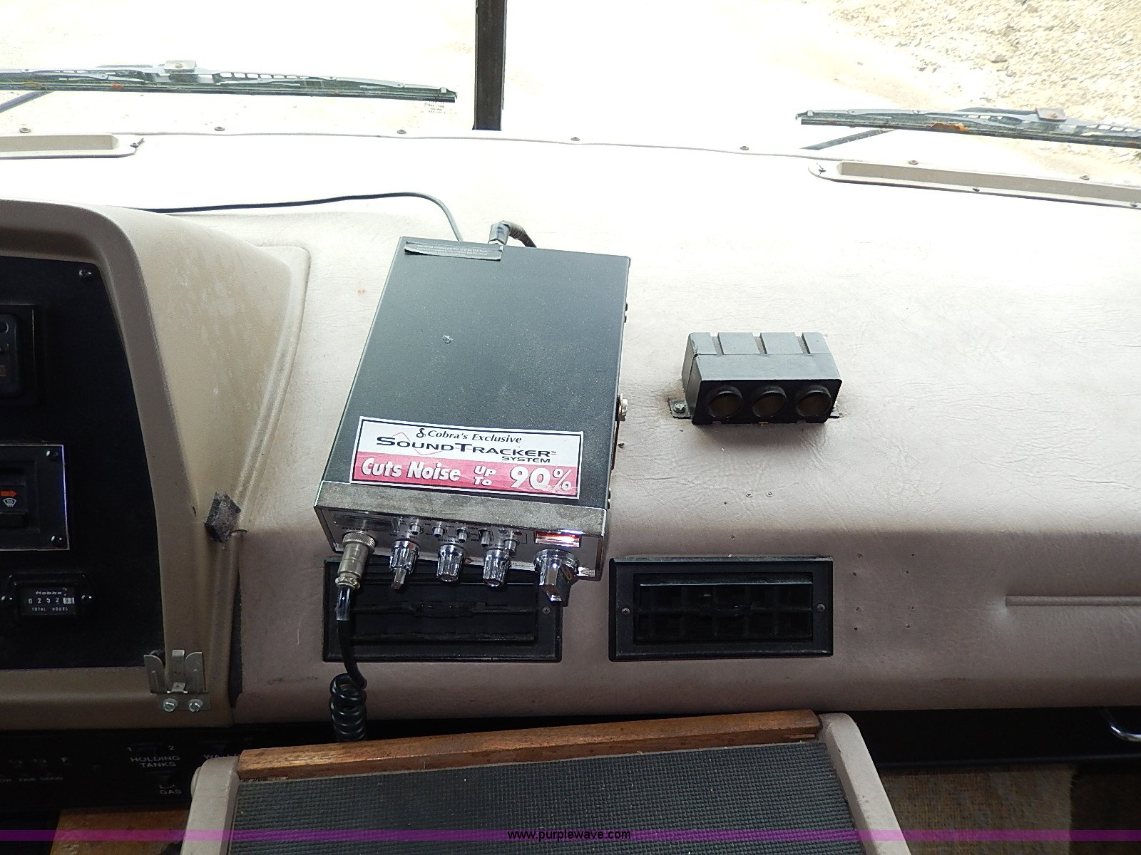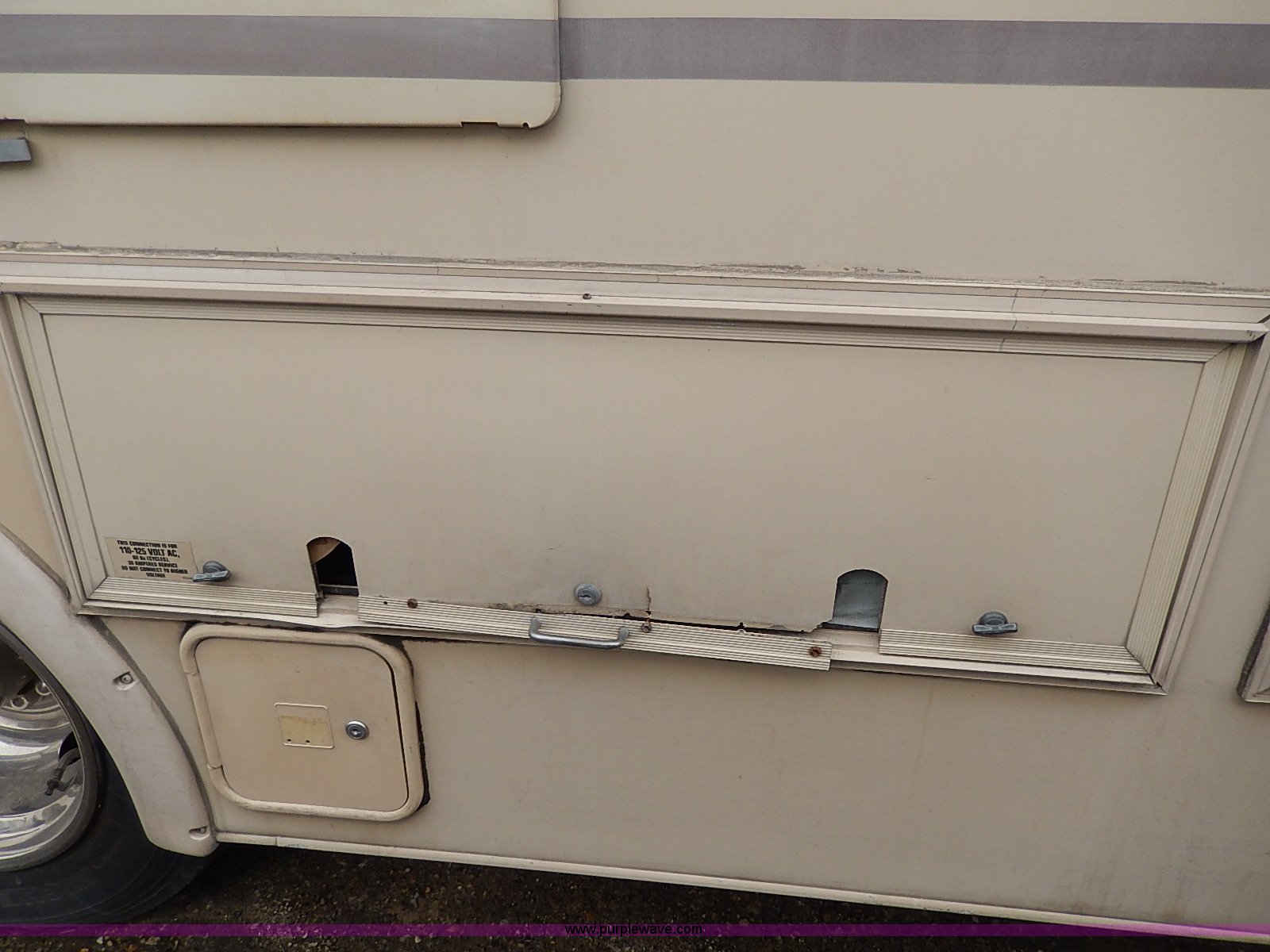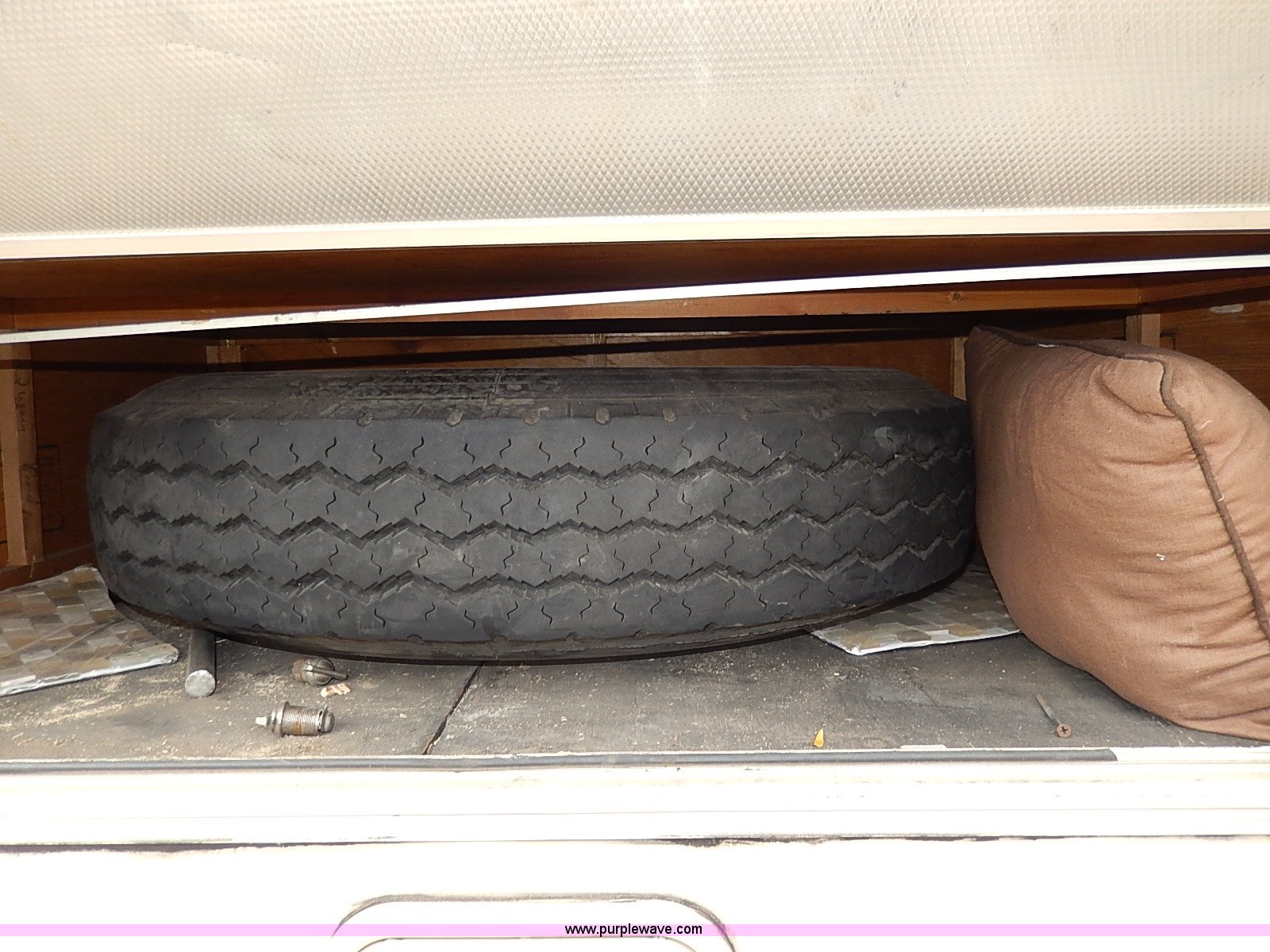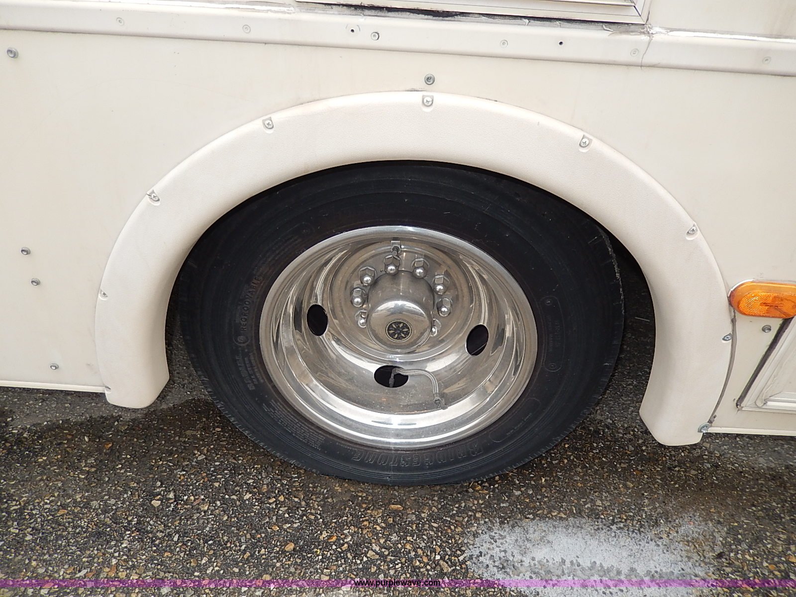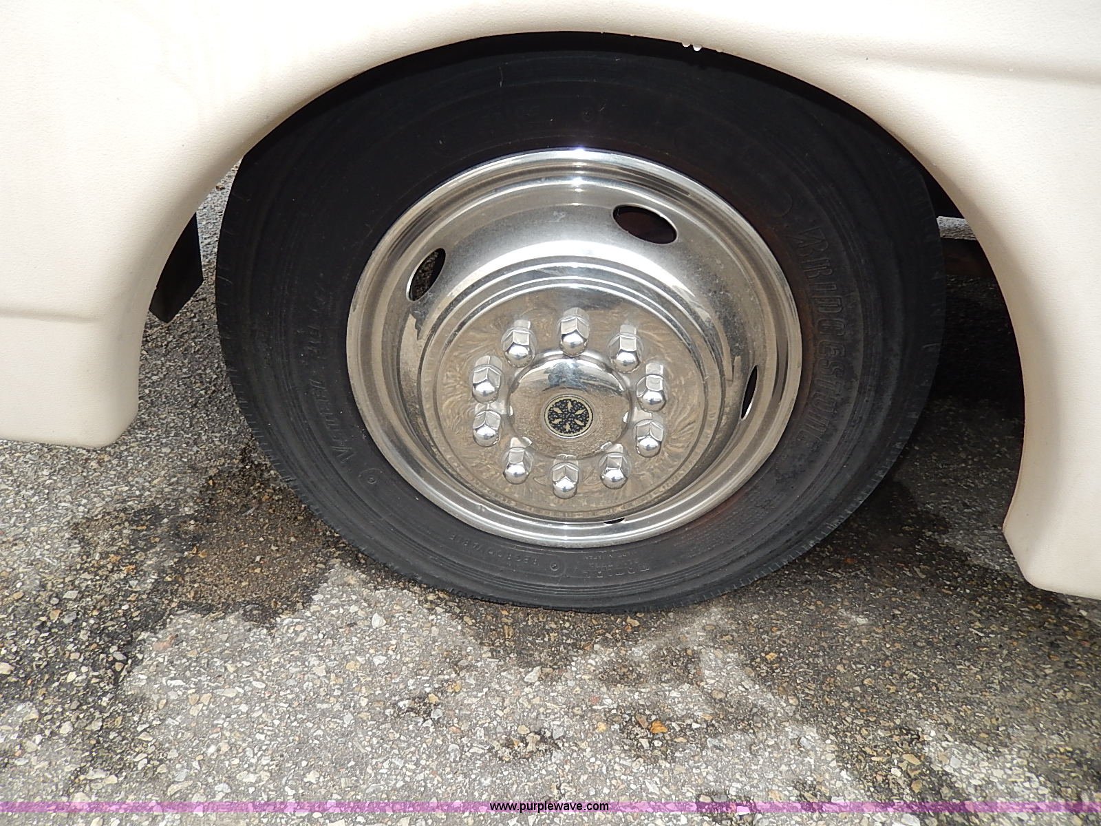 Purple Wave is selling a used RV in Kansas. This item is a 1989 Chevrolet Fleetwood P30 Bounder RV with the following: 51,427 miles on odometer, 7.4L V8 OHV 16V gas engine, Automatic transmission, AC and heat, Tilt, Cruise, AM/FM/CD, Manual windows and locks, Cloth interior, Model 80 electrical control center, Serial 733SL4708105, Rear bedroom, No mattress, Storage, Sink, Coleman AC system, Emerald III generator, VCR, (2) side entry doors, Rear platform, 110/125V AC, Fold out couch, Chair, LP hook-up, Wood flooring, Closet storage, Bathroom, Sink, Shower, Toilet, Kitchen, Dometic refrigerator/freezer, Magic Chef stove, Magic Chef microwave, Sink, Storage, Table with bench seats, Receiver hitch, 8R19.5 tires, Dead battery