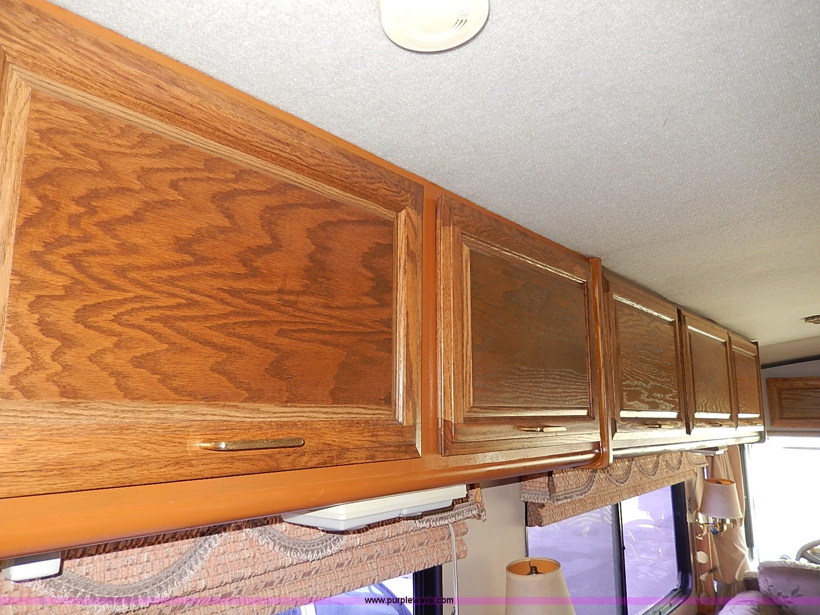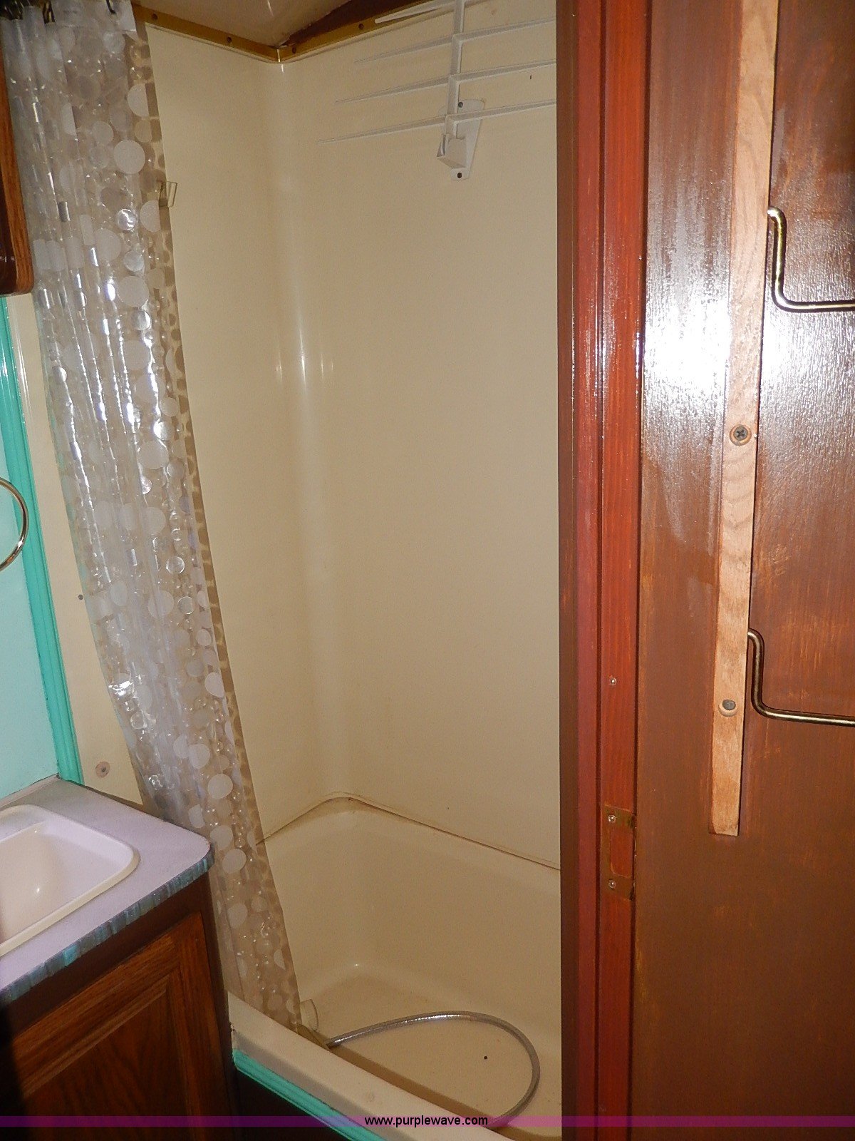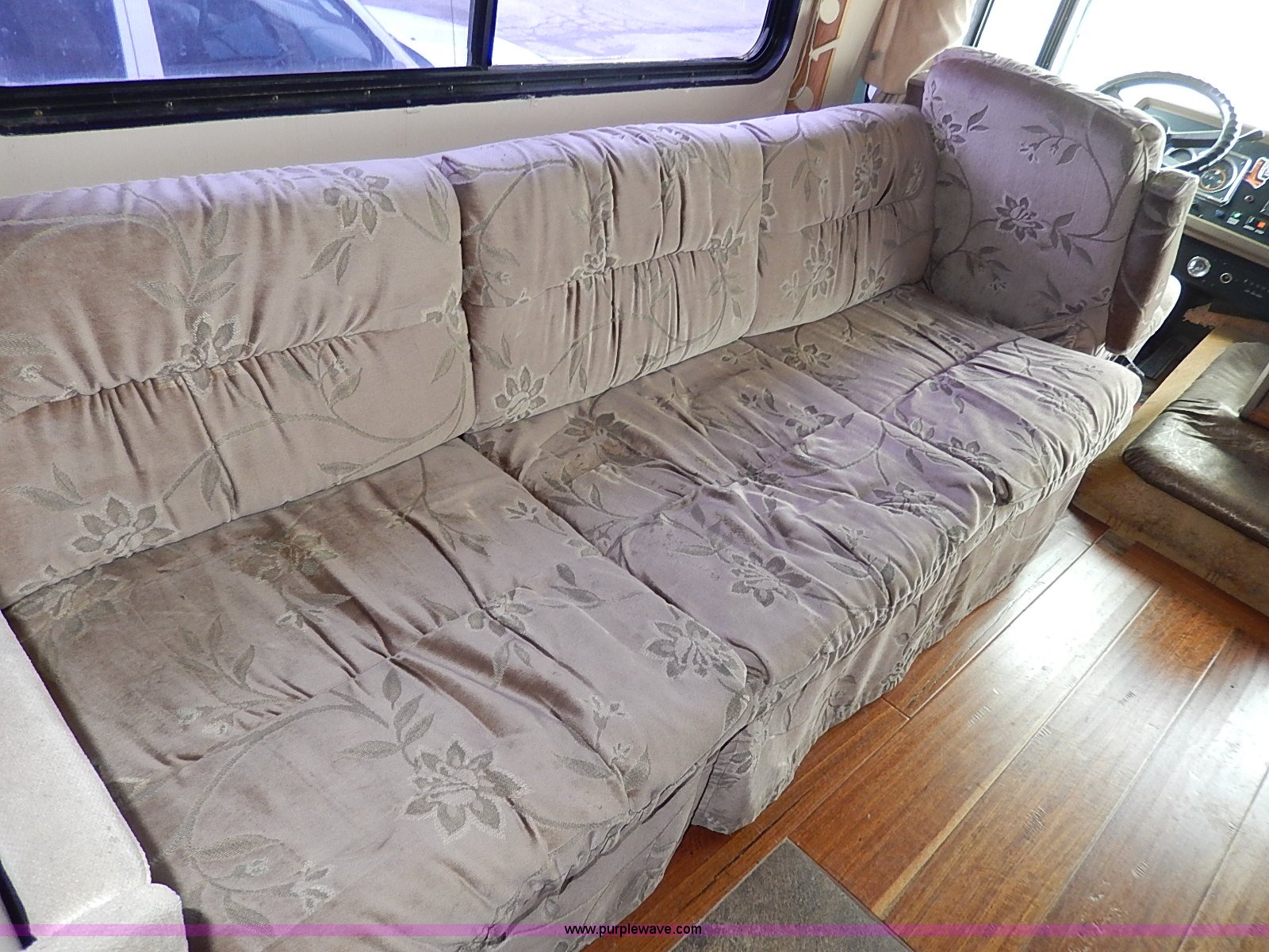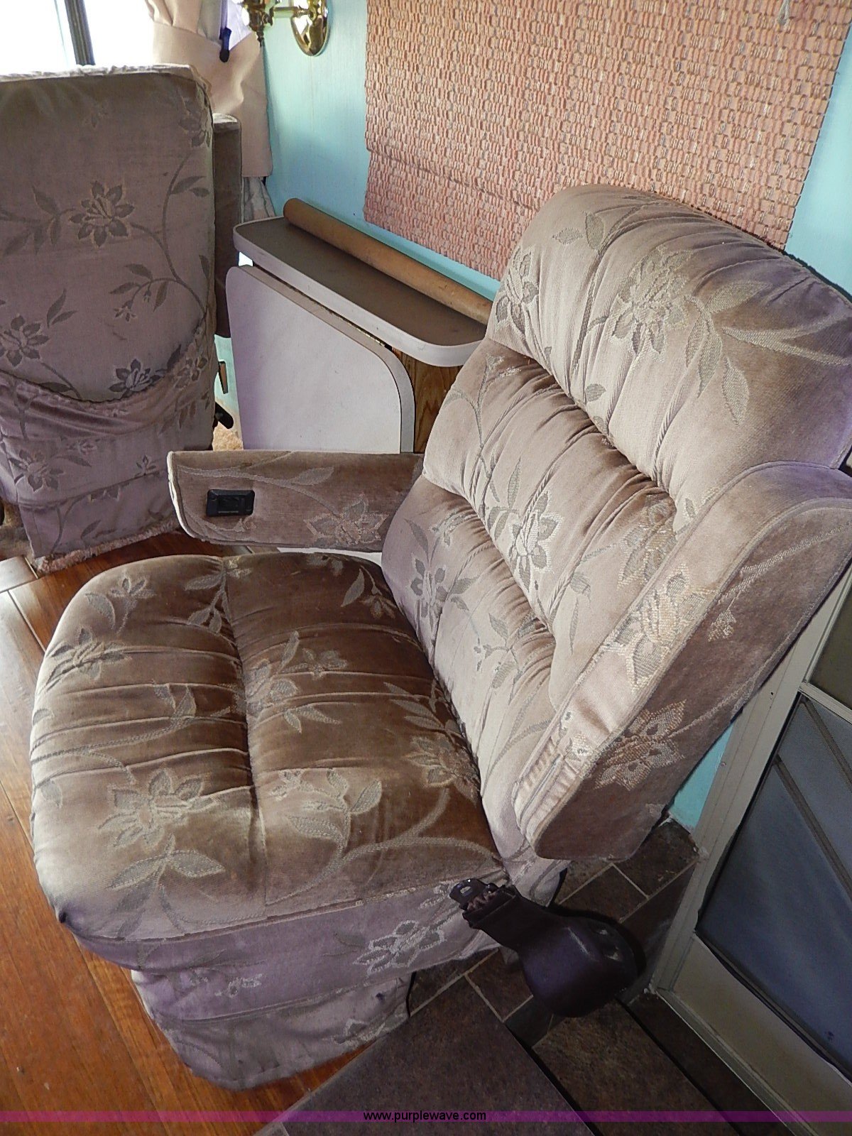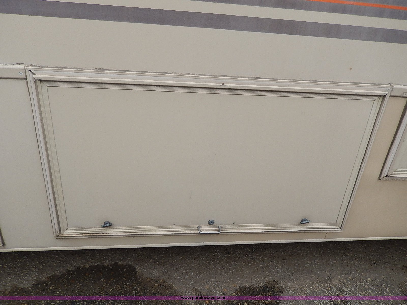 Purple Wave is selling a used RV in Kansas. This item is a 1989 Chevrolet Fleetwood P30 Bounder RV with the following: 51,427 miles on odometer, 7.4L V8 OHV 16V gas engine, Automatic transmission, AC and heat, Tilt, Cruise, AM/FM/CD, Manual windows and locks, Cloth interior, Model 80 electrical control center, Serial 733SL4708105, Rear bedroom, No mattress, Storage, Sink, Coleman AC system, Emerald III generator, VCR, (2) side entry doors, Rear platform, 110/125V AC, Fold out couch, Chair, LP hook-up, Wood flooring, Closet storage, Bathroom, Sink, Shower, Toilet, Kitchen, Dometic refrigerator/freezer, Magic Chef stove, Magic Chef microwave, Sink, Storage, Table with bench seats, Receiver hitch, 8R19.5 tires, Dead battery