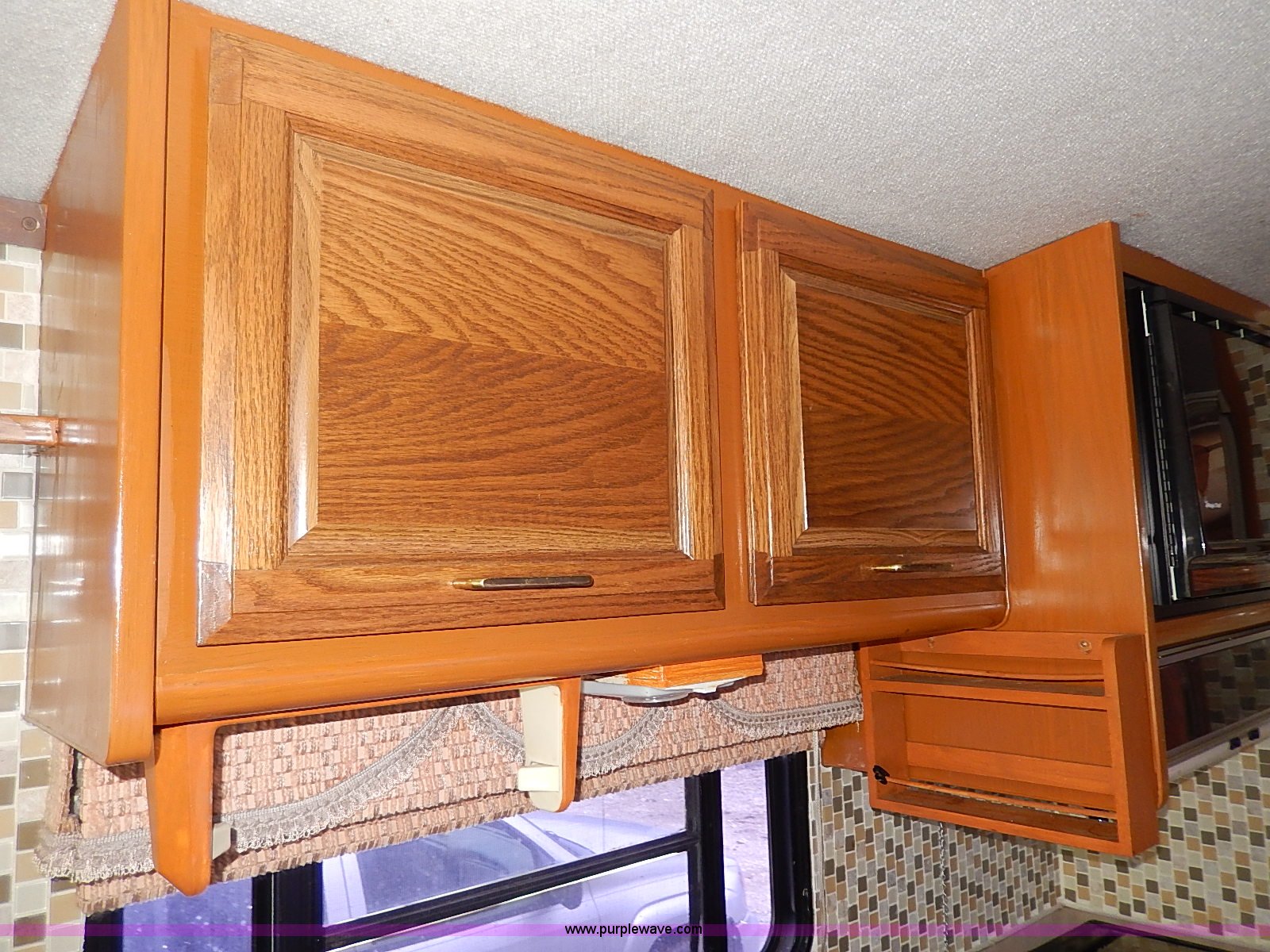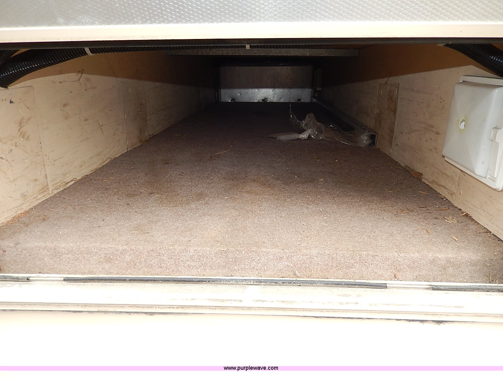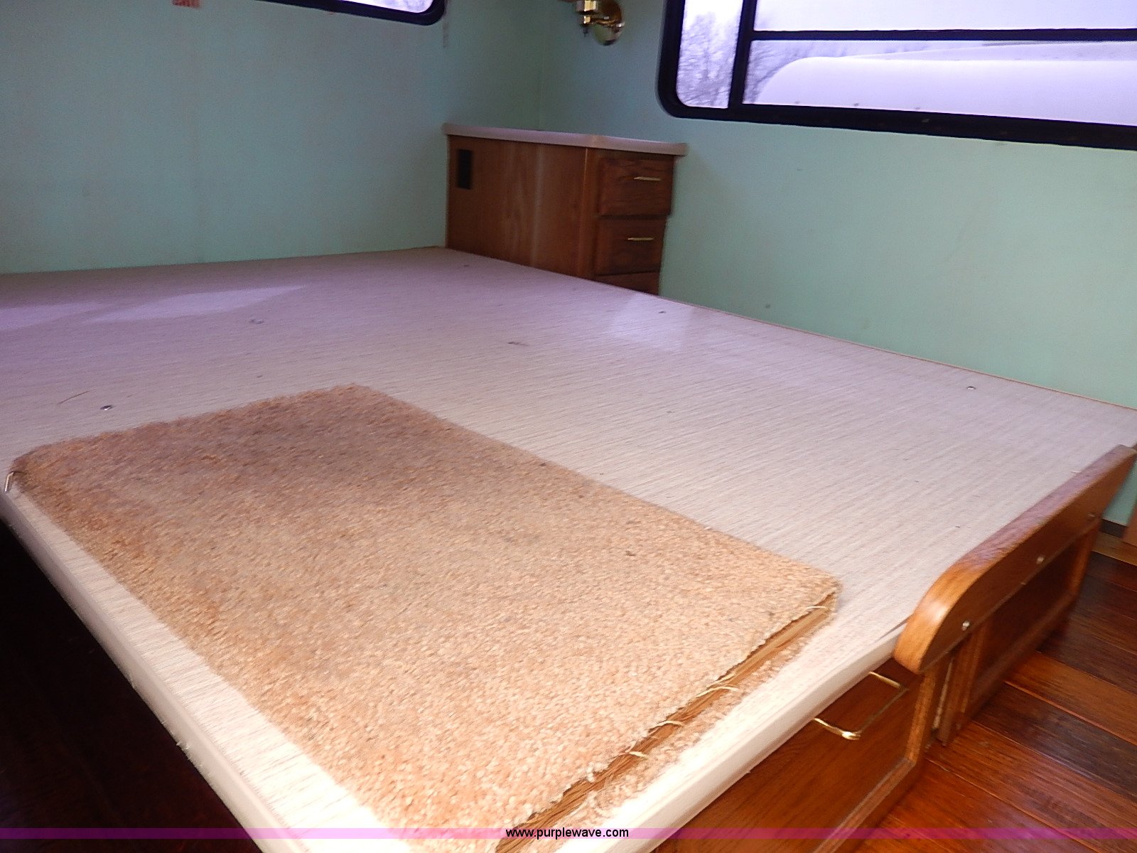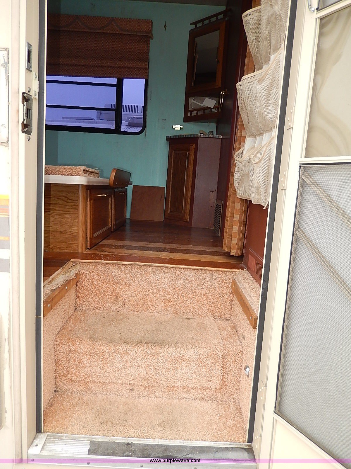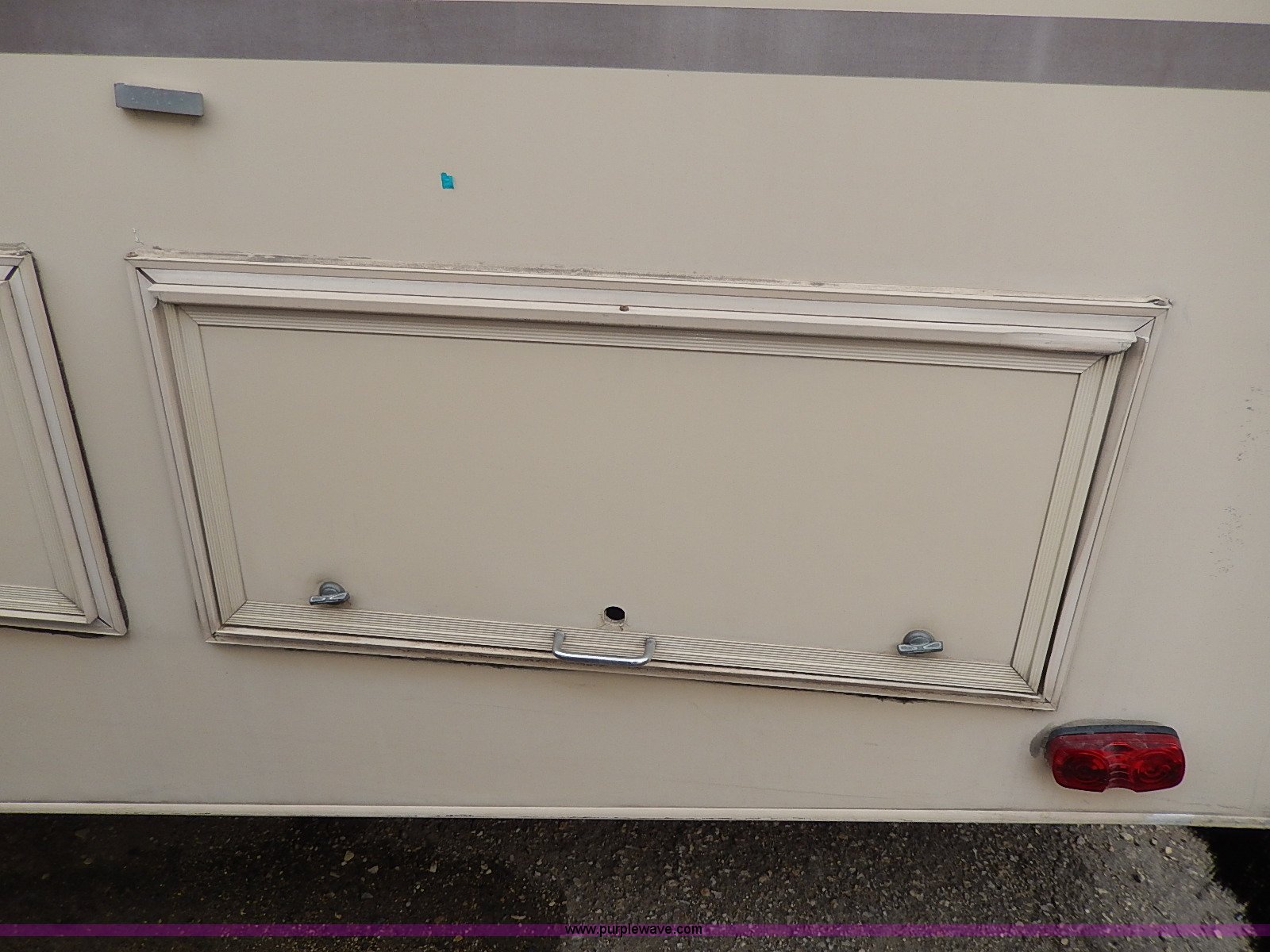 Purple Wave is selling a used RV in Kansas. This item is a 1989 Chevrolet Fleetwood P30 Bounder RV with the following: 51,427 miles on odometer, 7.4L V8 OHV 16V gas engine, Automatic transmission, AC and heat, Tilt, Cruise, AM/FM/CD, Manual windows and locks, Cloth interior, Model 80 electrical control center, Serial 733SL4708105, Rear bedroom, No mattress, Storage, Sink, Coleman AC system, Emerald III generator, VCR, (2) side entry doors, Rear platform, 110/125V AC, Fold out couch, Chair, LP hook-up, Wood flooring, Closet storage, Bathroom, Sink, Shower, Toilet, Kitchen, Dometic refrigerator/freezer, Magic Chef stove, Magic Chef microwave, Sink, Storage, Table with bench seats, Receiver hitch, 8R19.5 tires, Dead battery