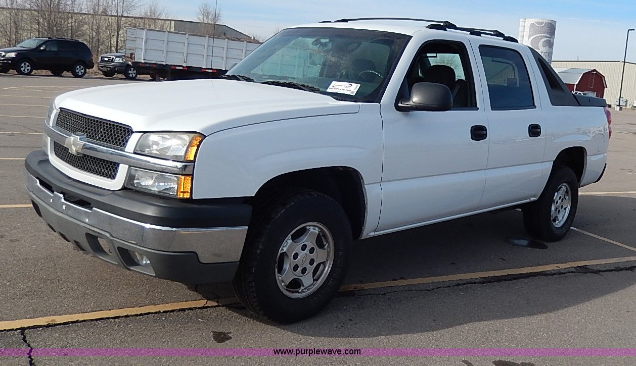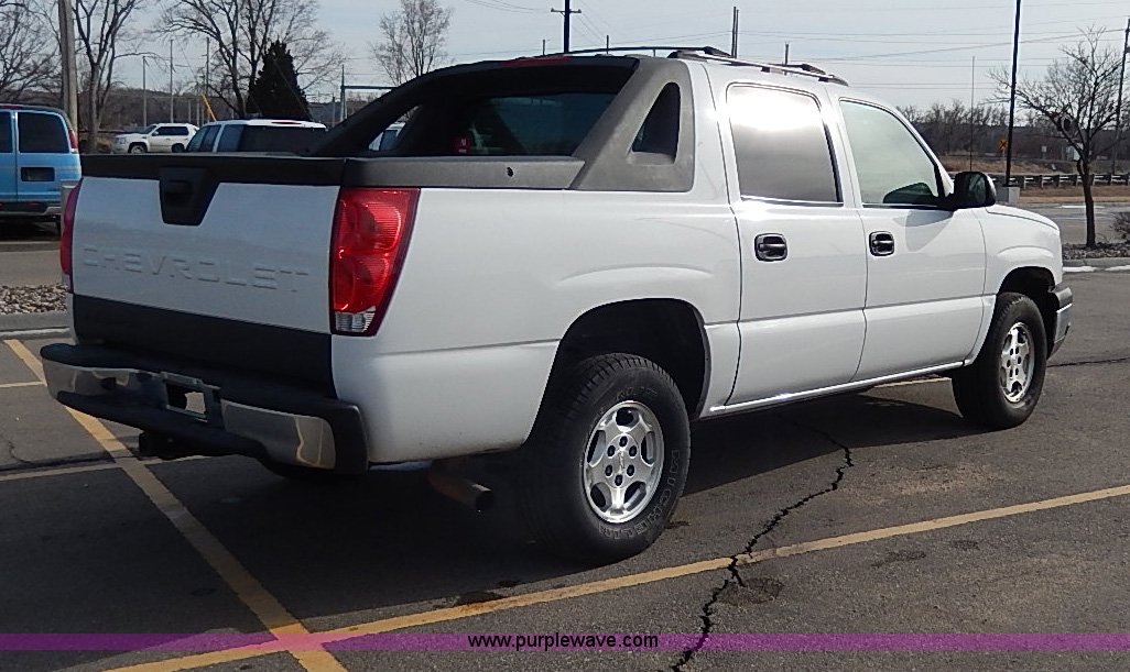 Purple Wave is selling a used Passenger Vehicle in Kansas. This item is a 2003 Chevrolet Avalanche 1500 pickup truck with the following: 106,170 miles on odometer, 5.3L V8 OHV 16V gas engine, Automatic transmission, AC and heat, Tilt, Cruise, AM/FM/CD, Power windows, locks, mirrors, and seats, Cloth interior, Temperature and directional unit in rear view mirror, Front tow hooks, Luggage rack, Receiver hitch, 265/70R16 tires, Unattached side molding included